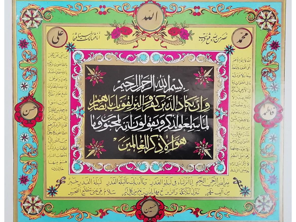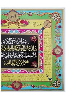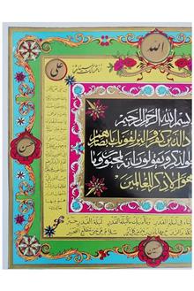 منقش به نام پنج تن و اسماءالله با تزئینات تذهیب اسلامی و سوره های قرآنی