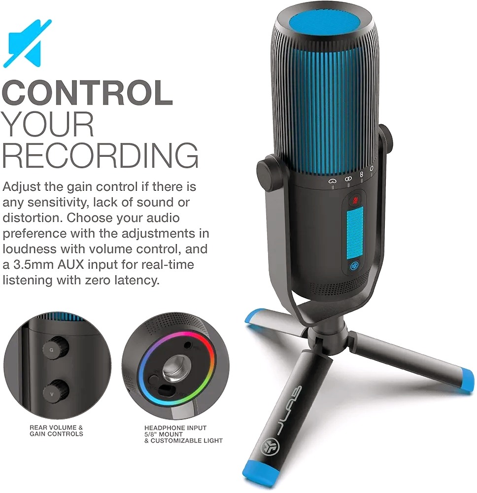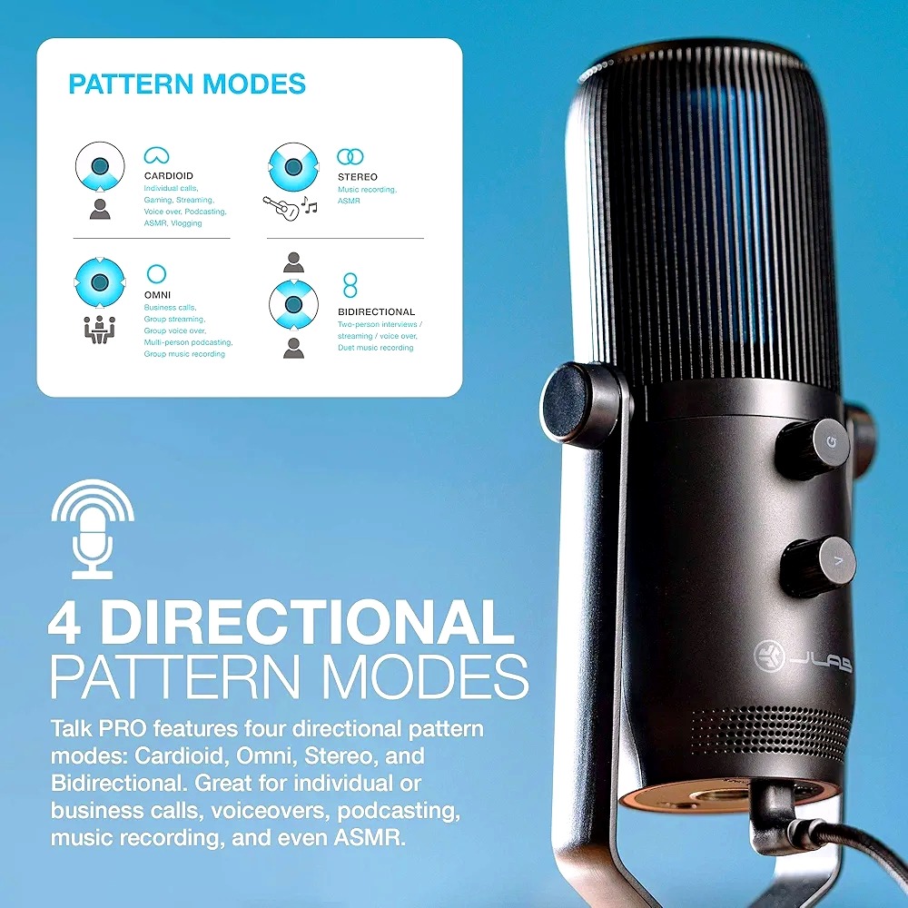 میکروفون USB JLab Audio Talk Pro قابل اتصال به کامپیوتر، کیفیت استودیویی حرفهای، وضوح 4 الگوی قطبی، کنترل صدا، بیصدا پادکست میکروفون استریمینگ