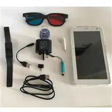 اقلام همراه: قاب ژله ای، پاوربانک 8000 میلی آمپر، قلم، انگشتی نگهدارنده تبلت، عینک 3 بعدی، ساعت دیجیتال، ایرپاد، شارژر، otg