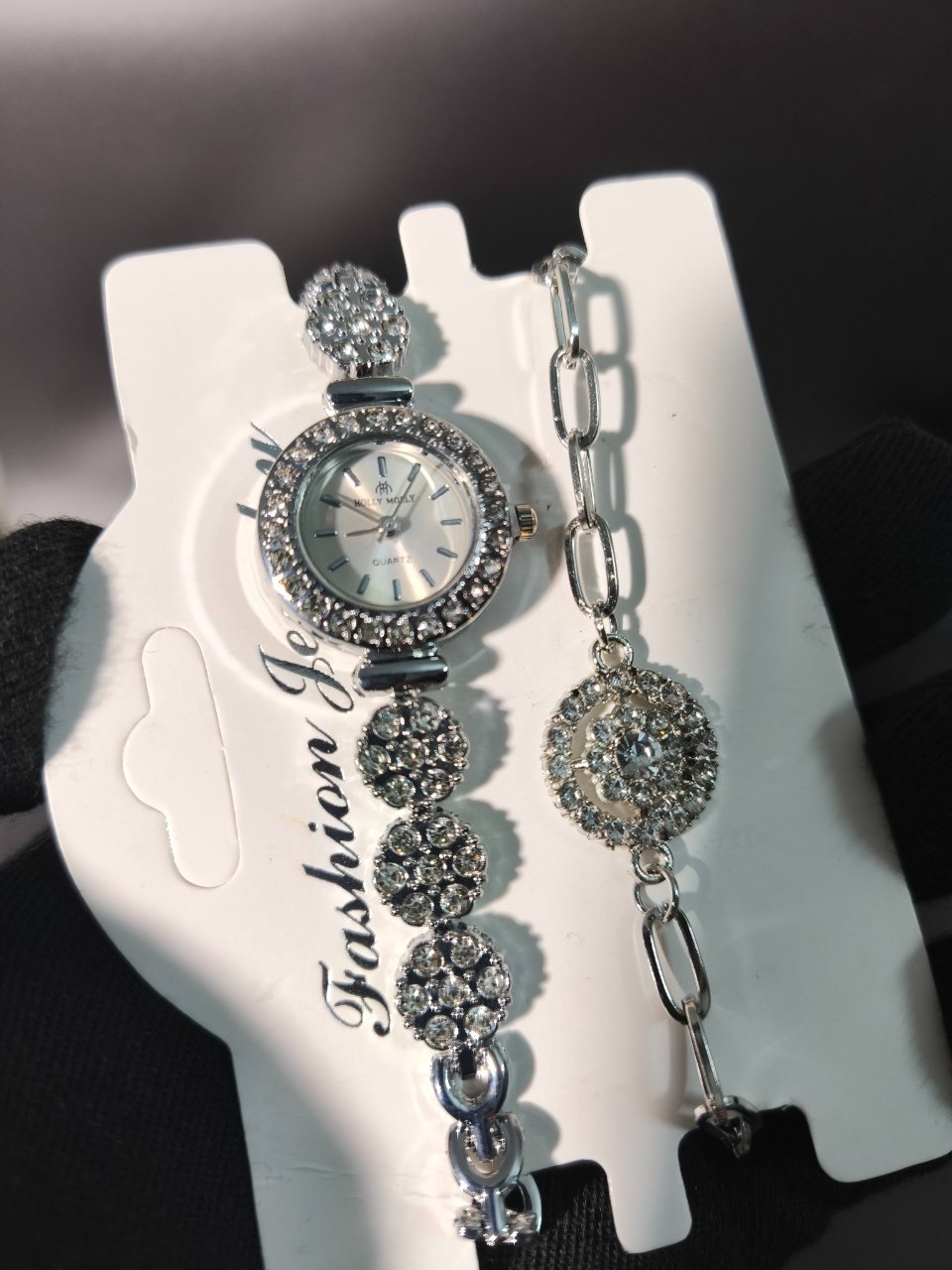 ست ساعت و دستبند دخترانه نگینی برند هولی مولی طرح خورشید با طراحی یونانی و قاب نگینی طرح بند الماسی همراه با بند فلزی نگین کاری و قفل دستبندی انتخابی شیک و مجلسی برای استایل خاص شماست این محصول جذاب را همین حالا از فروشگاه اینترنتی روبی مد تهیه کنید با کیفیت ساخت عالی و جزئیات ظریف طراحی شده تا جلوهای درخشان و ماندگار به تیپ شما ببخشد ترکیب لوکس و مدرن این ست جلوهای متفاوت و خاص در مهمانیها و مجالس ایجاد میکند.