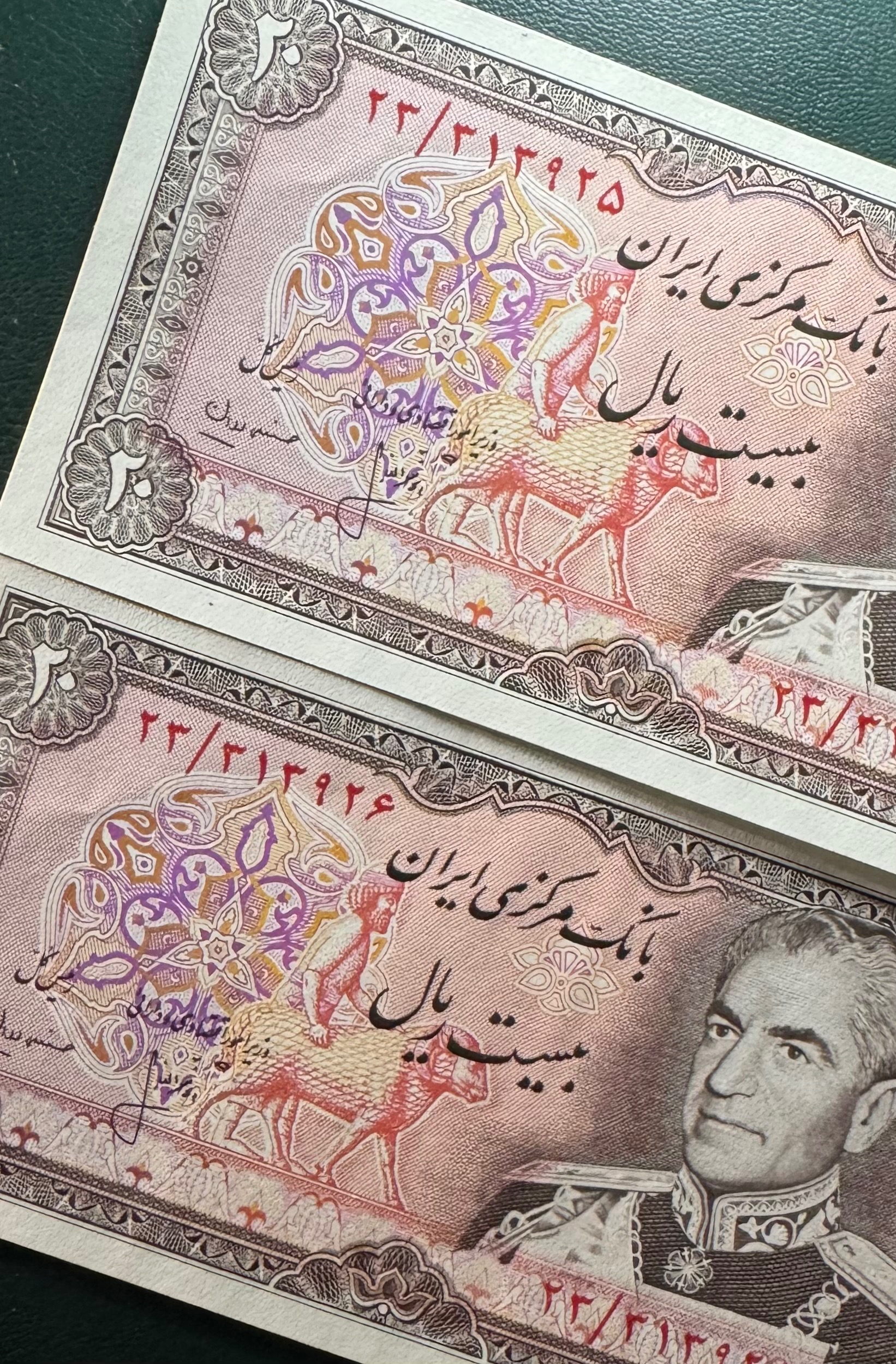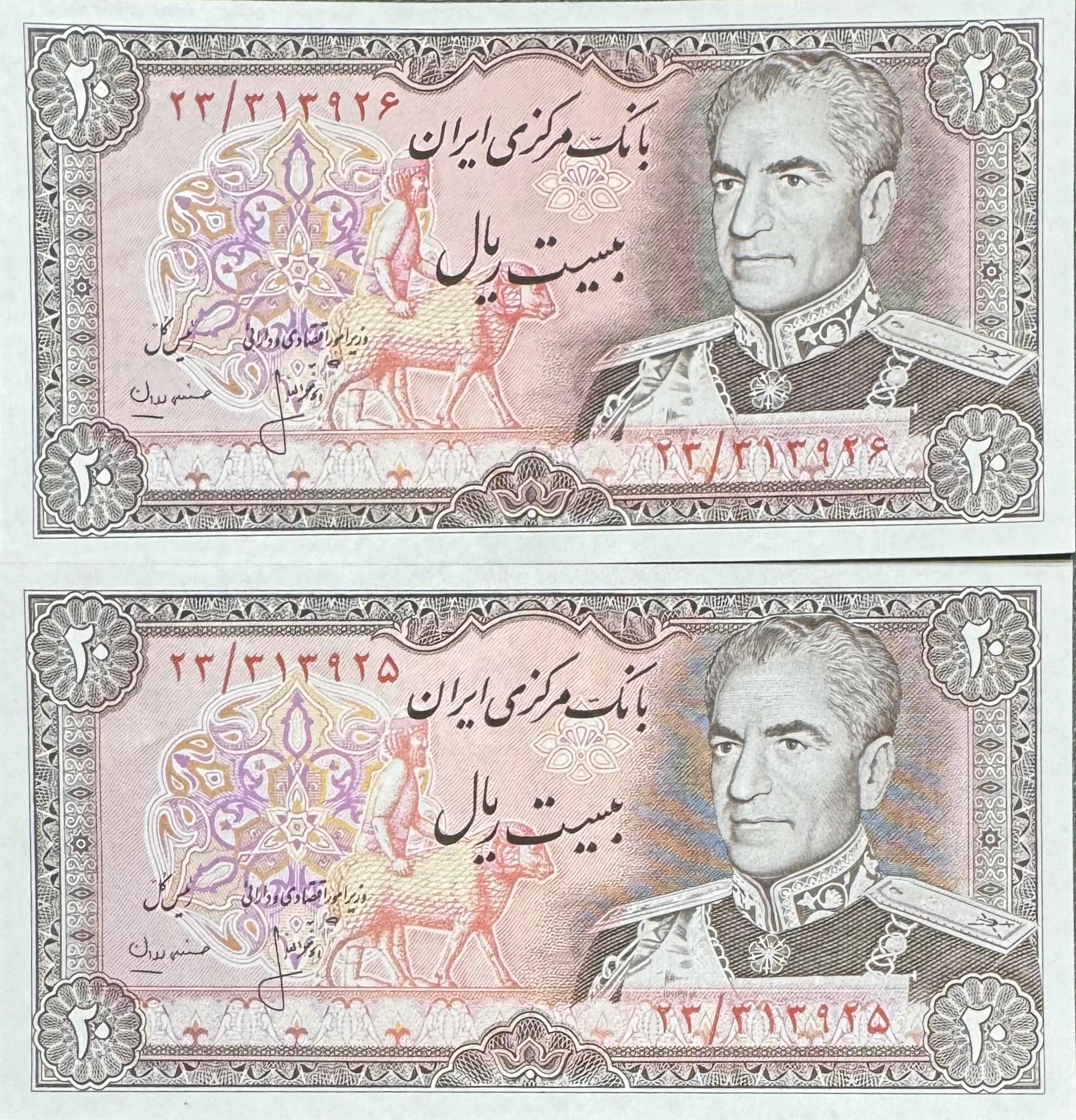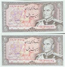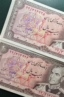 جفت 20 ریال پهلوی (ریال فشرده تر و پرفیکس 23 ) کیفیت : بانکی سری : سیزدهم سال انتشار 1354 عکس روی اسکناس : تصویر محمد رضا پهلوی و پشت اسکناس : تصویر سد امیر کبیر