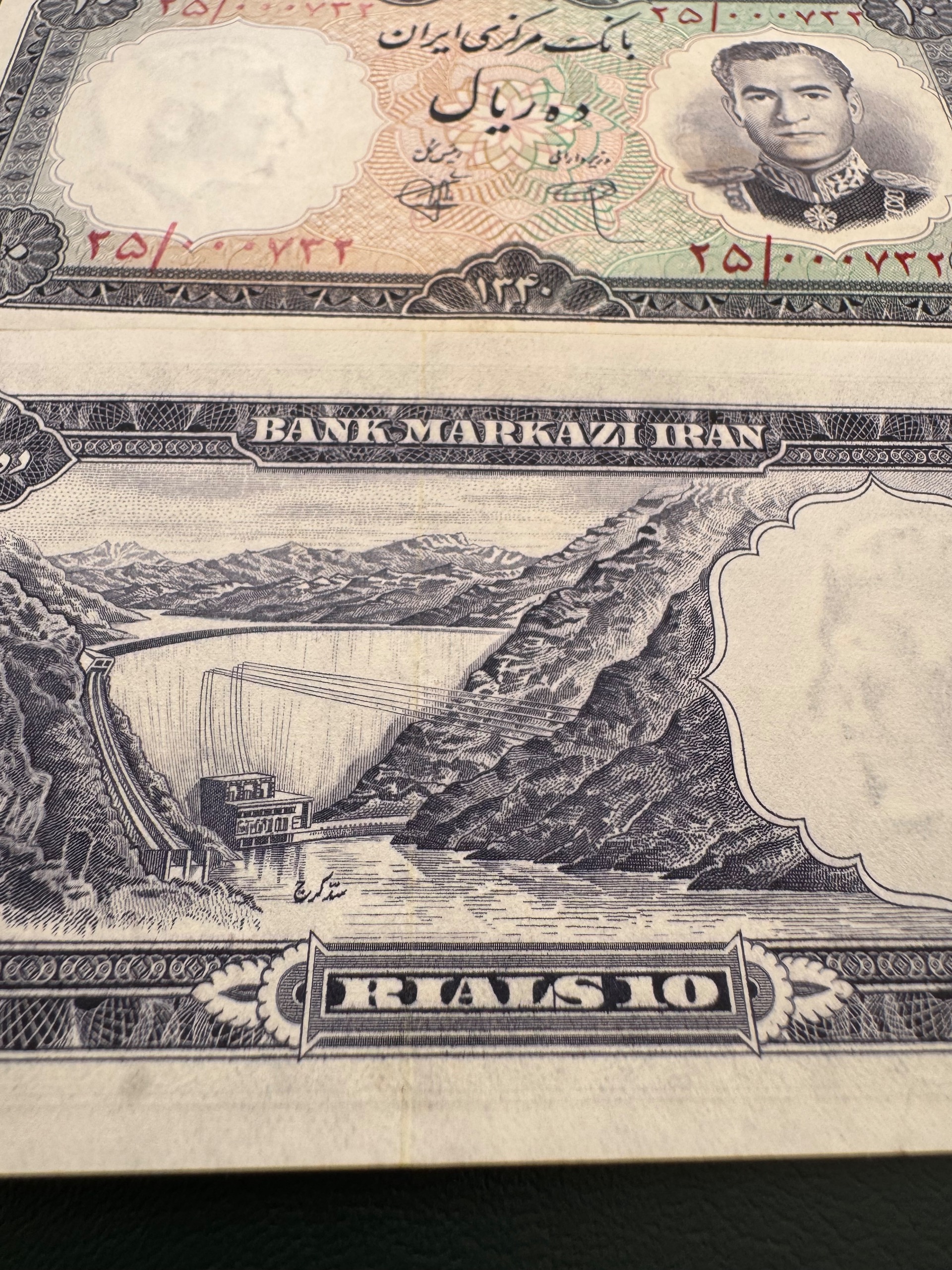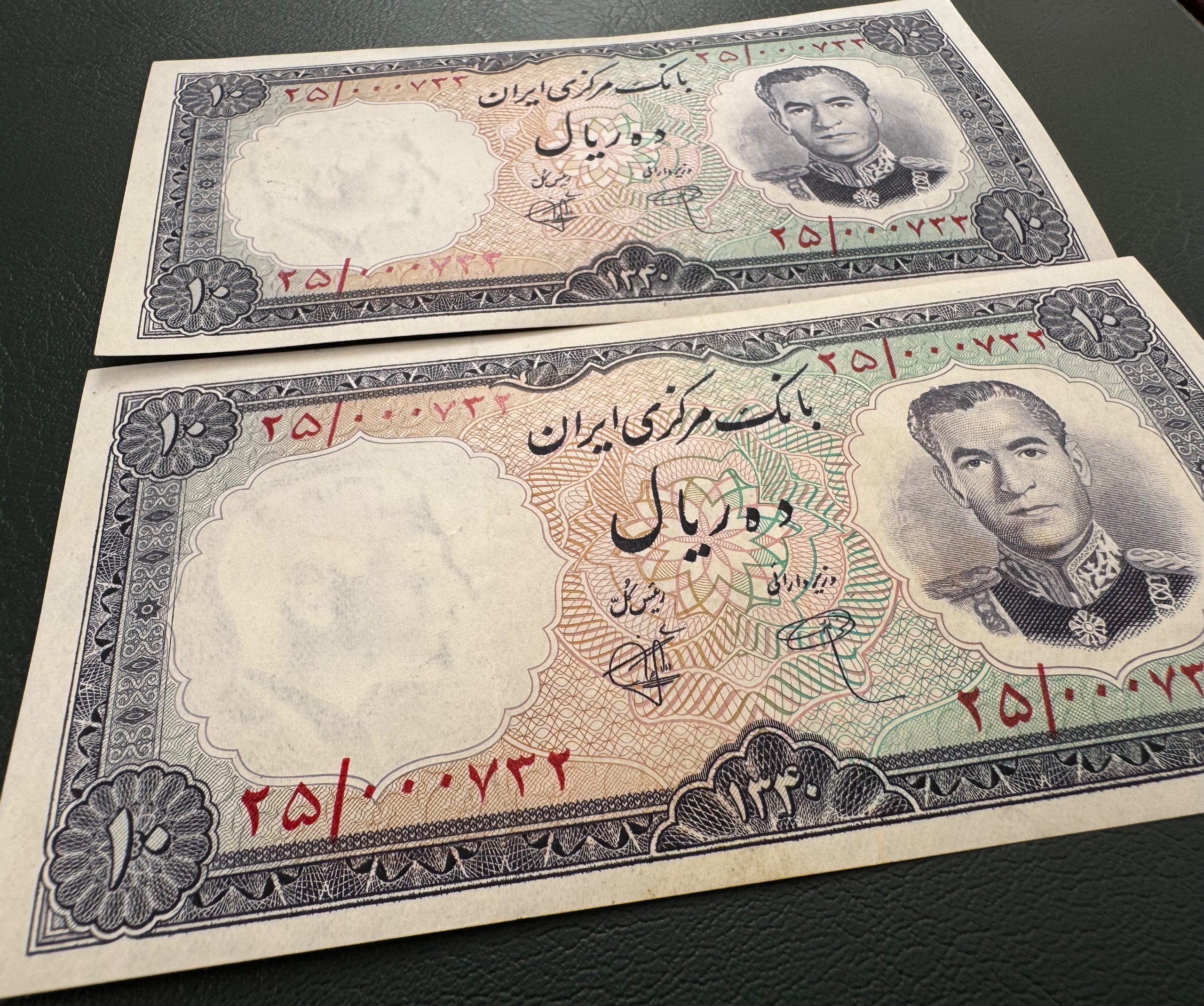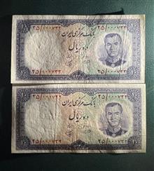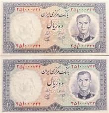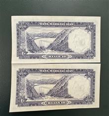 جفت 10 ریال 1340 کیفیت : بانکی بدون شتسشو وپرس سری : اول سال انتشار: 1340 روی اسکناس : تصویر محمد رضا پهلوی و پشت اسکناس : سد کرج
