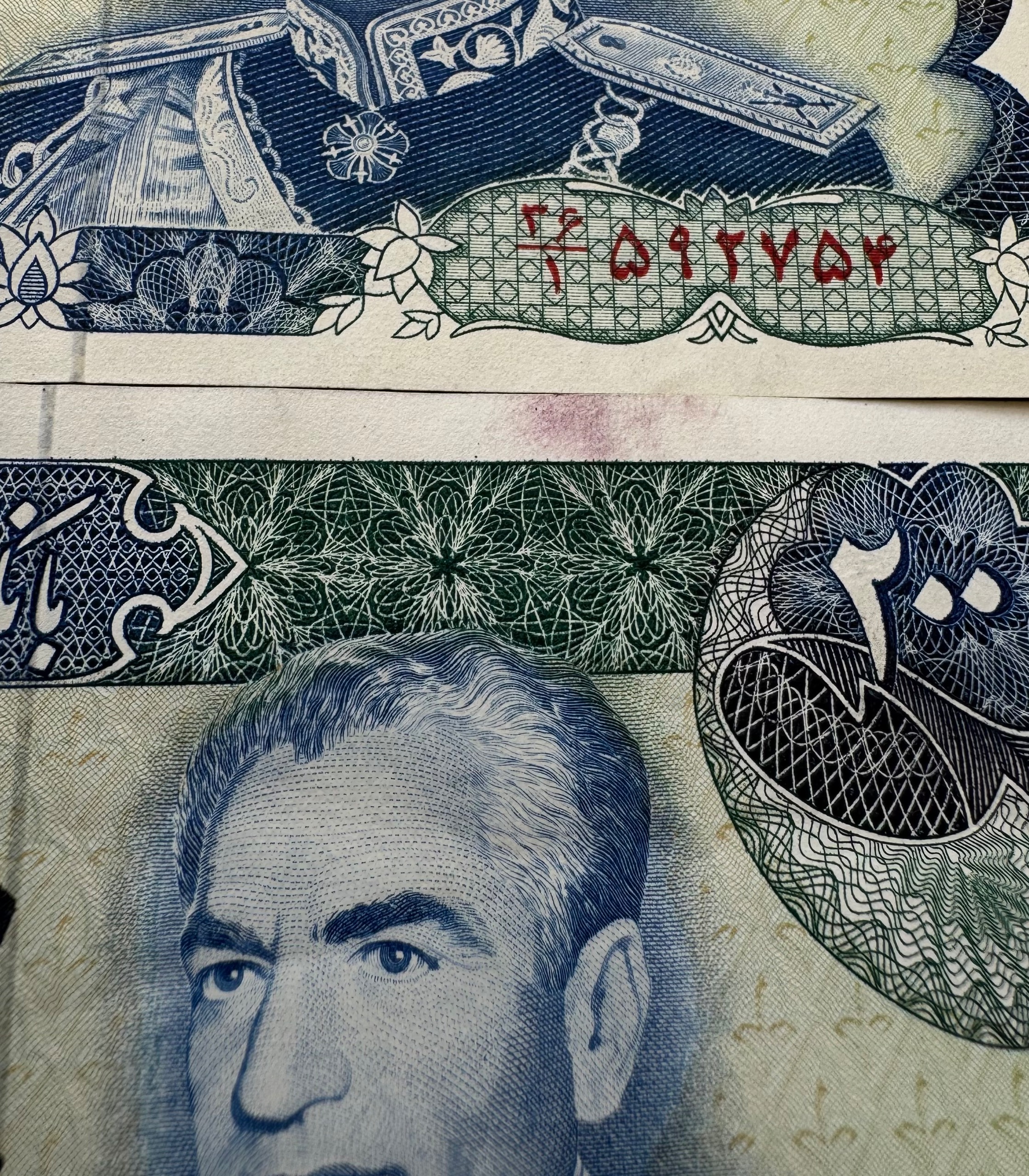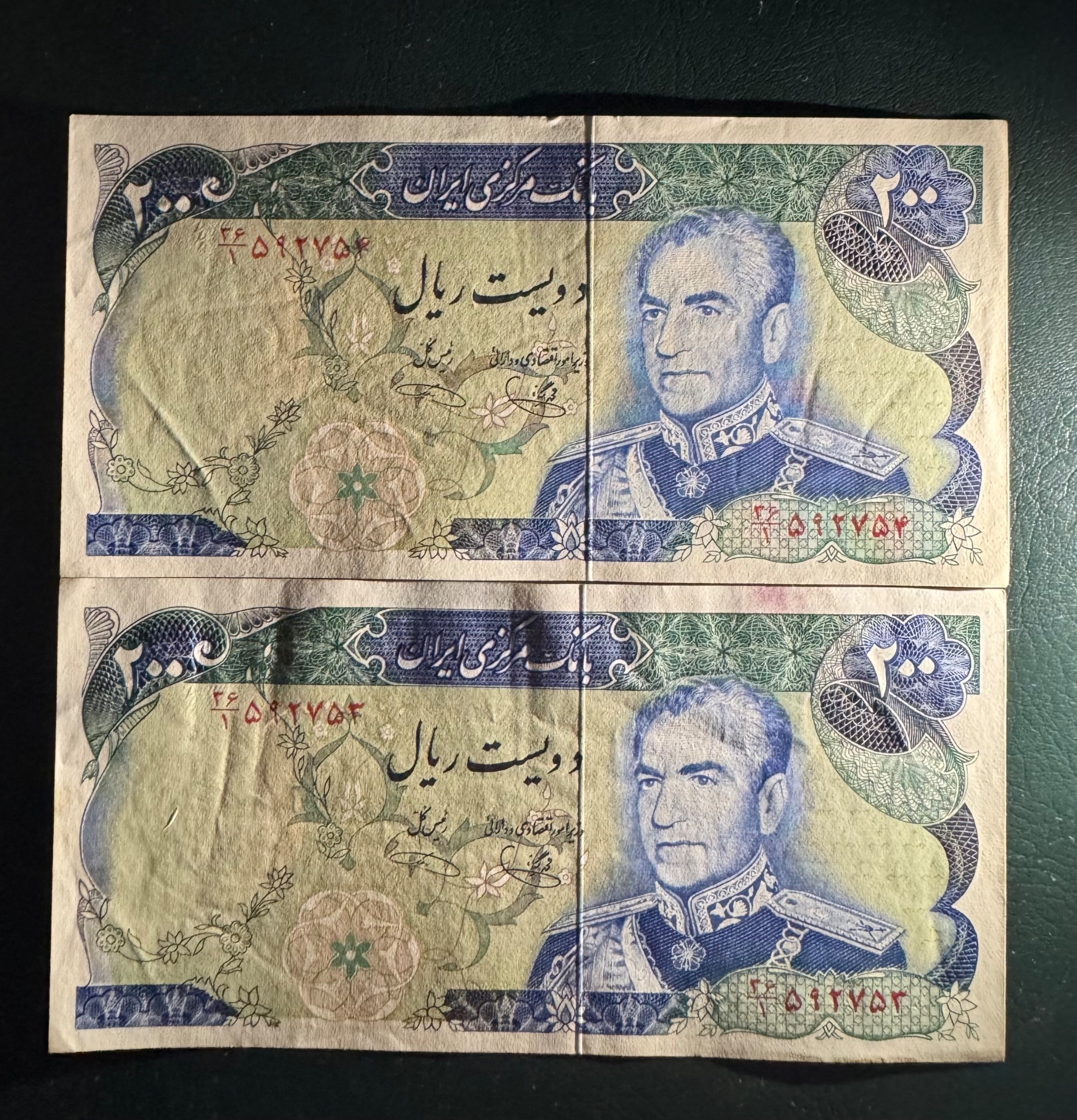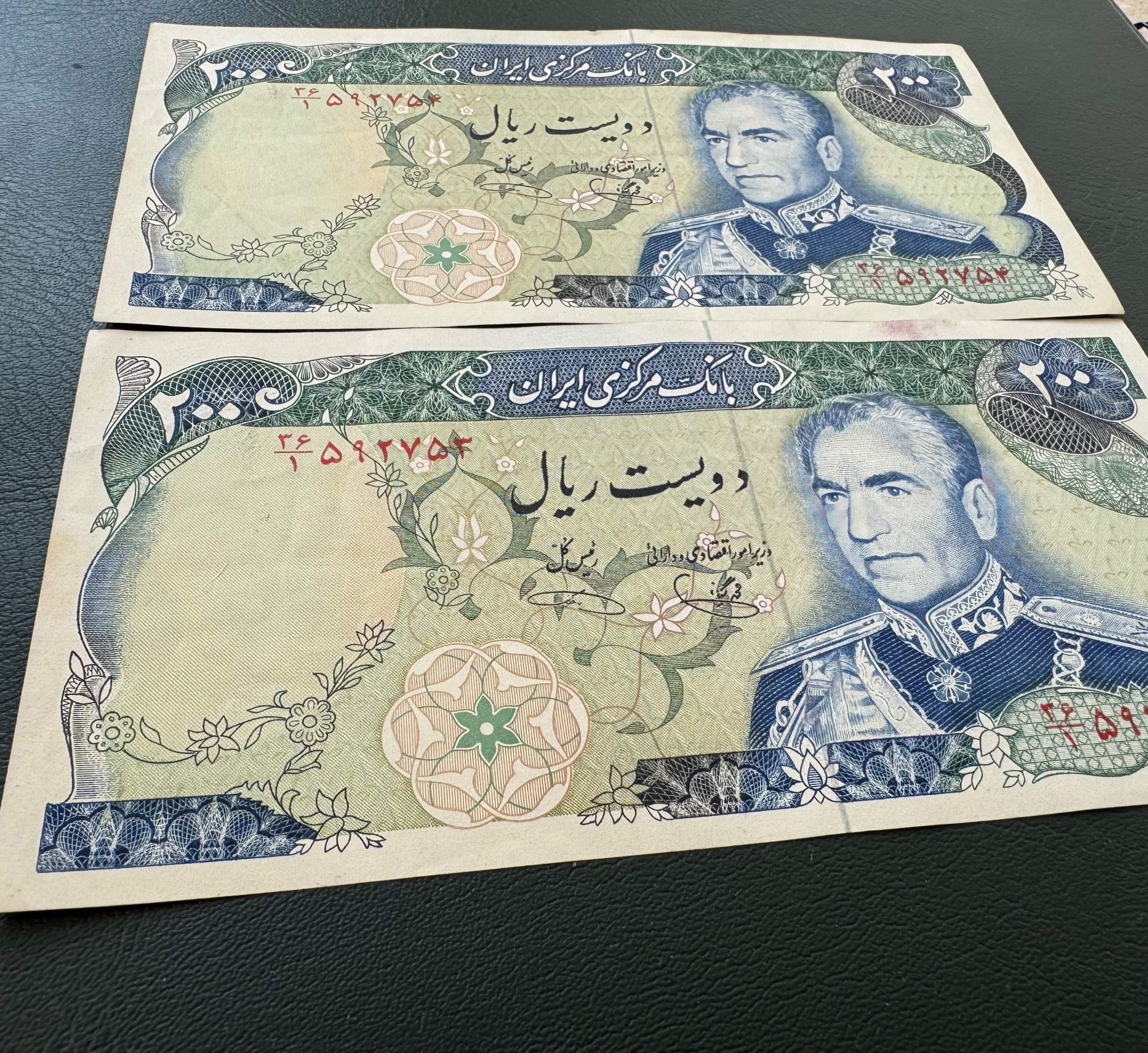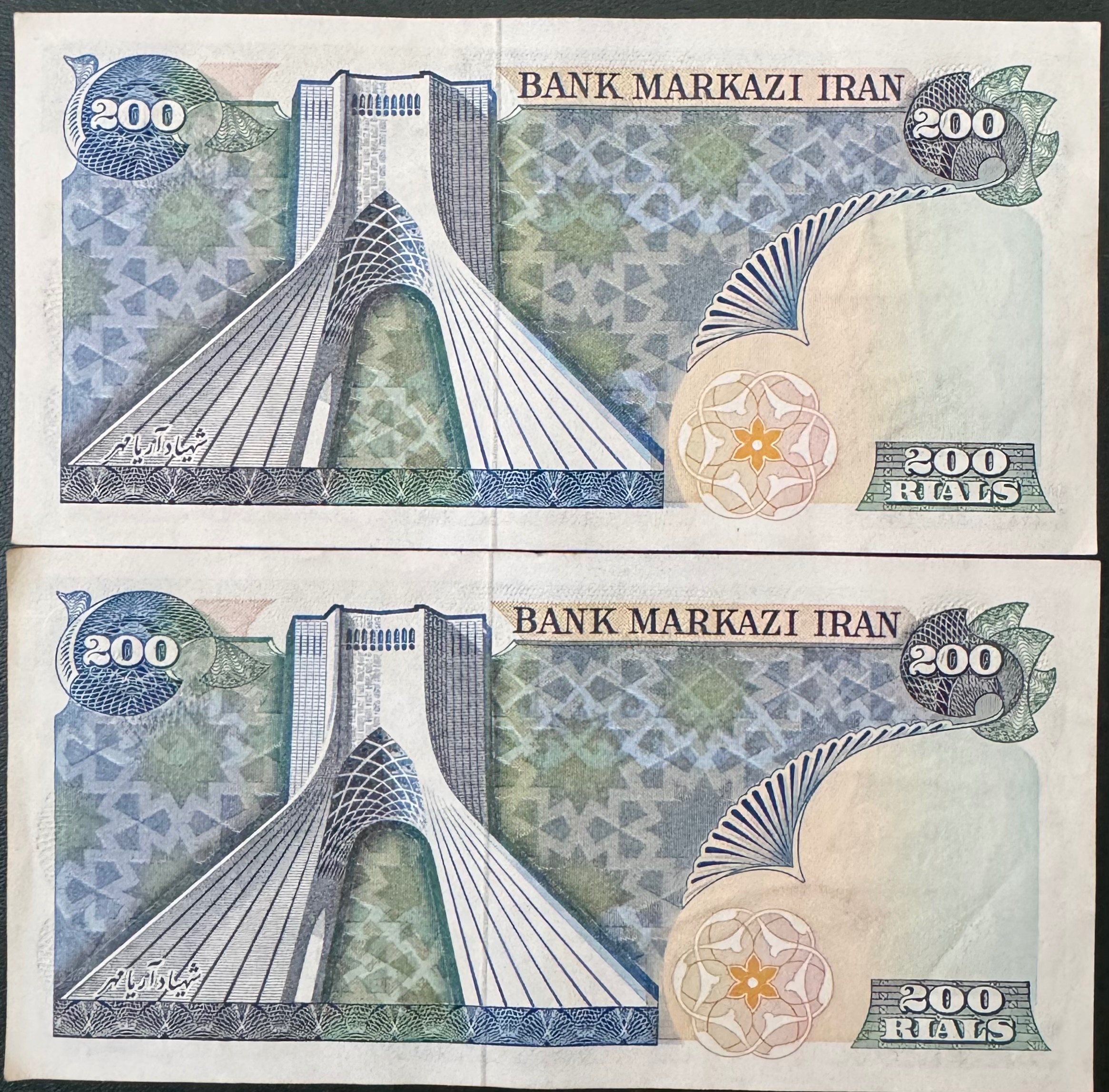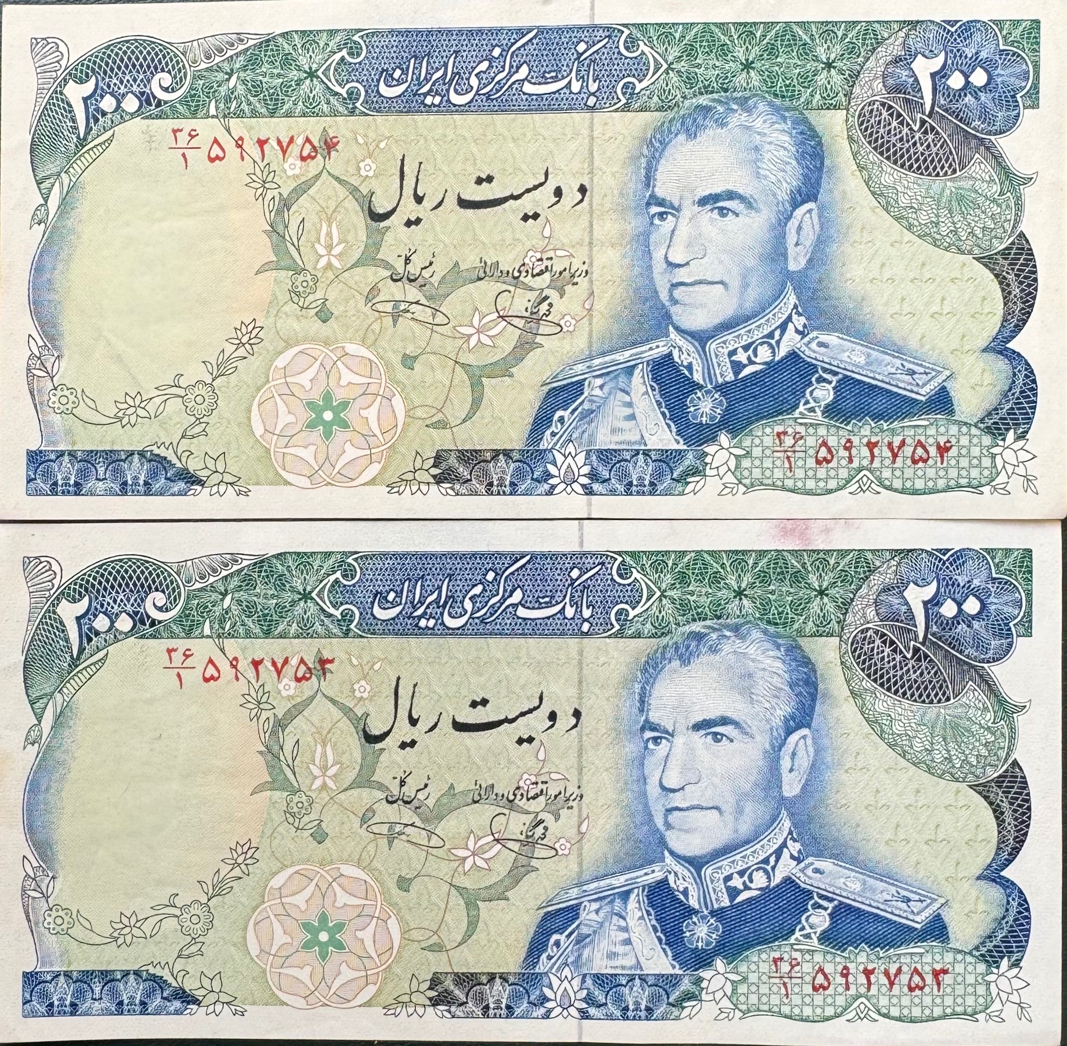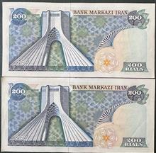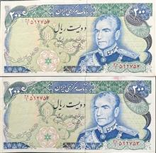جفت 200 ریال یگانه و خوش کیش کیفیت بانکی ( چند شکستگی جزعی و رنگ جوهر خود اسکناس ) بدون شتسشو وپرس سری پانزدهم سال انتشار 1355 روی اسکناس : تصویر محمد رضا پهلوی و پشت اسکناس : برج آزادی نوشته شهیاد آرامهر