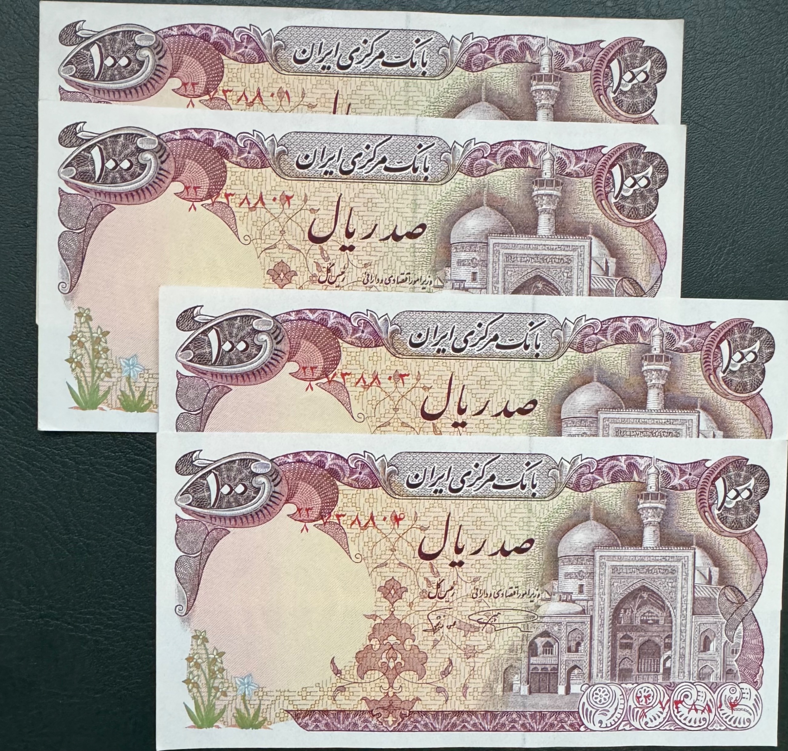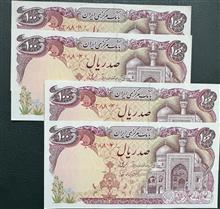 2 جفت 100ریال بارگاهی کیفیت : بانکی بدون شتسشو وپرس سری : ششم تاریخ انتشار : 1358 روی اسکناس : بارگاه امام رضا پشت اسکناس : مدرسه چهار باغ اصفهان چاپ : توماس دلارو. انگلستان