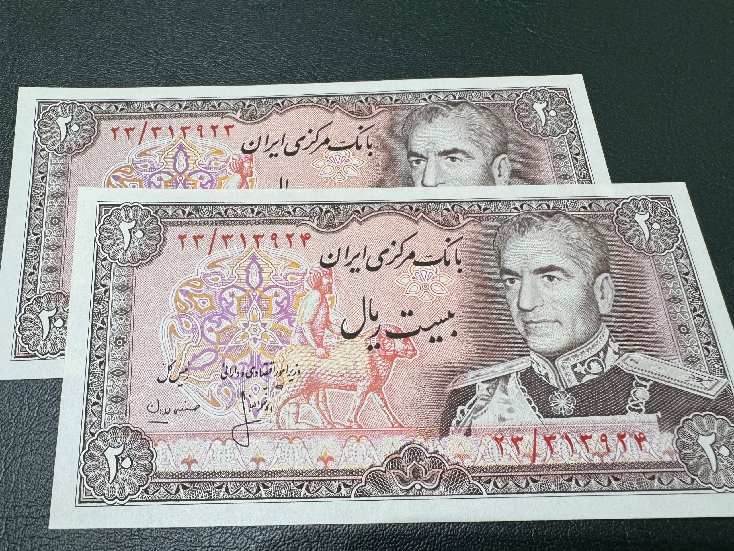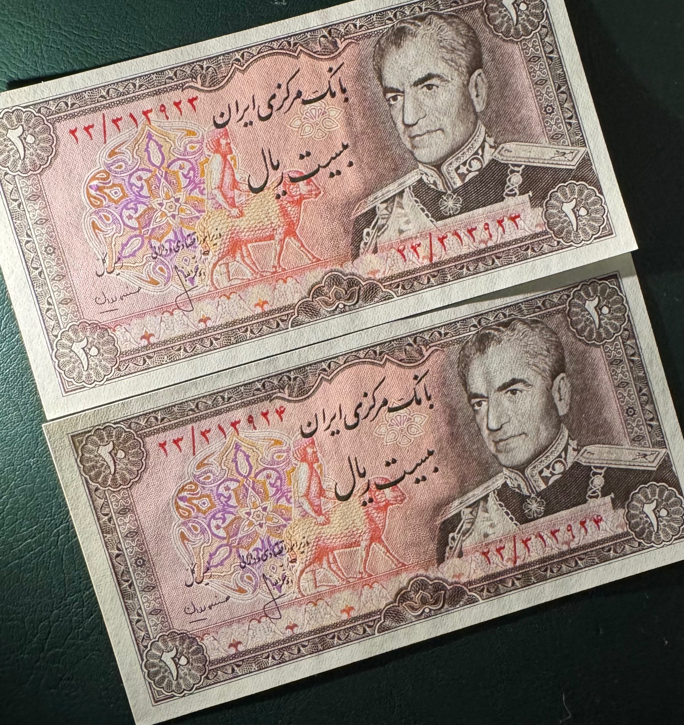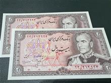 جفت 20 ریال پهلوی (ریال فشرده تر و پرفیکس 23 ) کیفیت : سوپر بانکی سری : سیزدهم سال انتشار 1354 عکس روی اسکناس : تصویر محمد رضا پهلوی و پشت اسکناس : تصویر سد امیر کبیر