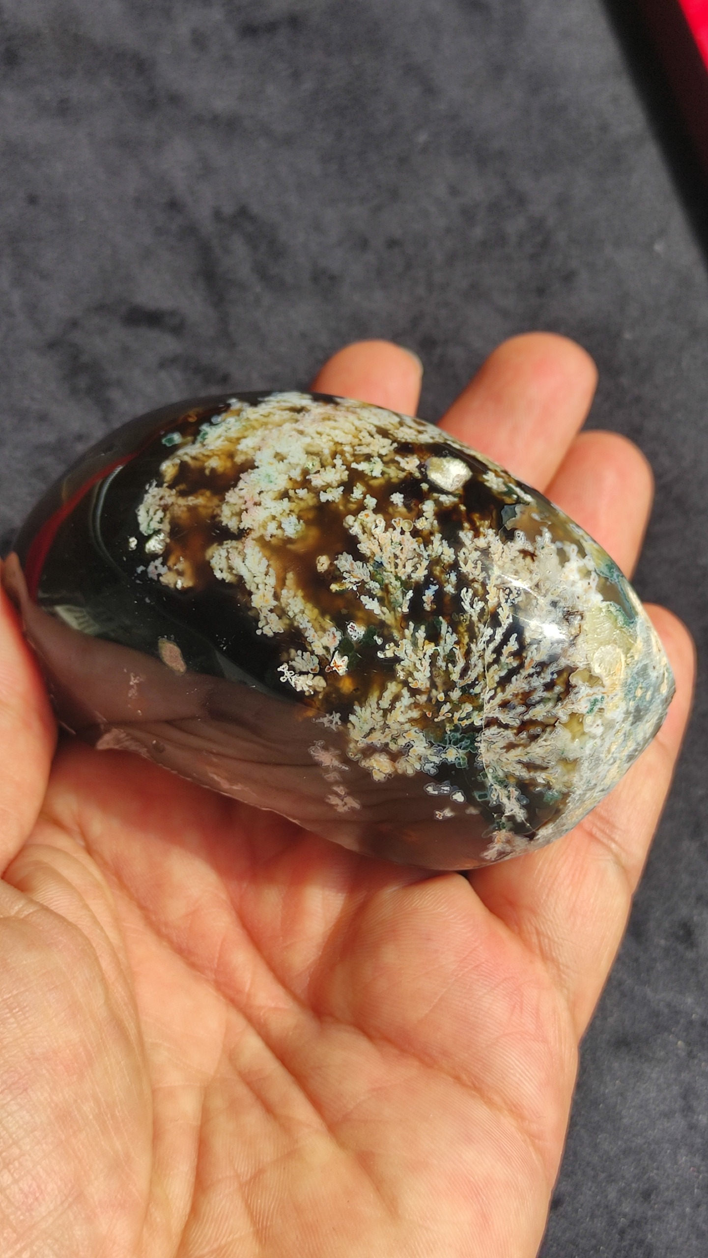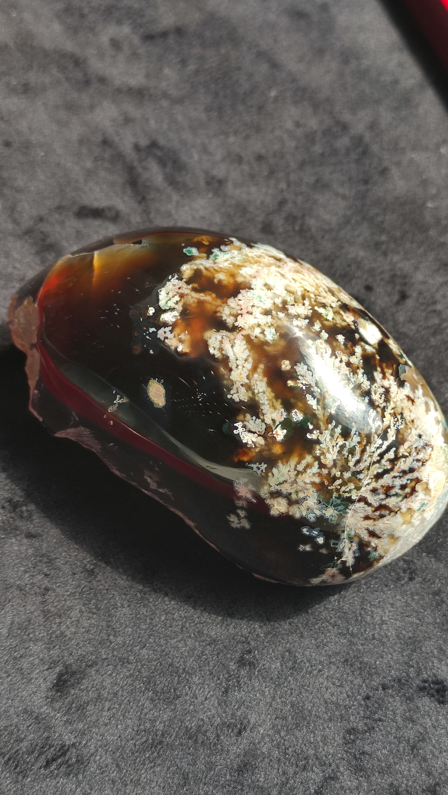 سنگ توپی راف عقیق شجر بهاری زمینه دودی کاملا طبیعی و معدنی استخراج شده از معادن غنی خراسان جنوبی پولیش شده نمونه ای کمیاب و منحصر به فرد از دل طبیعت مناسب کلکسیون یا تراش هدیه ای ارزشمند و ماندگار از دل طبیعت برای خودتون یا عزیزانتون وزن سنگ 306 گرم