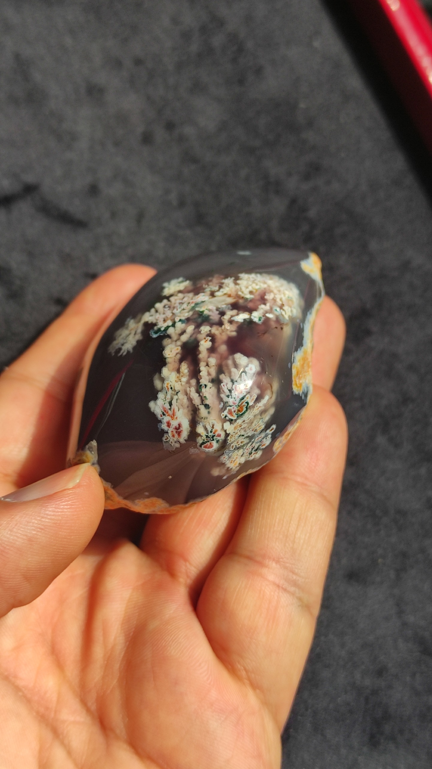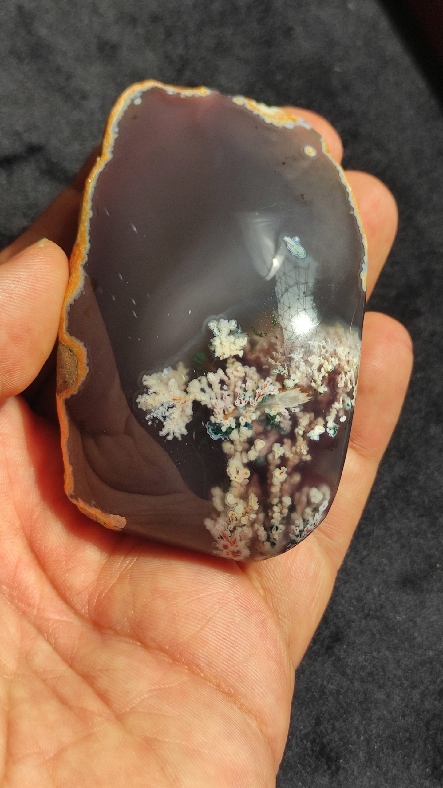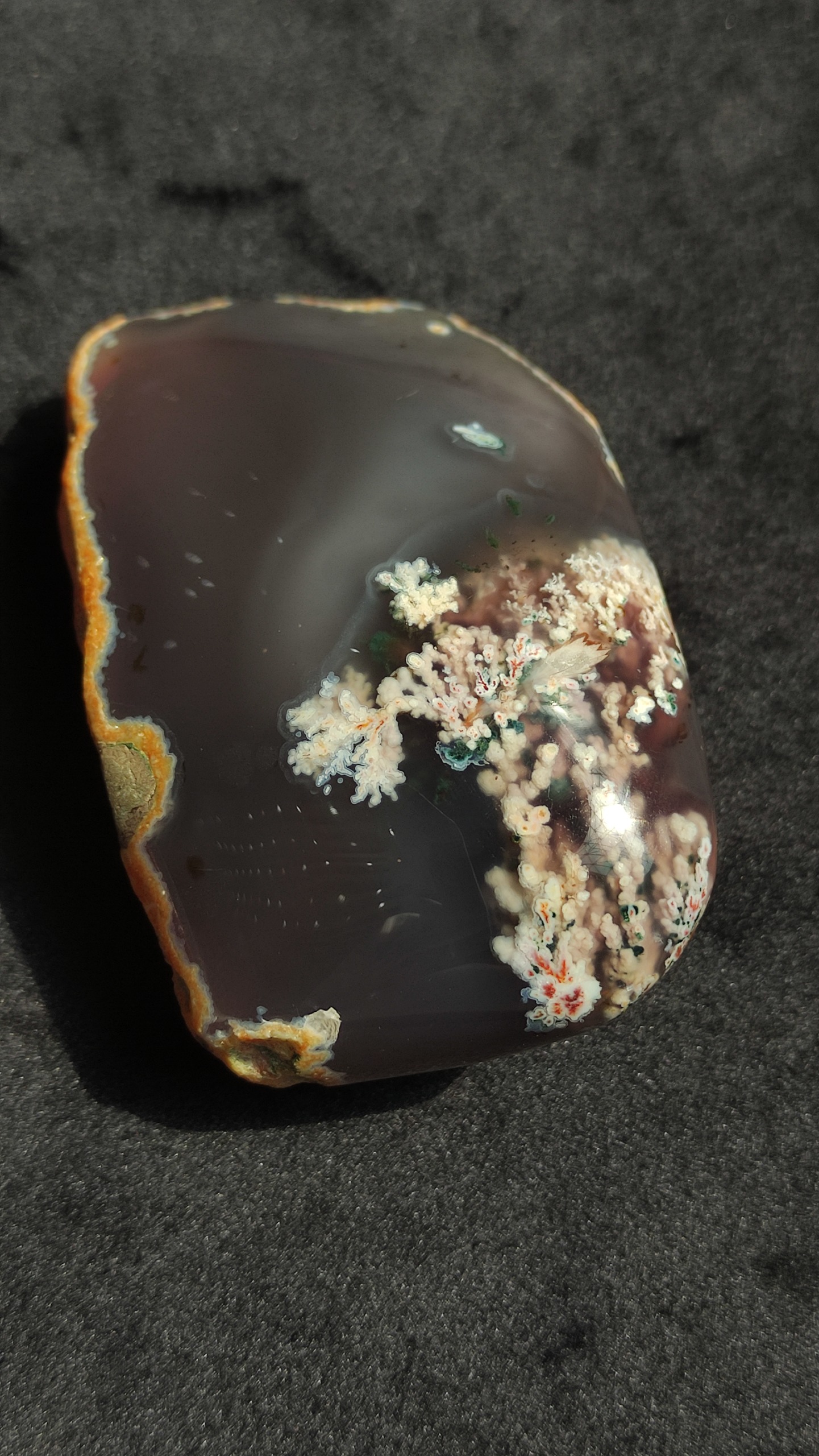سنگ راف عقیق شجر بهاری هفت رنگ زمینه سوسنی کاملا طبیعی و معدنی استخراج شده از معادن غنی خراسان جنوبی پولیش شده نمونه ای کمیاب و منحصر به فرد از دل طبیعت مناسب کلکسیون یا تراش هدیه ای ارزشمند و ماندگار از دل طبیعت وزن سنگ 167 گرم
