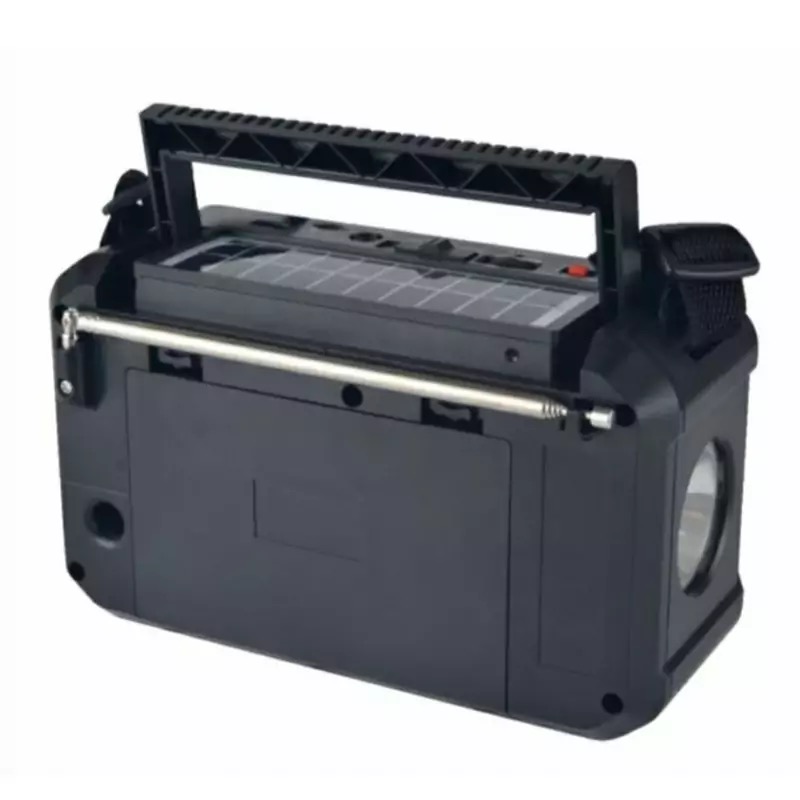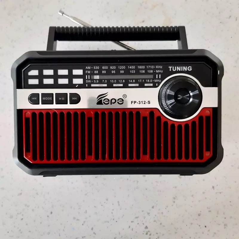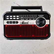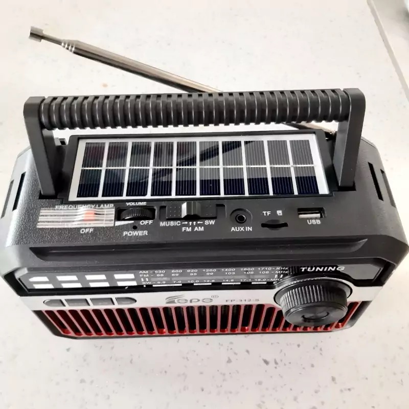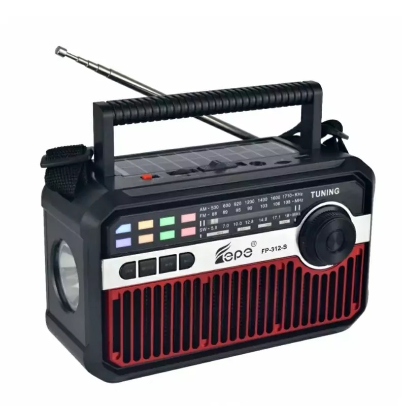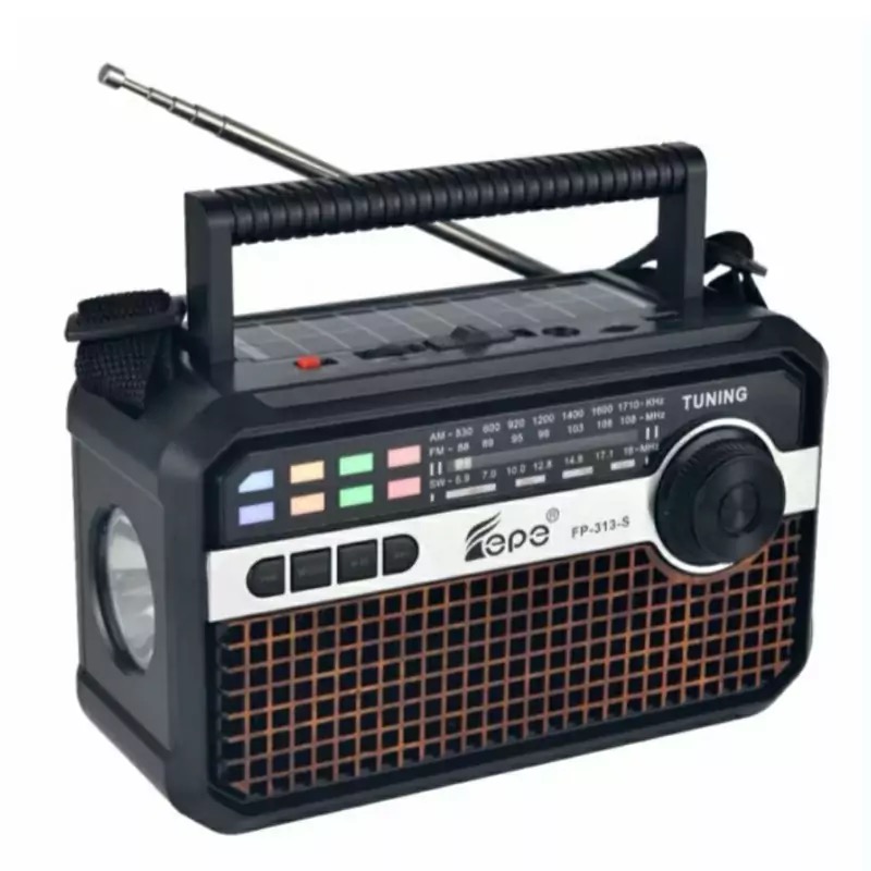رادیو و اسپیکر مارک epe مدل FP_313_S دارای درگاه USB و AUX و درگاه کارت حافظه شارژی و باتری خور و دارای پنل خورشیدی و راه ارتباطی بلوتوثی دارای چراغ قوه