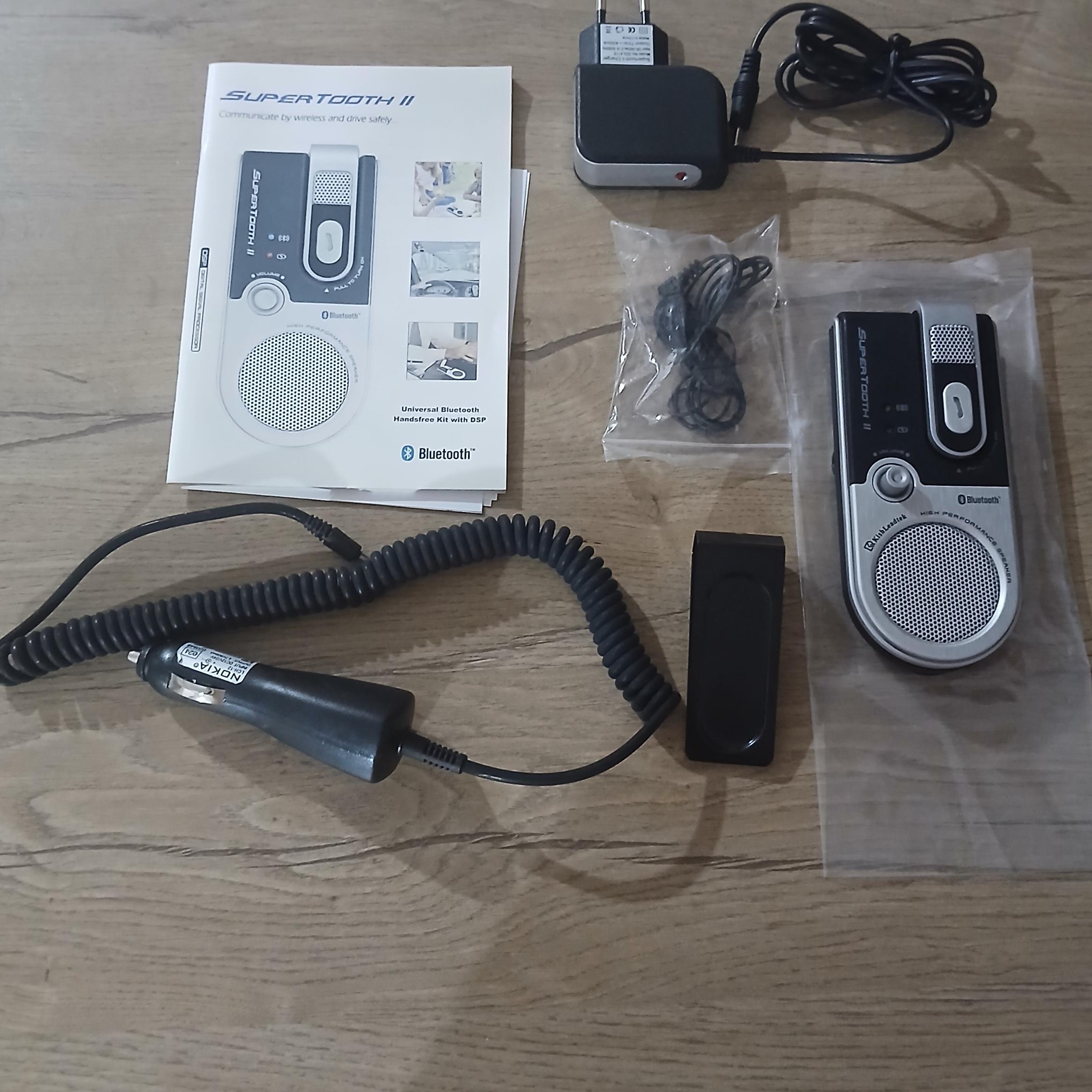 این دستگاه هندزفری بلوتوث قابل حمل BlueAnt بلندگو هندزفری Supertooth IIاز نوع کارکیت برای ماشین هست که در حد نو هست ودارای جعبه و دفترچه و هندزفری جک 2.2 و کابل فندکی ماشین و آداپتور و گیره برای جداشدن نی باشداین دستگاه سالم می باشد و از طریق بلوتوث به دستگاهها وصل میشه و رمزش چهارتا صفر می باشد که درعکس ها گذاشتم و دستگاه تست شده و کار میکنه و این دستگاه حدود 17 سال قبل هست و باتری شارژی داخلی نی باشد که سالم بوده و تست شده و ساخت کشور فلیپین می باشد