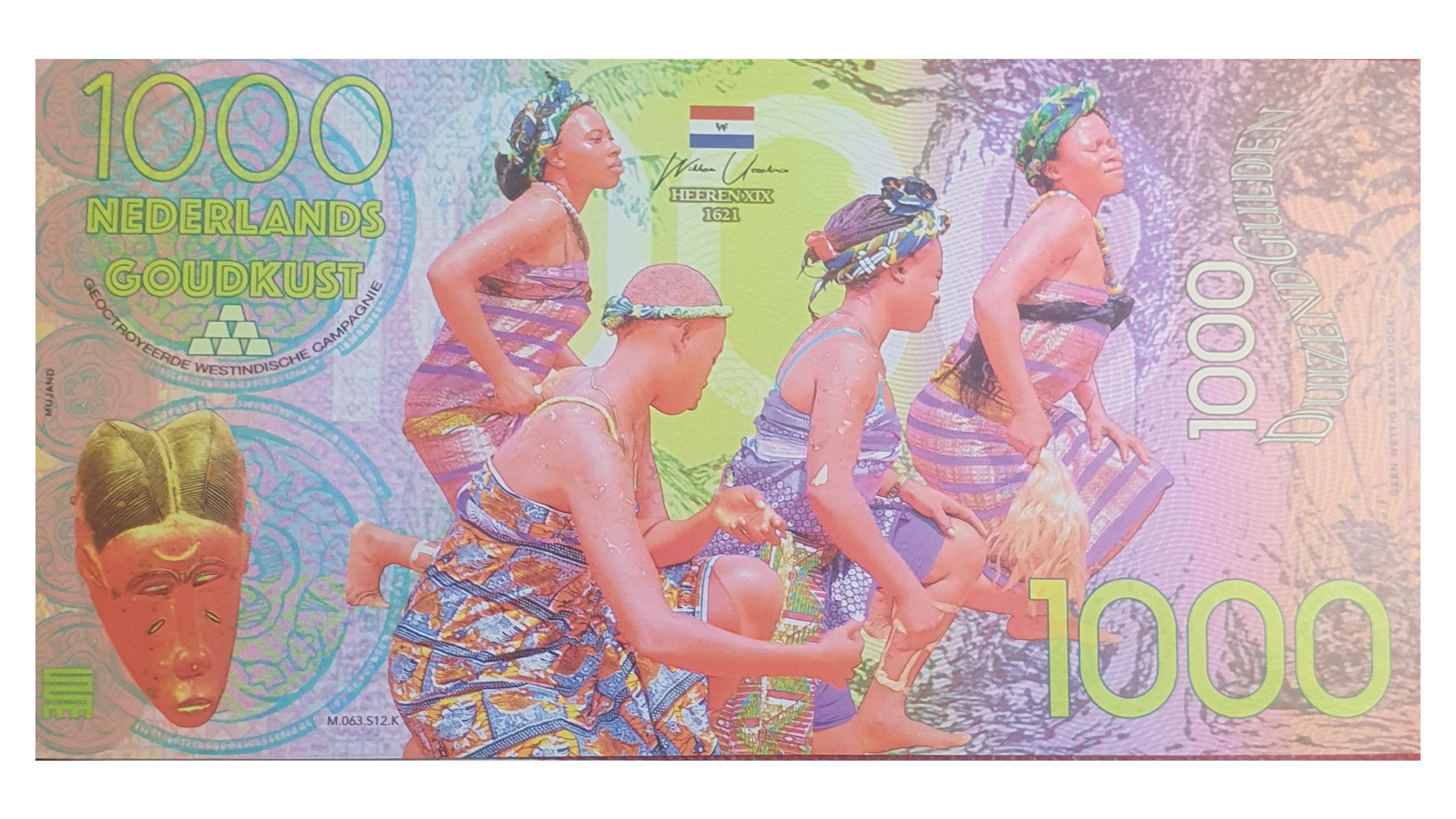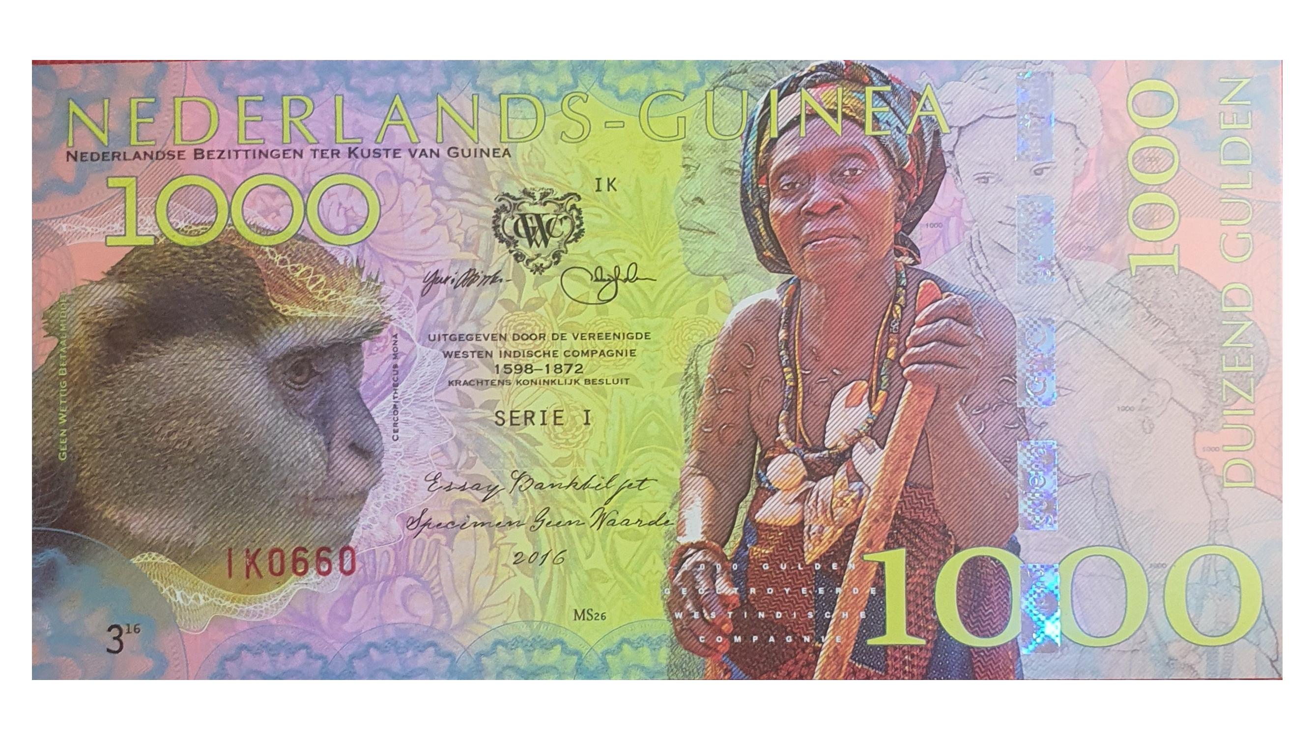 کیفیت و سریال اسکناس نایاب پلیمر از مجموعه اسکناس های فانتزی استعماری در ابعاد 83 × 165 میلی متر با الهام از دروان استعمار هلند بر گینه یا ساحل طلا (غنای فعلی) مزین به تصویر زن بومی آفریقایی ، نماد حیات وحش منطقه ، عناصر هولوگرام و چاپ پیشرفته ، رقص آئینی زنان آفریقایی ، ماسک سنتی ، پرچم هلند ، دارای شماره سریال اختصاصی در سال 2016 میلادی چاپ شده است و هدیه ای جذاب و تاریخی برای کلکسیونرها و مجموعه داران به حساب می آید و هر قطعه این اسکناس در بازار نوستالژی کلکسیون و سایت های آنلاین معتبر خارجی بین 15 تا 35 دلار ارزش دارد .