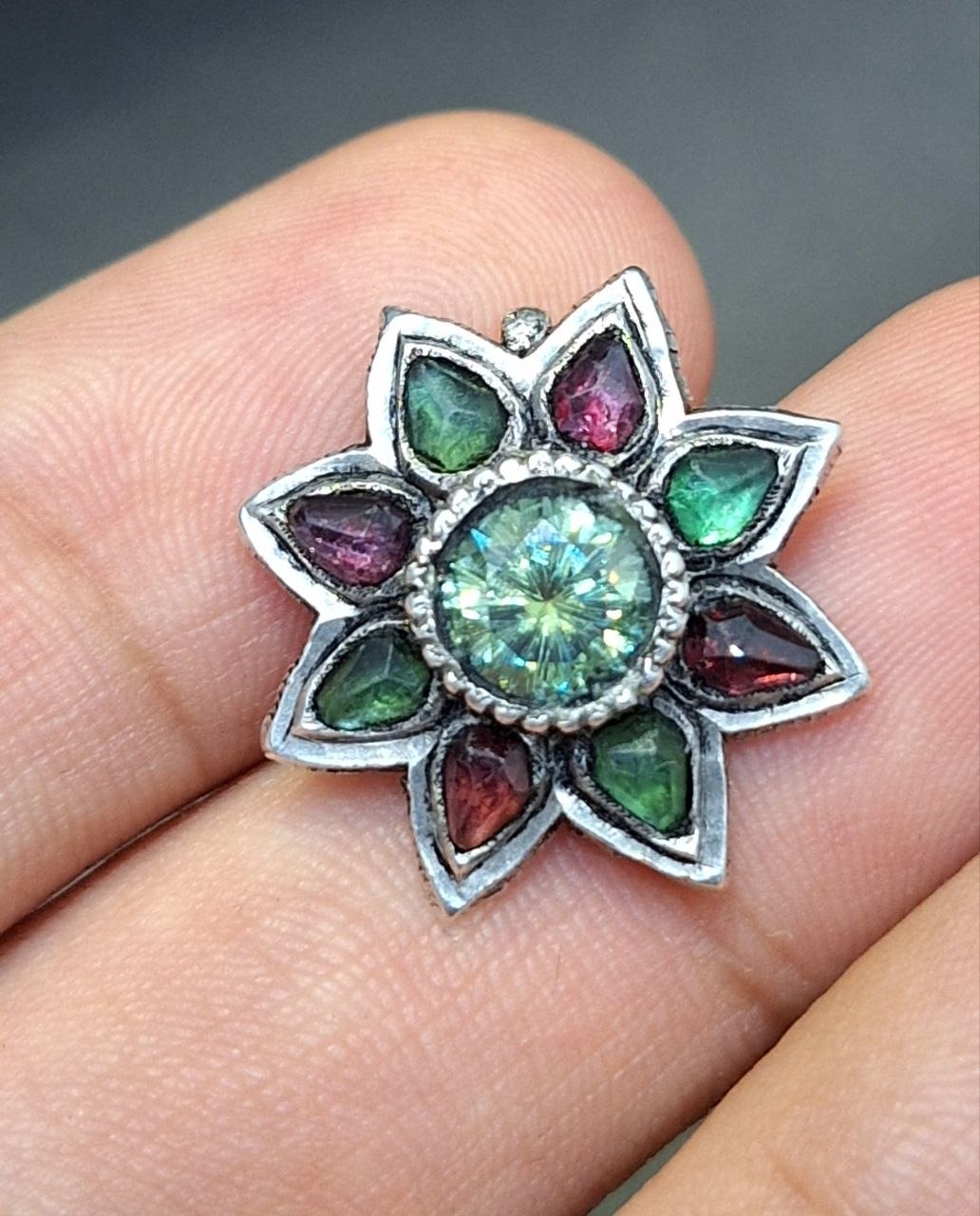 آویز قدیمی کوچک نگین وسط موزانایت با سختی فول 10 : سنگهای دور زمرد و یاقوت سنتیک طبق عکس تقدیم میشه
