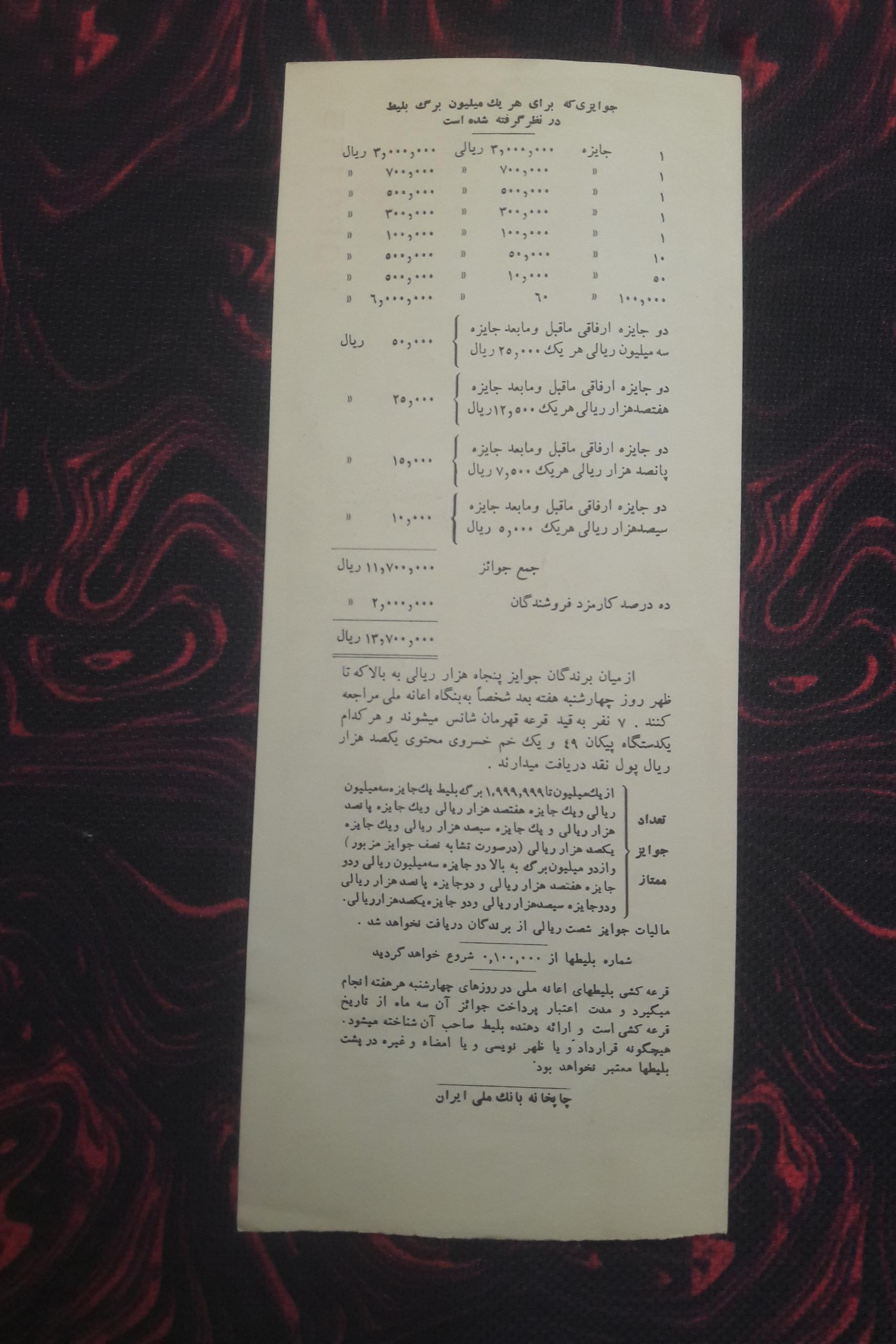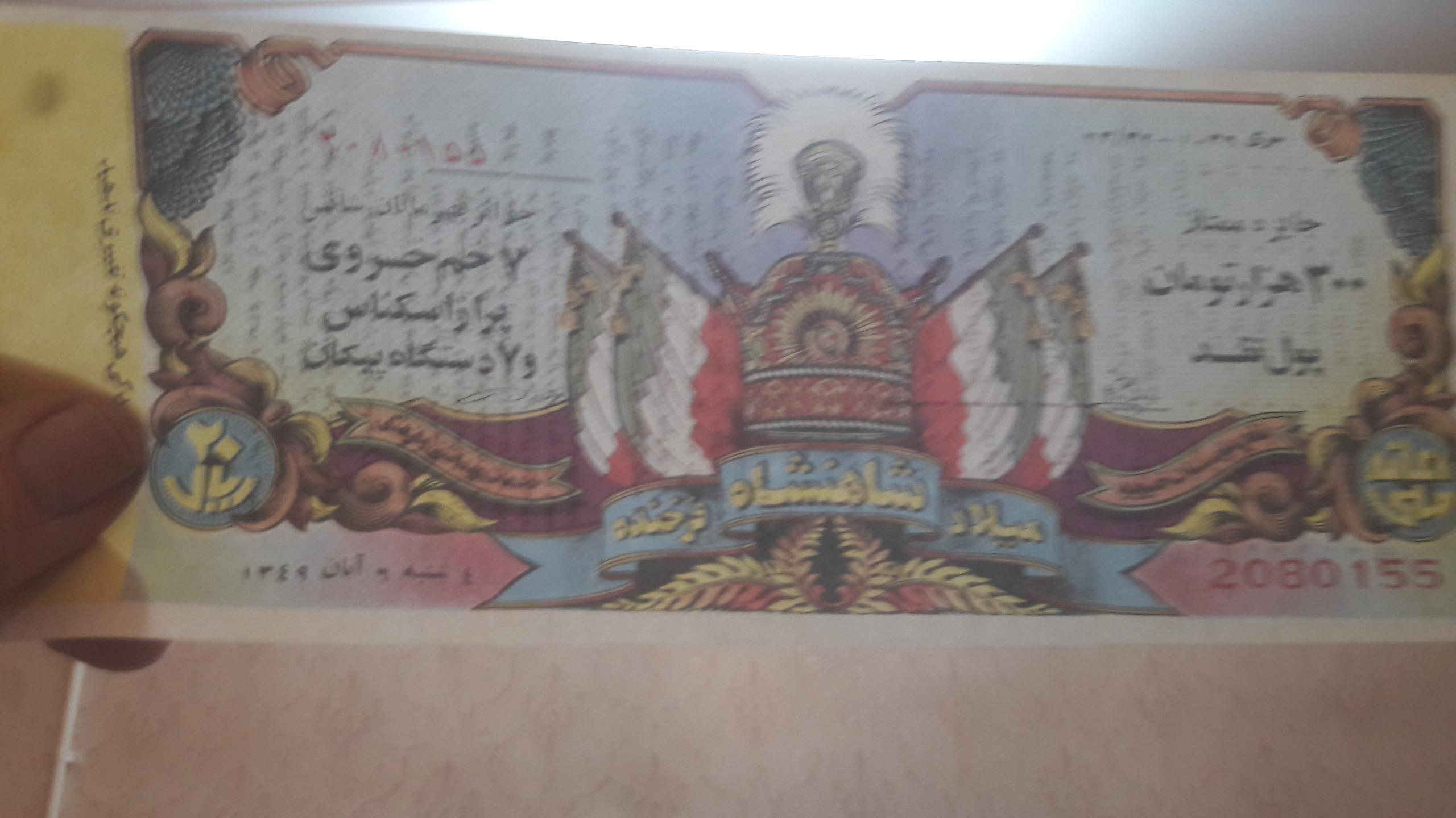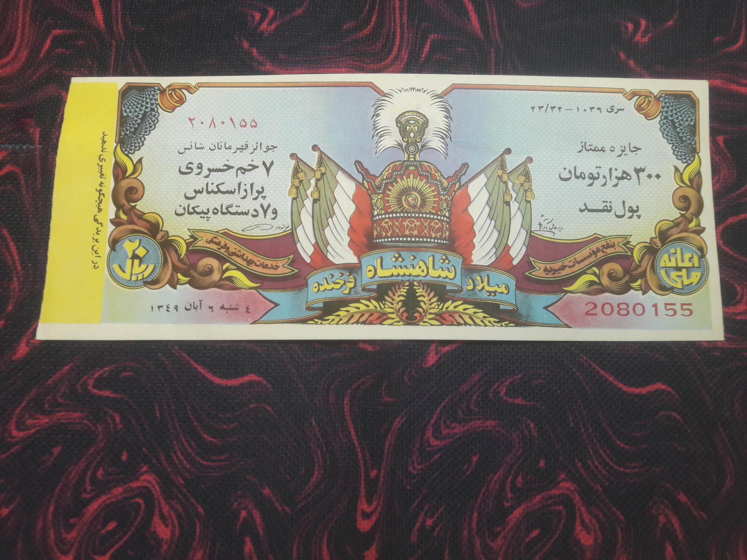 توجه:تک بلیط سایز بزرگ اعانه ملی سال1349به مناسبت میلاد شاهنشاه با جایزه ممتاز 300ملیون تومانی