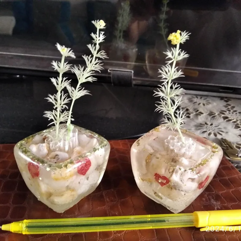 این گلدان های کوچک دکوری رزینی بسیار محکم وبارزین اپوکسی ساخته شده قسمت زیرین آن شبنما هست که وقتی که از خودش نور متصاعد کنه کل گلدان به رنگ سبز رنگ روشن میشه برای تست فلش گوشی را روشن وگلدان را چند دقیقه روی فلش بگذارید بعد به محیط تاریک منتقل کنید گلدان به رنگ سبز یا فیروزه ای روشن میشه (عکس دوم)