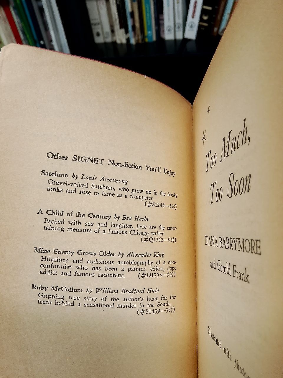 این کتاب زندگی دایانا بریمور (دختر ستاره مشهور هالیوود، جان بریمور) را به صورت بیپرده روایت میکند. موضوعات اصلی شامل: زندگی اشرافی، اعتیاد به الکل، ازدواجهای ناموفق، تلاش برای خودکشی و سقوط از اوج ثروت و شهرت است. کتاب با عکسهایی همراه است.