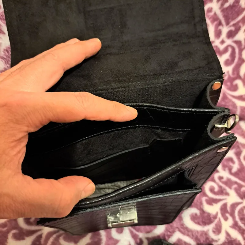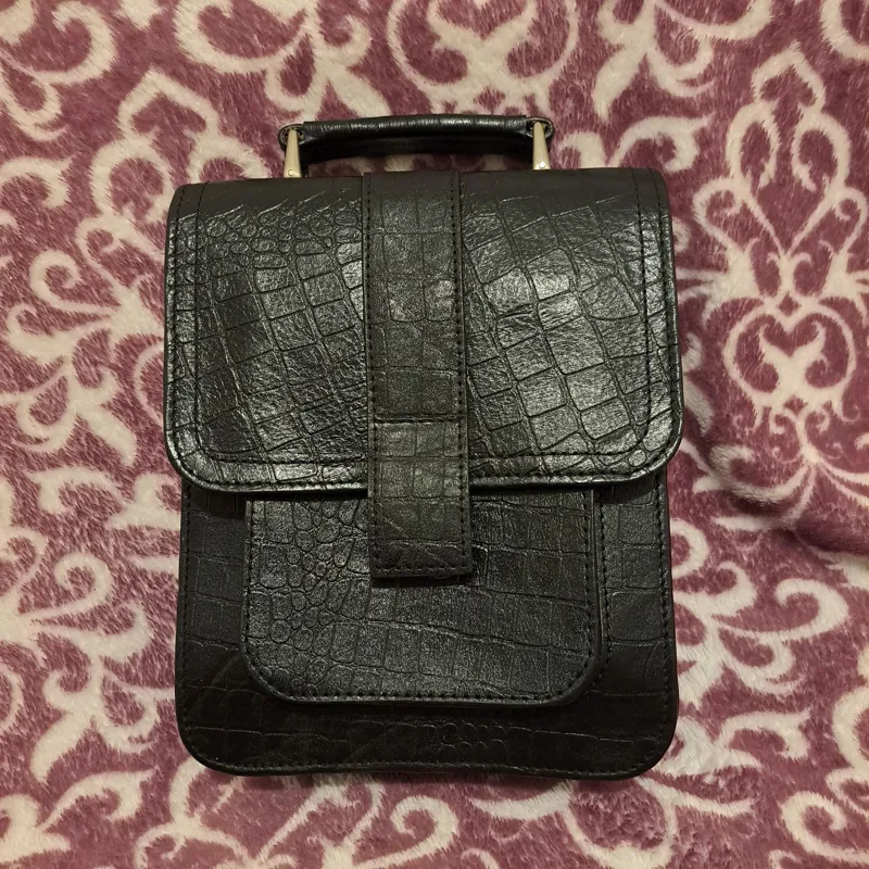 سلام . کیف چرم طبیعی دست دوز بسیار شیک و با کلاس با جیب پشت و جلو و قفل رمز دار و بند دوشی در ابعاد حدودی 25×20 سانت به رنگ مشکی . تک و خاص مشکل پسندان . سوالی داشتید در خدمتم