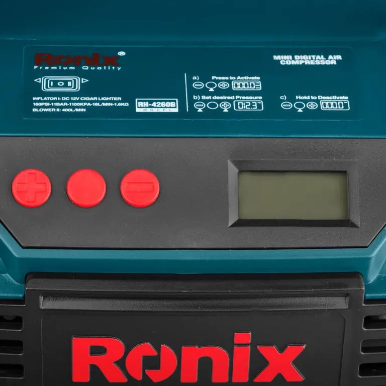 مینی کمپرسور سهکاره فندکی دیجیتال رونیکس مدلRH-4260B ، با وزن 1.6 کیلوگرمی و ابعادی جمعوجور تولید و به بازار ابزار ایران عرضه میشود.