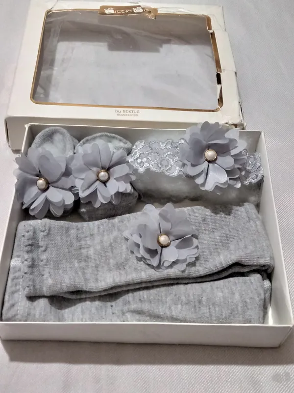 ست جوراب شلواری دخترانه شامل شلوار و جوراب کفشی و هدبند .حالت کشی.رنگ طوسی با گلهای جنس ساتن با نگین های زیبا .نو داخل جعبه.مناسب سیسمونی و استفاده روزمره و کادو .کمی گوشه کارتن به صورت جزئی پارگی پیدا کرده ولی جعبه جمع و حالت طبیعی هست.بسیار شیک .مناسب کودک 5ماه تا یک سال .کش سان.منحصر به فرد و درجه یک