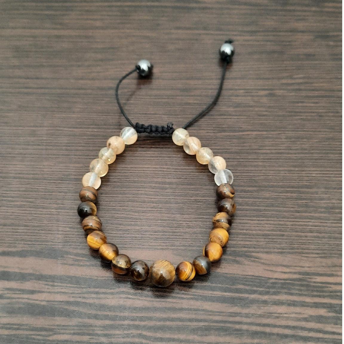 دستبند سنگ سیترین و چشم ببر تقویت کننده مراکز بدنی دوم و سوم است.ترکیب این دو سنگ خواص بسیار زیادی از جمله رفع کسلی،بالابردن انرژی بدن،سرزندگی دارد.همچنین این دستبند ثروت ساز و پیشرفت دهنده می باشد.