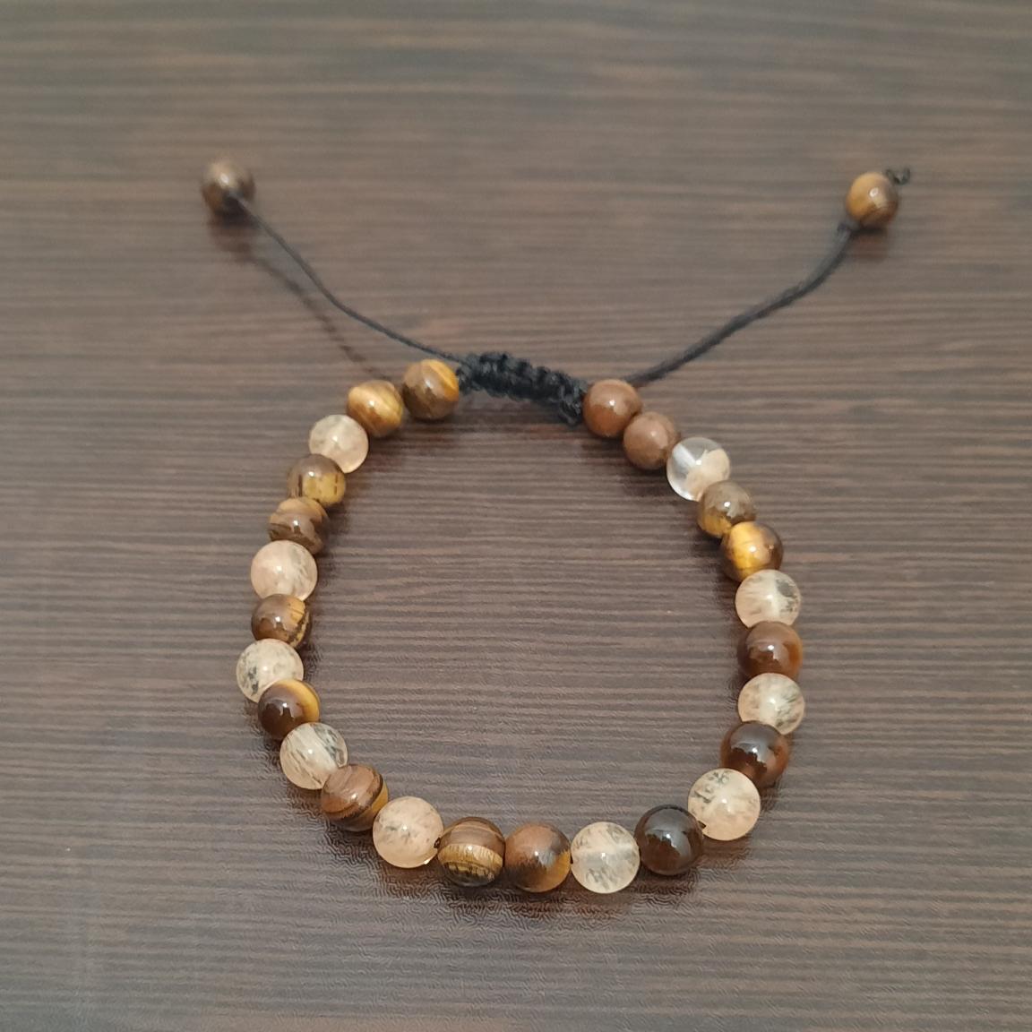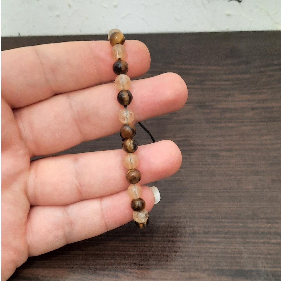 دستبند سنگ سیترین و چشم ببر تقویت کننده مراکز بدنی دوم و سوم است.ترکیب این دو سنگ خواص بسیار زیادی از جمله رفع کسلی،بالابردن انرژی بدن،سرزندگی دارد.همچنین این دستبند ثروت ساز و پیشرفت دهنده می باشد.
