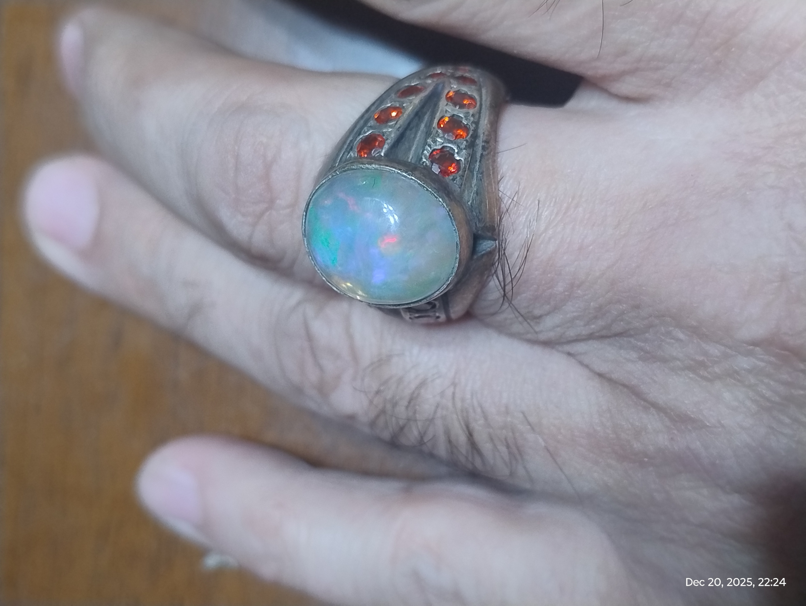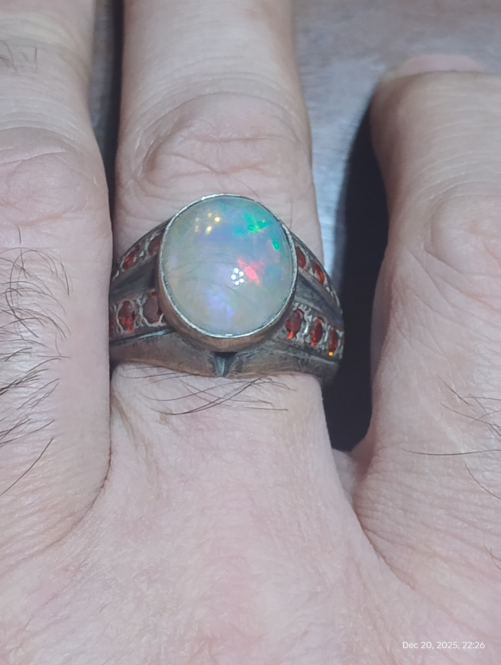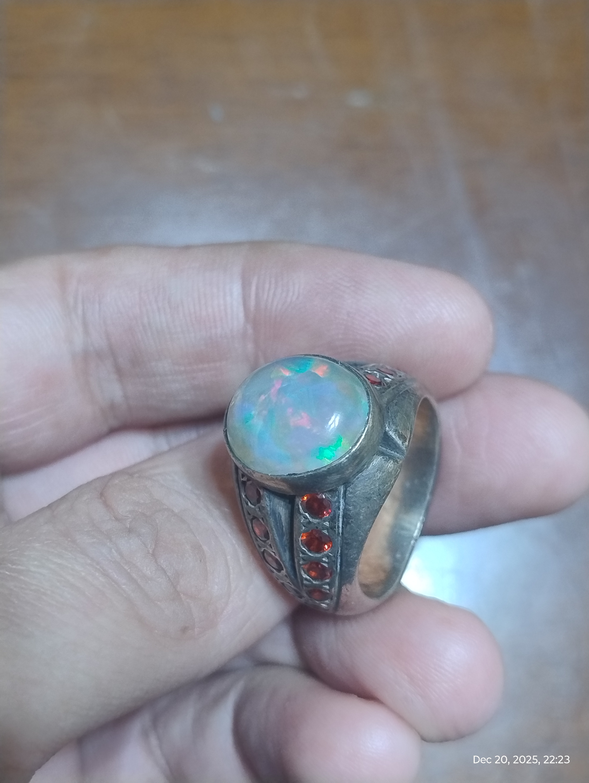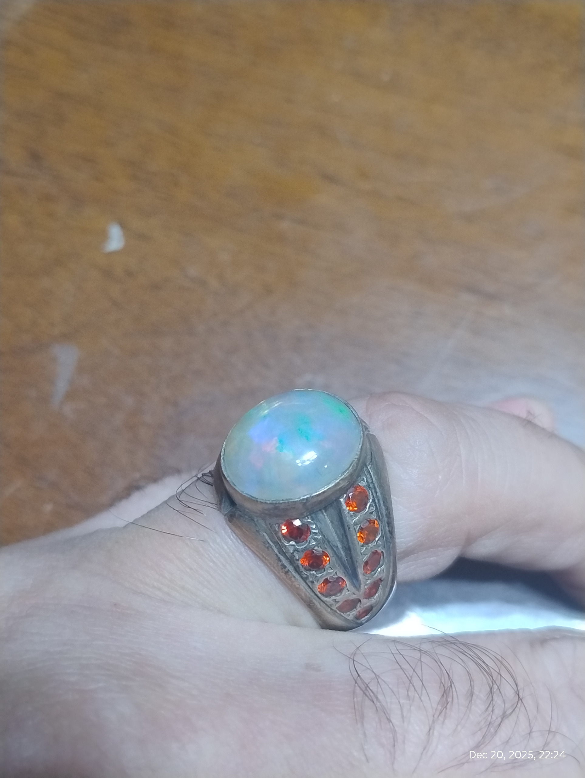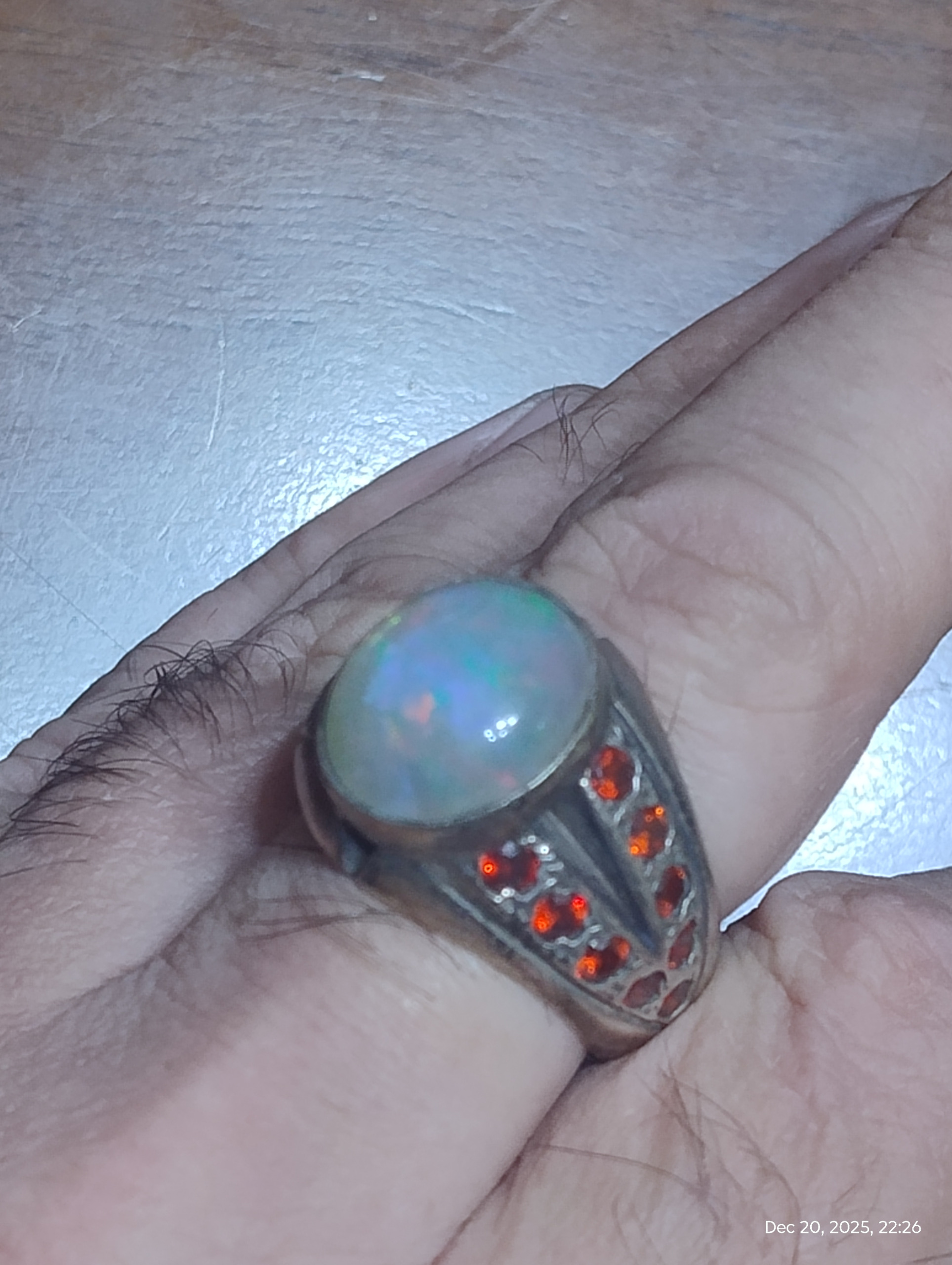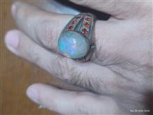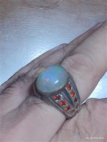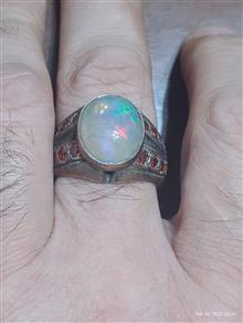 انگشتر دستساز با مخراجکاری 19 عدد نگین توپاز سرخ سویسی یکدست و نگین اپال پر تلالو سفید با بازی نور بی نظیر بسیار زیبا تر از تصاویر یک اثر در کار و مجلسی / این انگشتر سنگین و بسیار زیبا است ولی متاسفانه نمیشه در تصاویر این زیبایی رو نشون داد همچنین با اپال بسیار با کیفیت با قیمت قیراطی بالای دو میلیون گرید 1