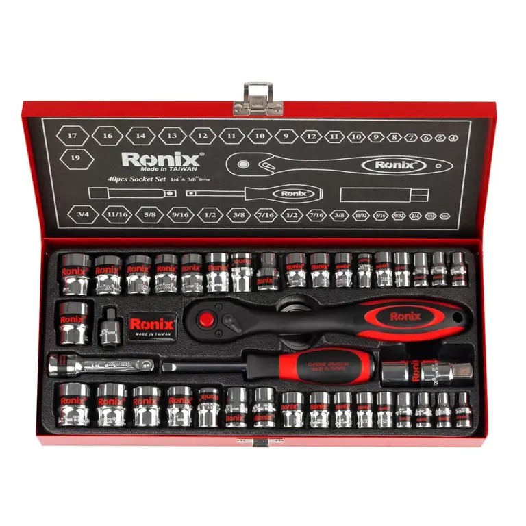 مجموعه بکس 40 عددی 3/8 اینچ دسته TPR رونیکس مدل RH-2640مجموعه ای دارای 40 قطعه، ساخته شده از مواد باکیفیت سخت کاری شده با گشتاور بالا می باشد. این ست دارای سوکت های فولادی از جنس کروم وانادیوم با مقاومت و استحکام بالا است که با کروم مات مشکی روکش شده اند تا
