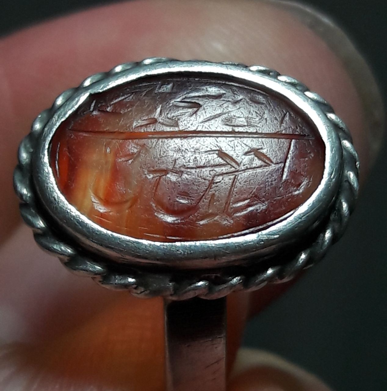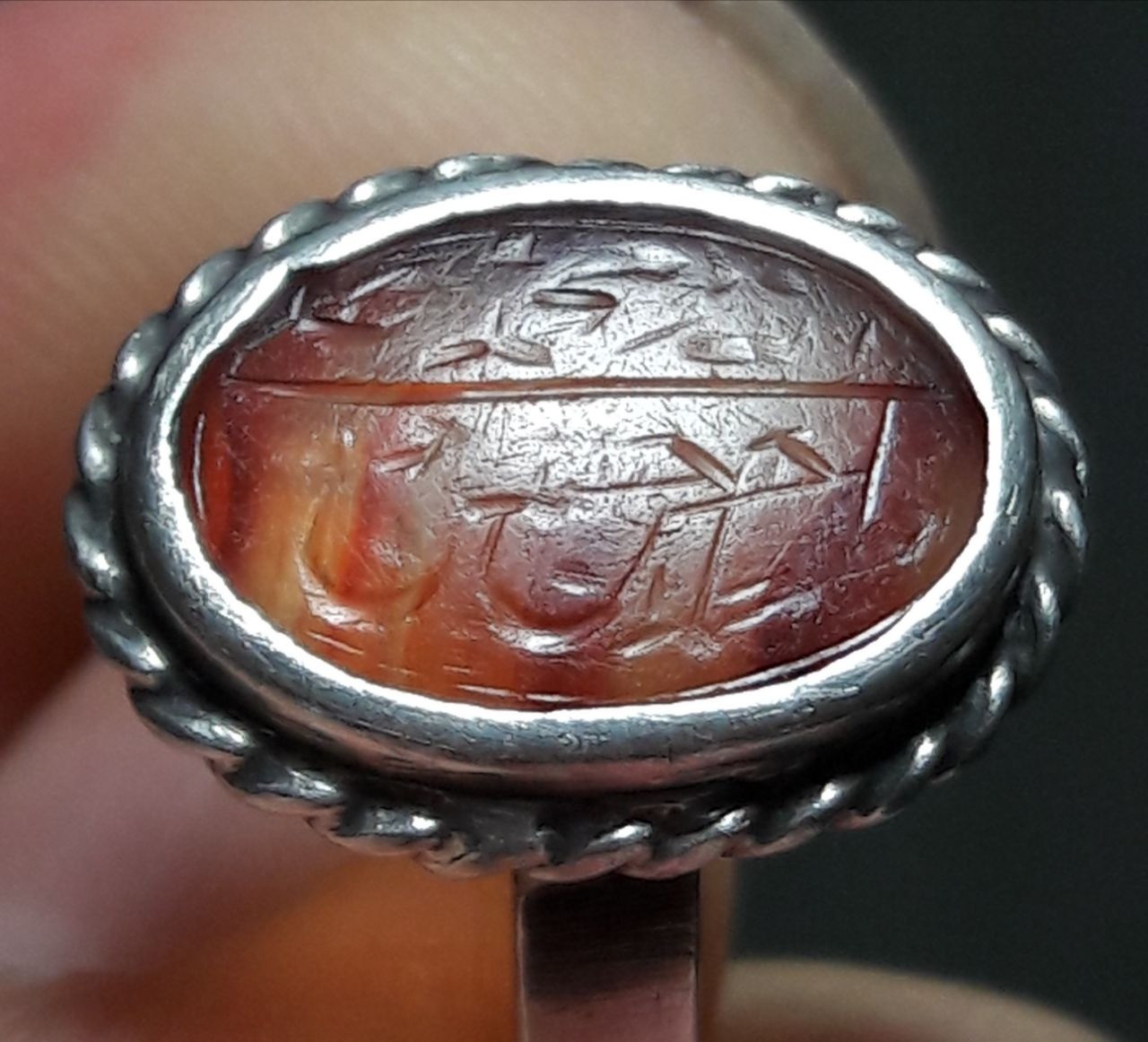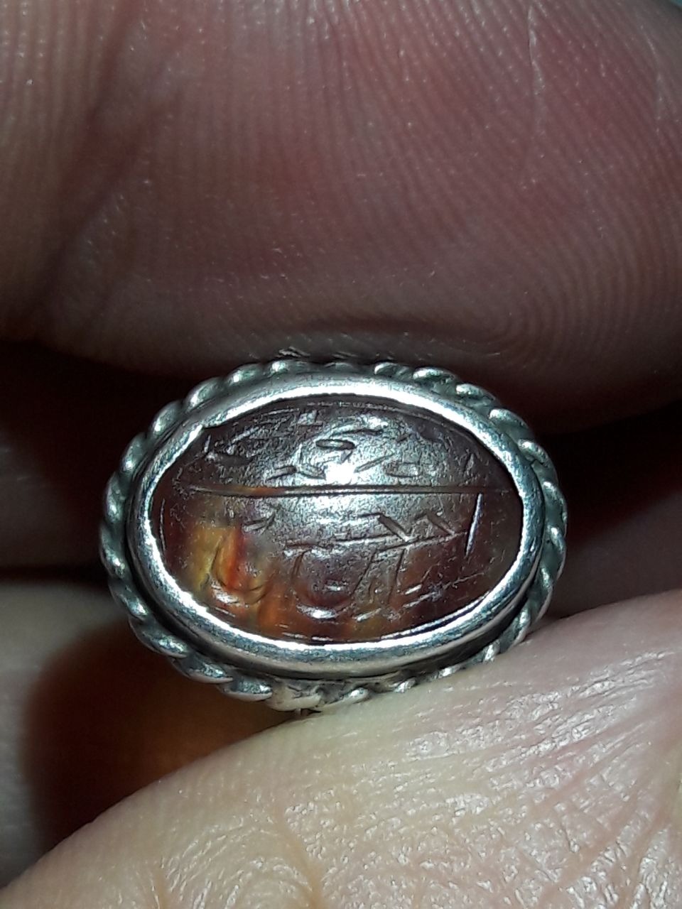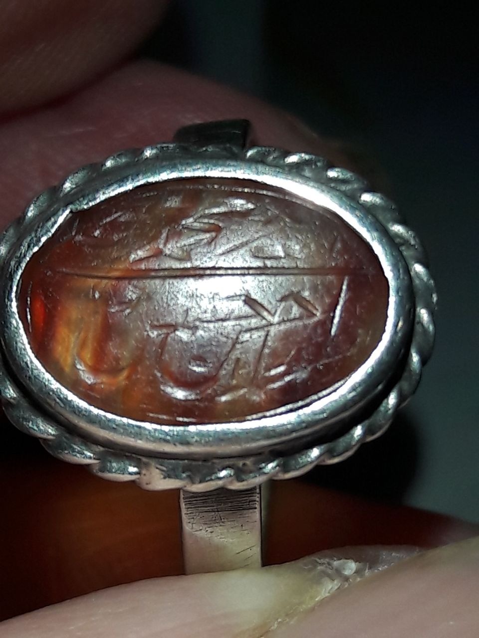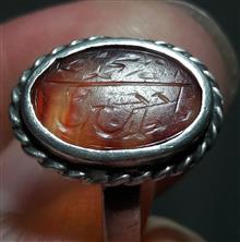انگشتر عقیق یمانی کهنه تراش ثبتی به قلم زیبای پر برکت شهید حاج حسین حکاکان معروف به حاج حسین شهید. از قلم های ریز حاج حسین بر روی نگین به ابعاد یک سانت حدودا رکاب نقره فابریک سایز شد قدیمی