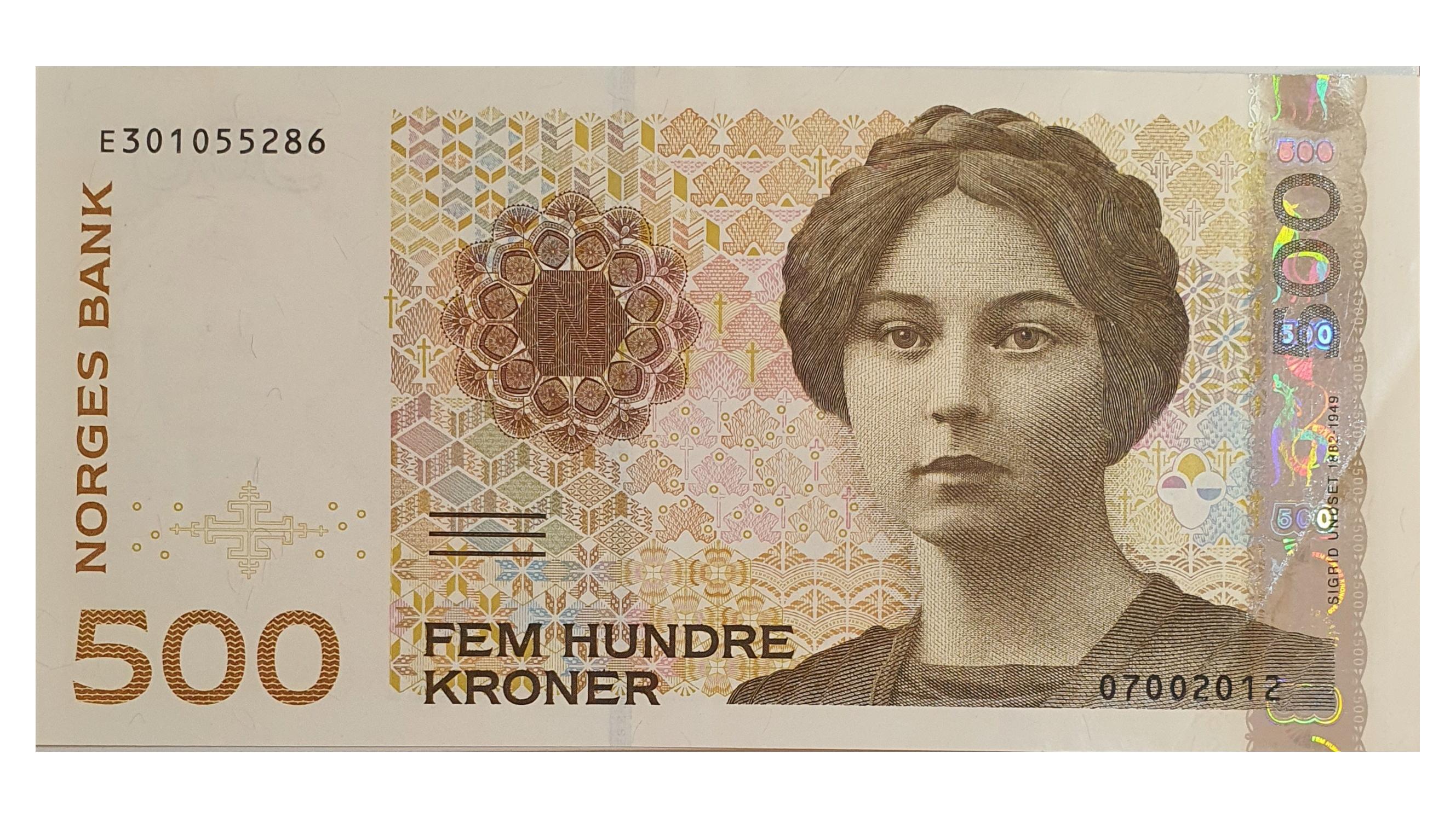 این اسکناس در سال 1999 با طرح نویسنده سیگرید آنست برنده نوبل ادبیات 1927 به عنوان بخشی از سری هفتم اسکناس های نروژ منتشر شده است و در سایت های آنلاین معتبر خارجی 43 یورو قیمت گذاری شده و دارای نوار هولوگرافیک فلزی و طرح های هنری و نقش های تزئینی مربوط به صنایع دستی سنتی نروژ می باشد .