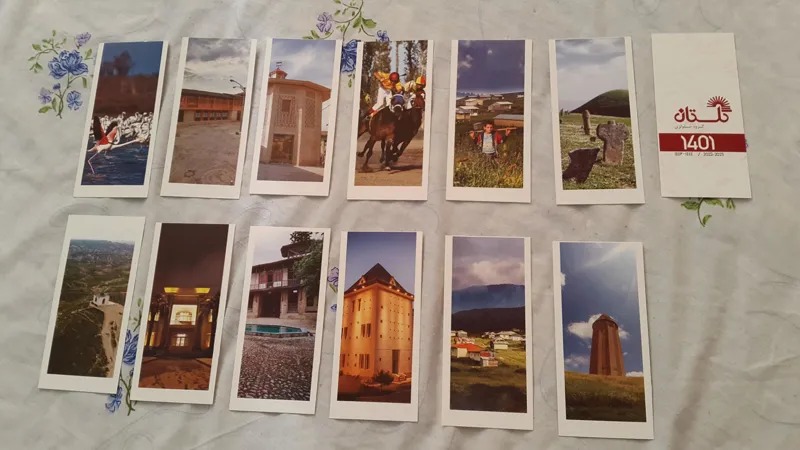 تعداد 24 عدد تصویر از مناظر و آثار تاریخی استان گلستان که نه عدد در اندازه حدودی 13 در 12 سانت، یک عدد در اندازه حدودی 13 در 9 سانت و دو عدد در اندازه حدودی 13 در 11 سانت(تصویر شماره پنج) و بقیه هم تکرار همان تصاویر اند منتهی اندازه های کوچکتر و باریک تر.