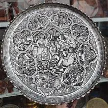 مجمعه قدیمی 65 سانتیمتری دیوار کوب مسی قلم کاری شده تماما کار دست ، طرح سنتی مجلس بزم و هشت عدد حاشیه مجلس سنتی به سبک سیاه قلم برجسته وزن کار 3،140 کیلوگرم