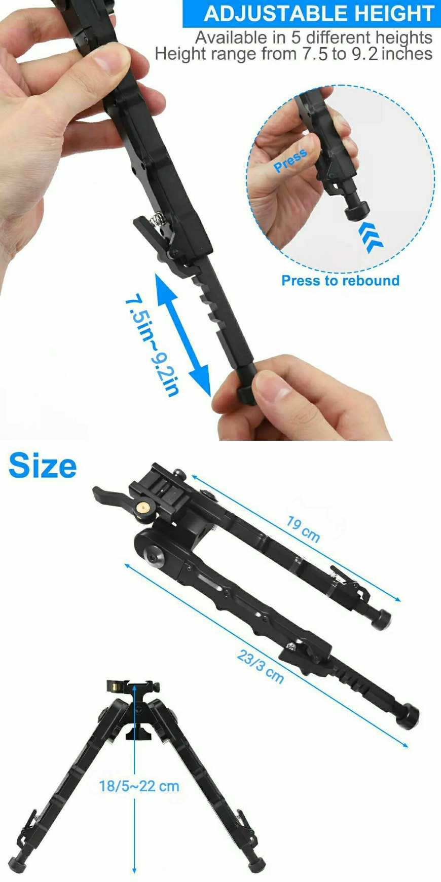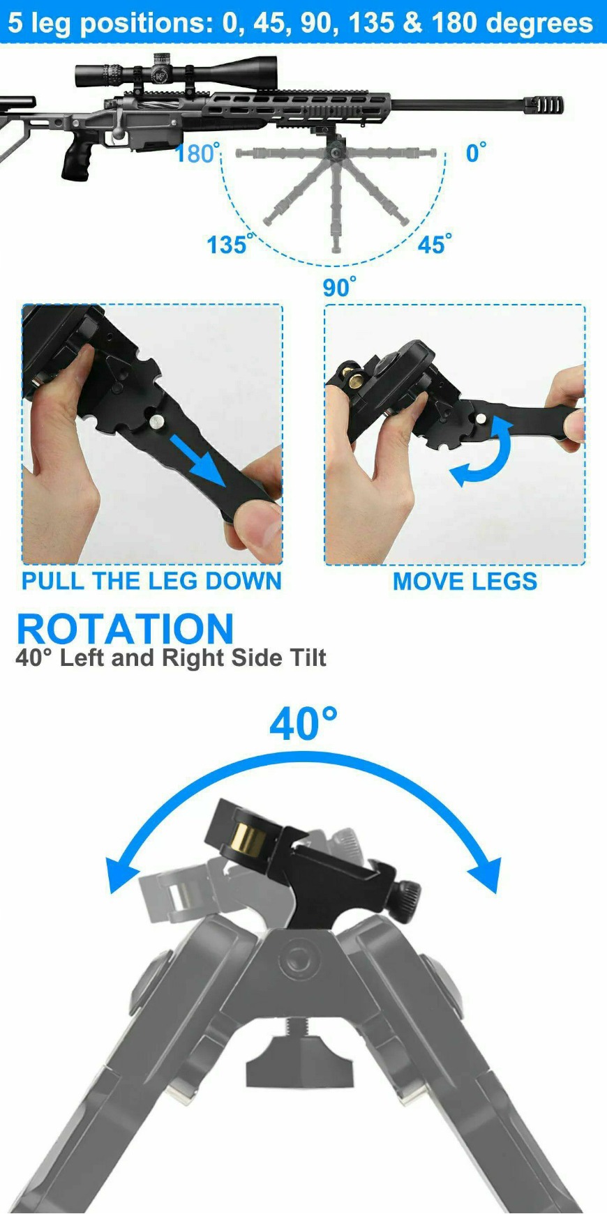 قابلیت تا شدن 180 درجه پایه ها(قرارگیری موازی با لوله سلاح رو به سمت جلو یا عقب سلاح).
