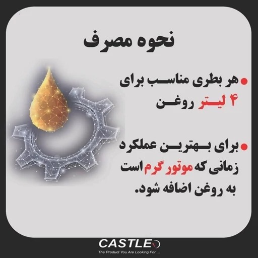 - محصول پس از گرم شدن موتور (در حالت روشن و درجا کار کردن) به صورت مستقیم به مخزن روغن موتور اضافه کنید.