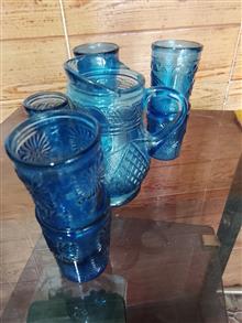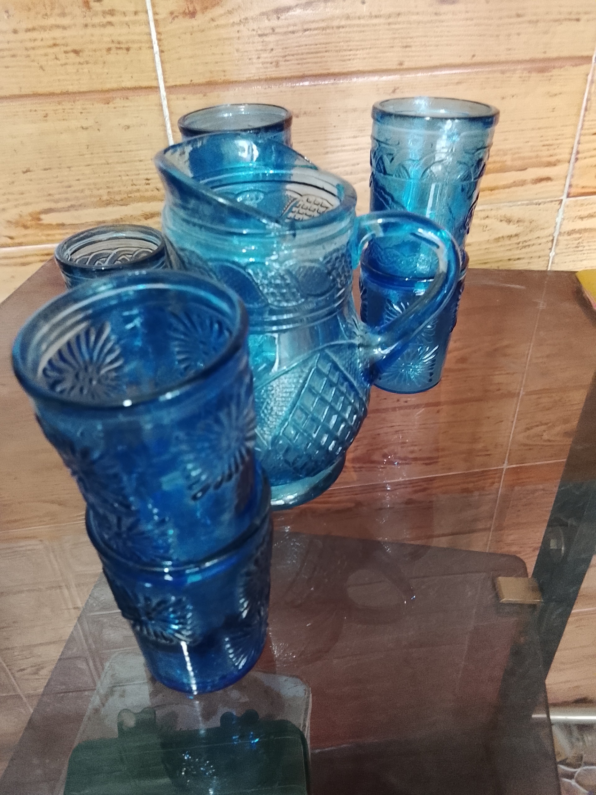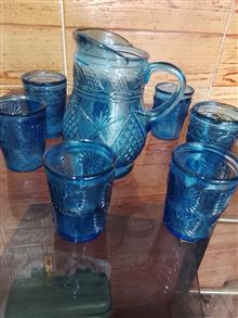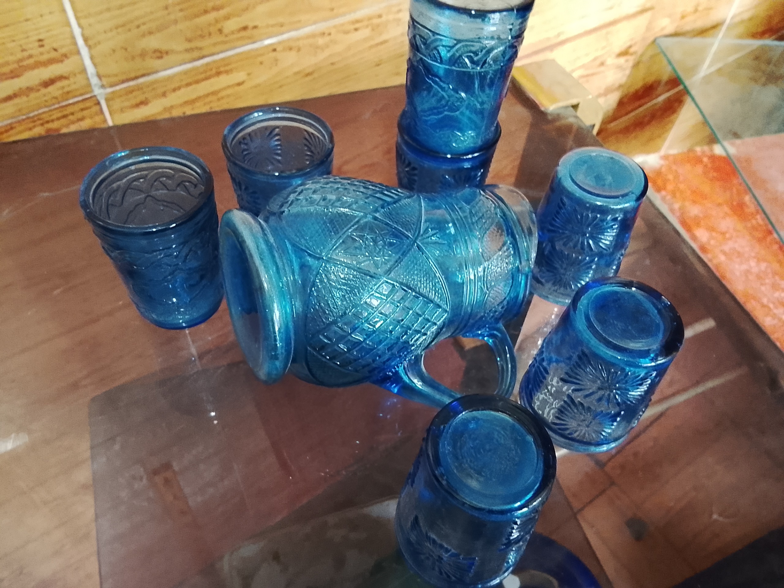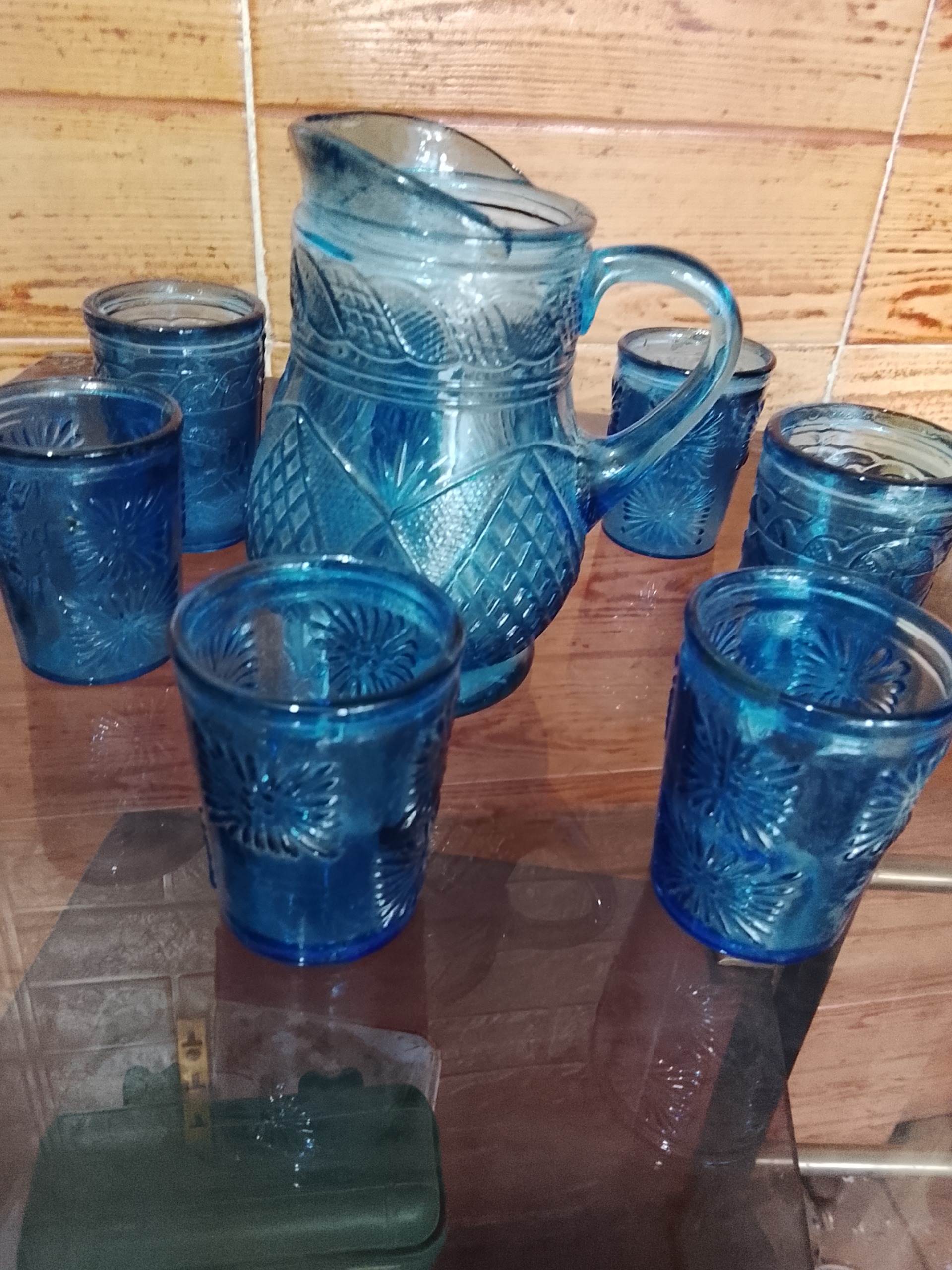 پارچ لیوان سایز کوچک و آبیرنگ با7عدداستکان خوش رنگ وکلکسیونی خریداران محترم توجه داشته باشند که بعلت قدیمی بودن و همچنین دست دوم بودن وسایل لطفاً در موقع خرید نهایت دقت را داشته باشند بالاخره وسایل حدود 50ساله هستند و شاید بعضایک خط و خش جزیی داشته باشندلذا