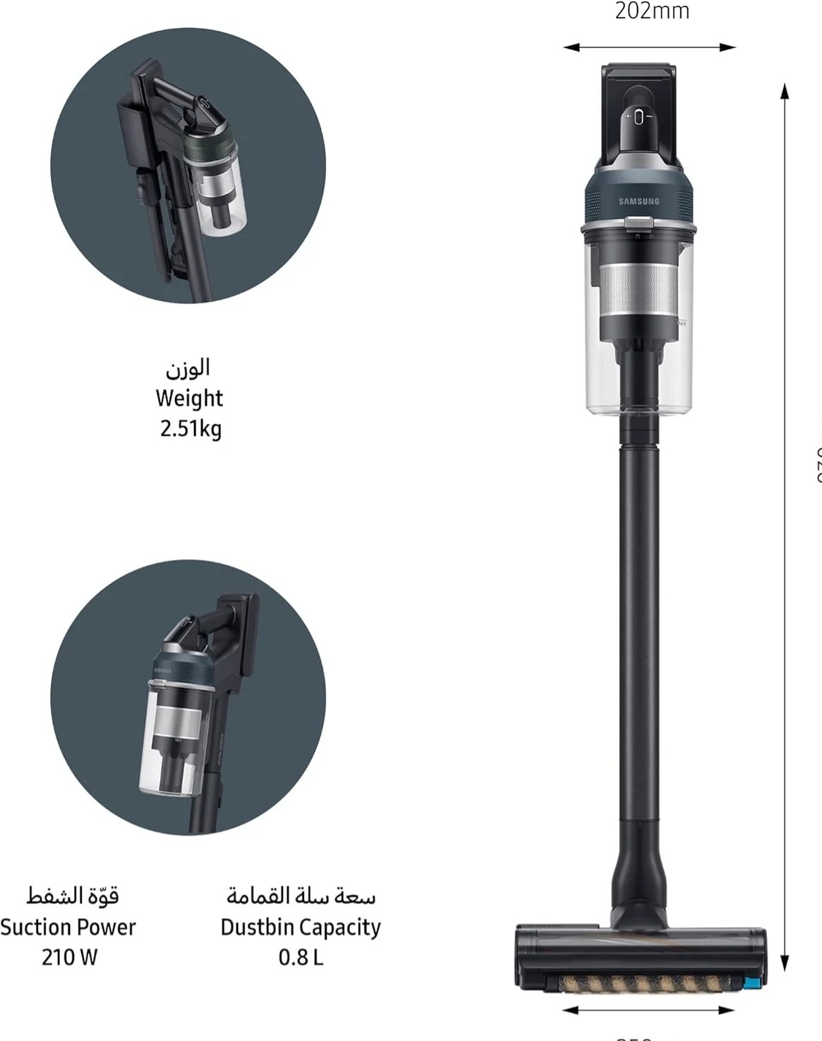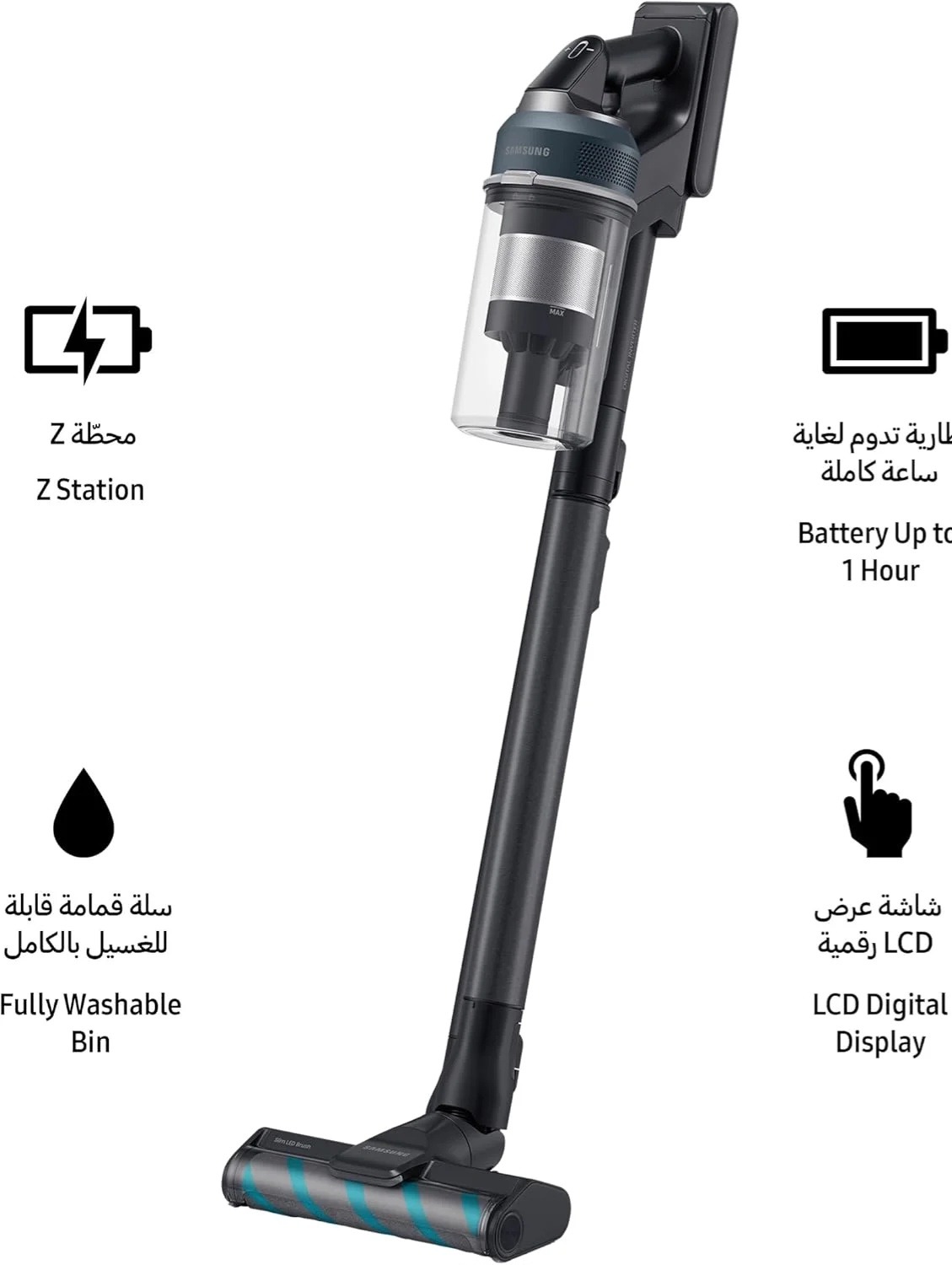 جاروبرقی عصایی بیسیم سامسونگ جت 95، 60 دقیقه زمان کارکرد، قدرت مکش 210 وات، طراحی سبک، تمیز کردن قدرتمند، موتور HexaJet، مشکی کروم متال، VS20C9544TB/SG (نسخه امارات