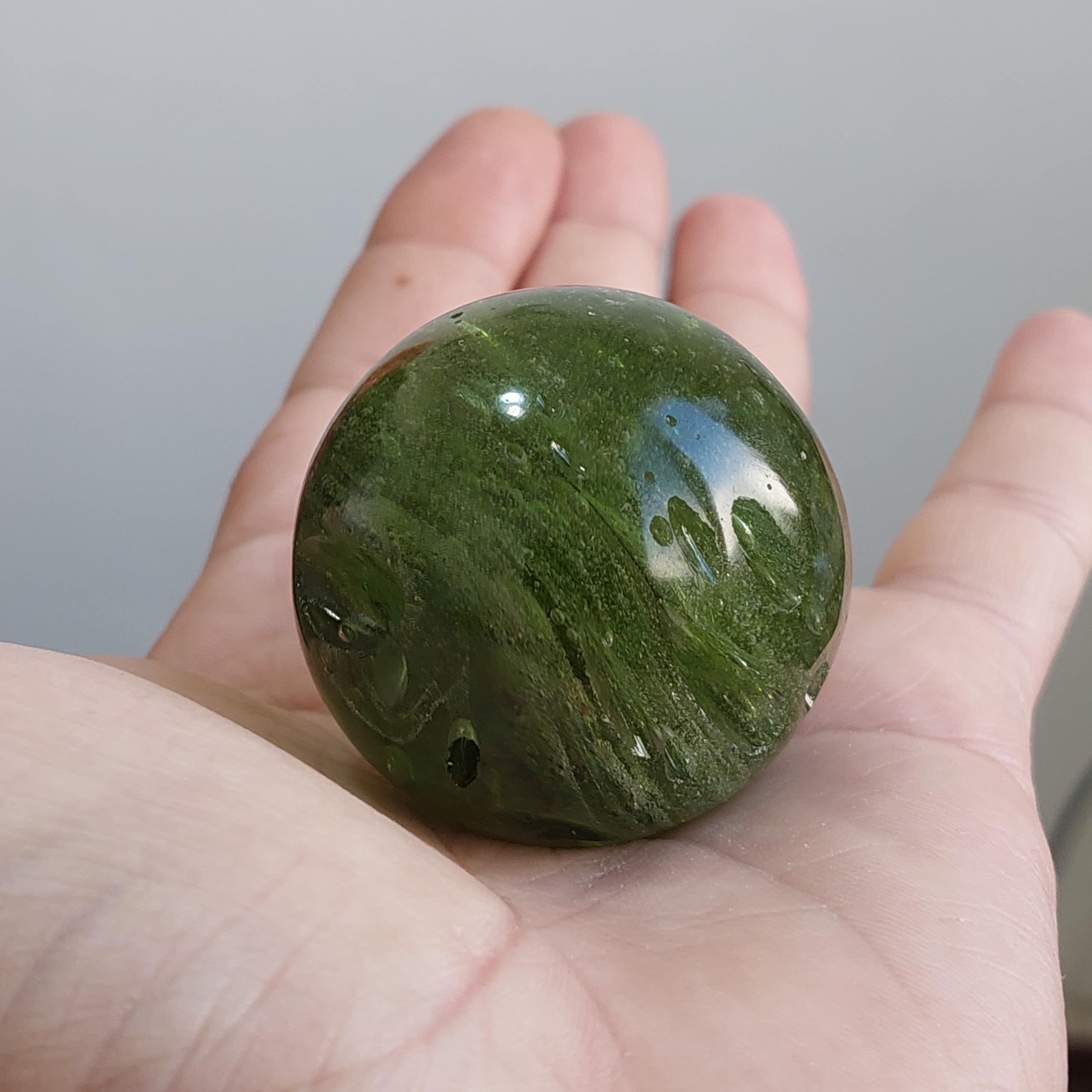 گوی 47 میلیمتری سنگ آبسیدین زمردی فوق العاده خاص و زیبا دوستان این گوی با باقی گوی های داخل غرفه متفاوت هستش روی سطح این گوی حفره هایی وجود دارد که به خاطر فشار کمی که زمان تشکیل سنگ روی مواد مذاب اتشفشانی بوده هوای داخل مواد مذاب خارج نشده و این پدیده که به صورت حفره تشکیل شده روی سنگ پدیدار شده و ما هم به خاطر زیبایی که به سنگ داده و شبیه به کره ماه بود همن طور حالت طبیعی سنگش رو حفظ کردیم و تراش دادیم که این گوی زیبا با حفره های تو خالی رو تراش دادیم که واقعا یه نمونه فوق کلکسیونی شد
