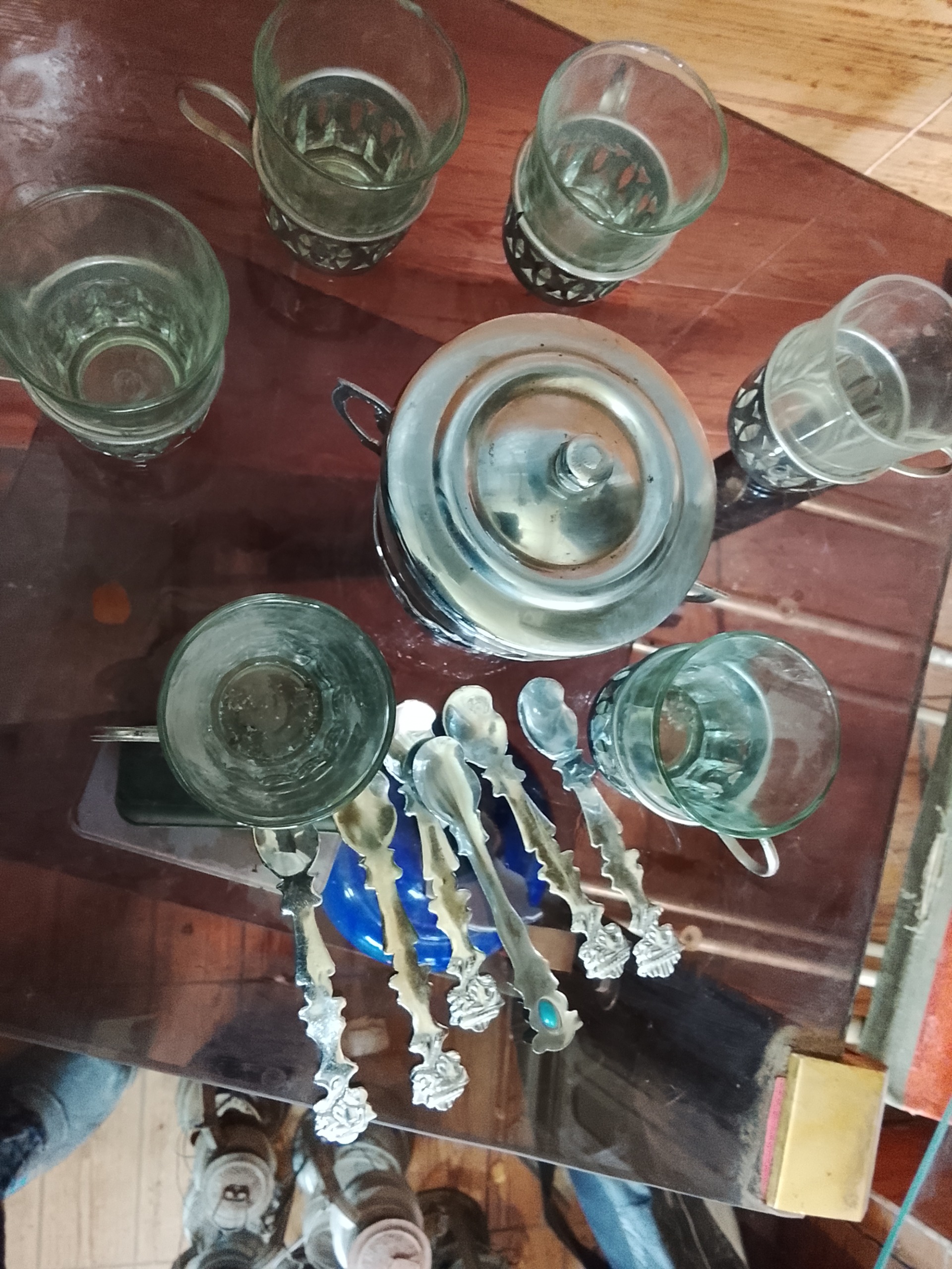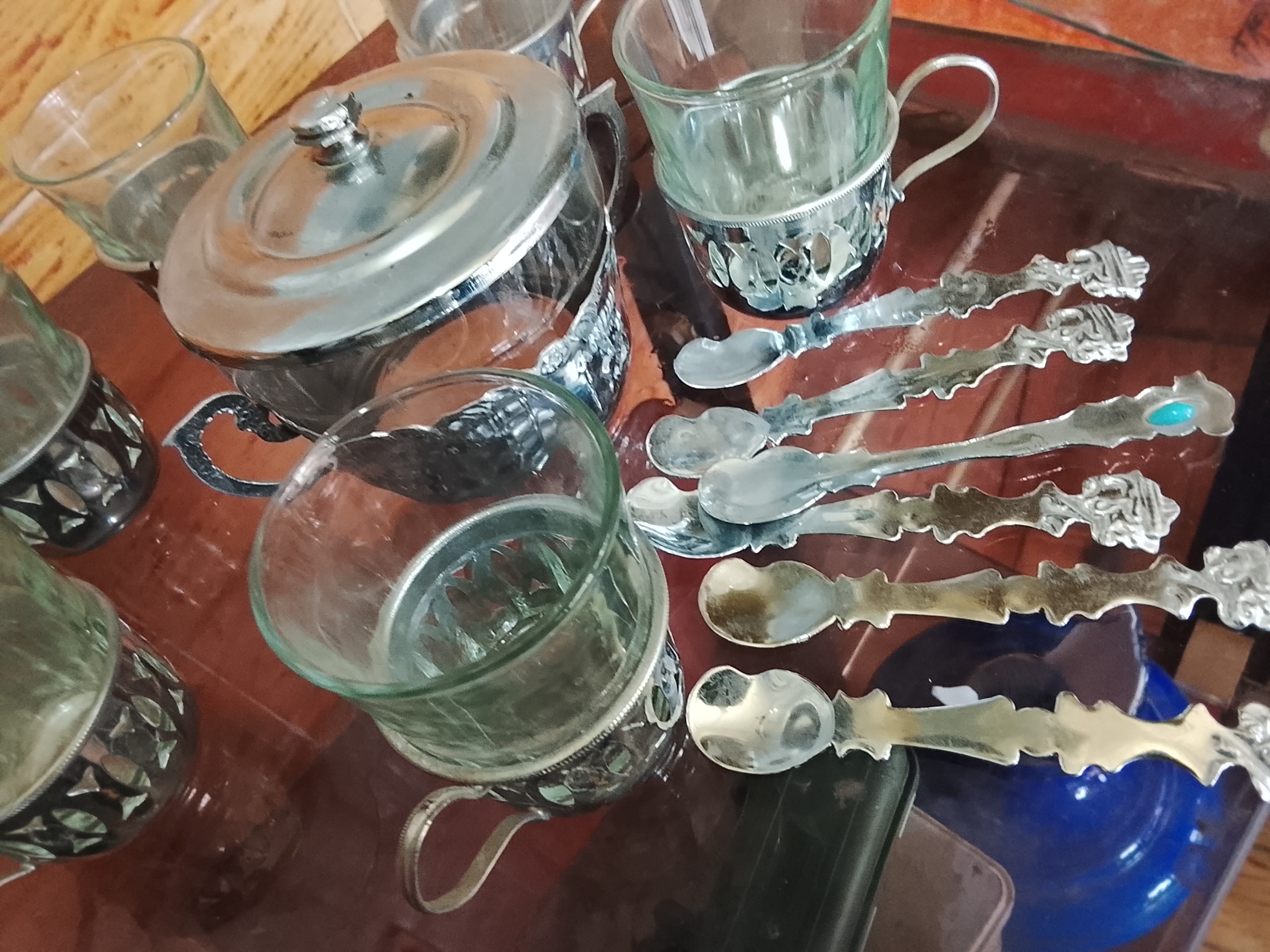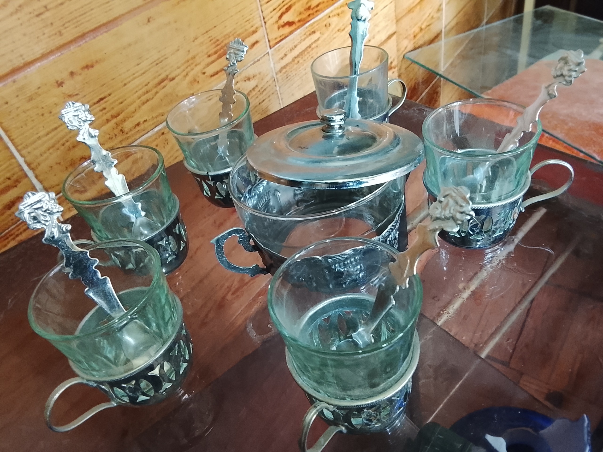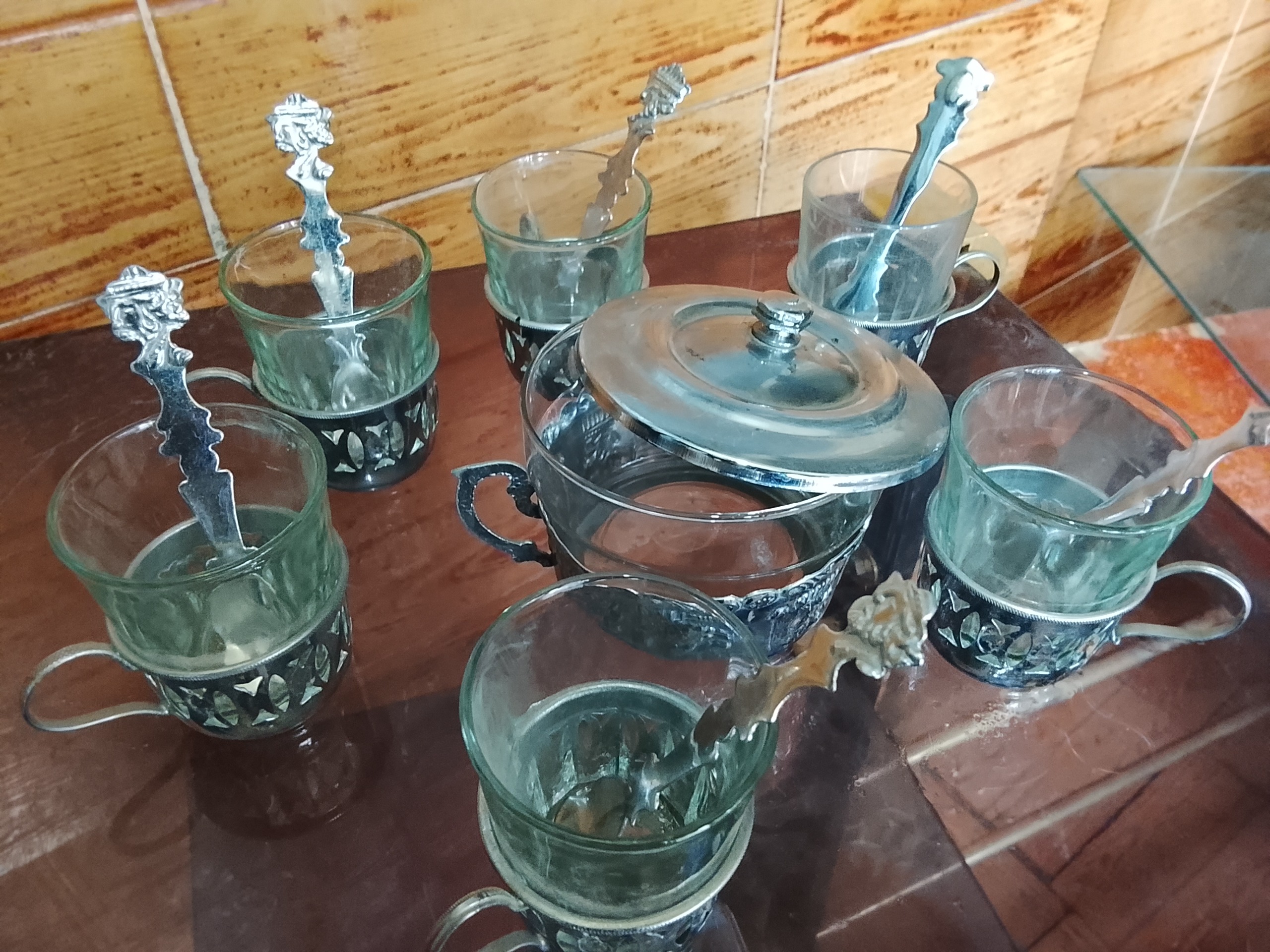 یک دست سرویس چای خوری قدیمی شامل 6عدد استکان قدیمی 6عدد پایه برنجی استکان ویک عددقندان شیشه ای قدیمی با پایه برنجی و6عددقاشق کوچک مرباخوری جمعا 20پارچه قدیمی و سالم کلکسیونی و همچنین قابل استفاده هستند