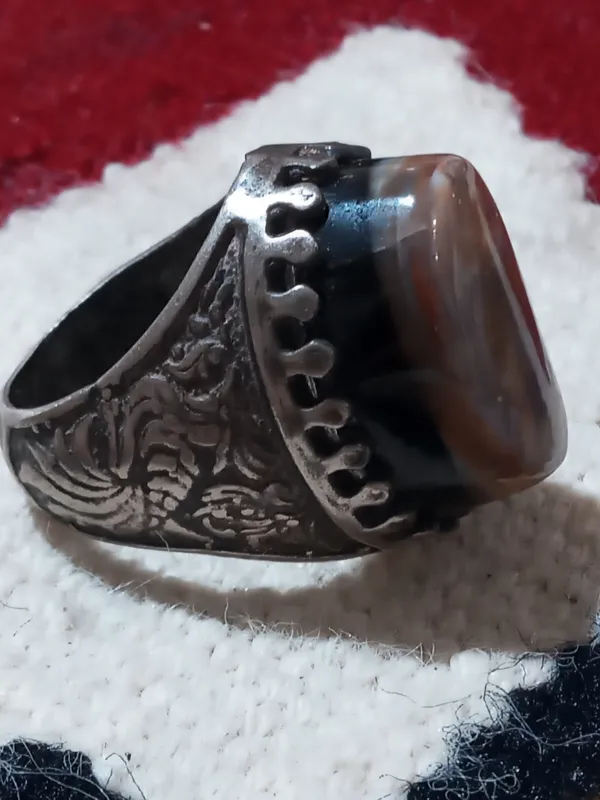 انگشتر نقره بزرگ با رکاب طرح گل خوشساخت ونگین سلیمانی دیدنی وخاص باطوق مشکی