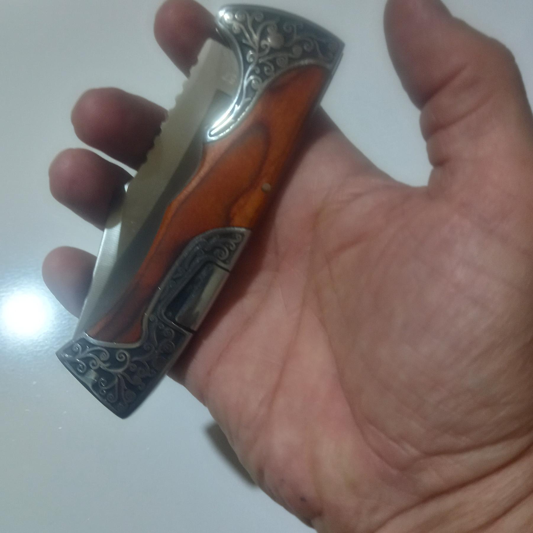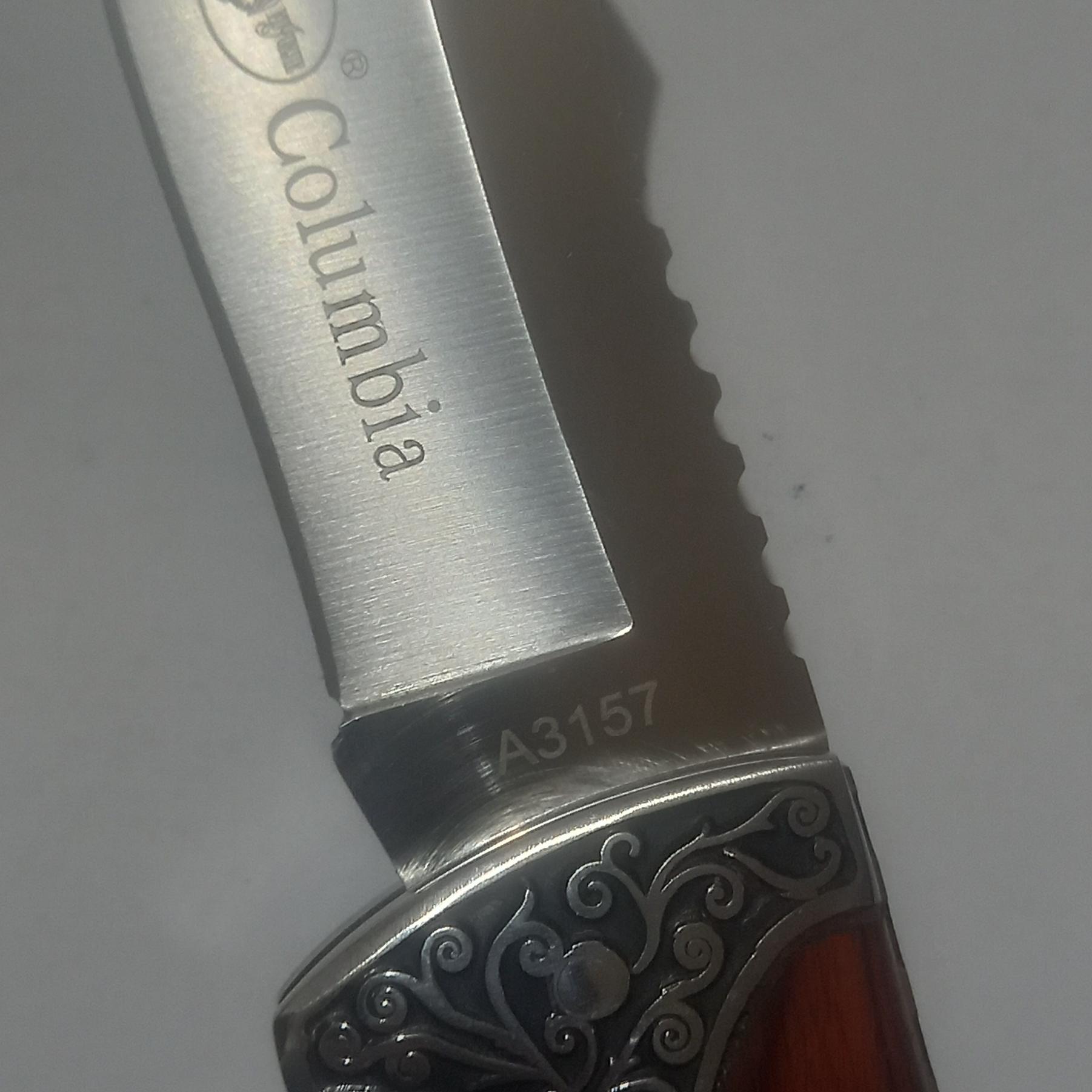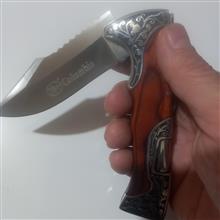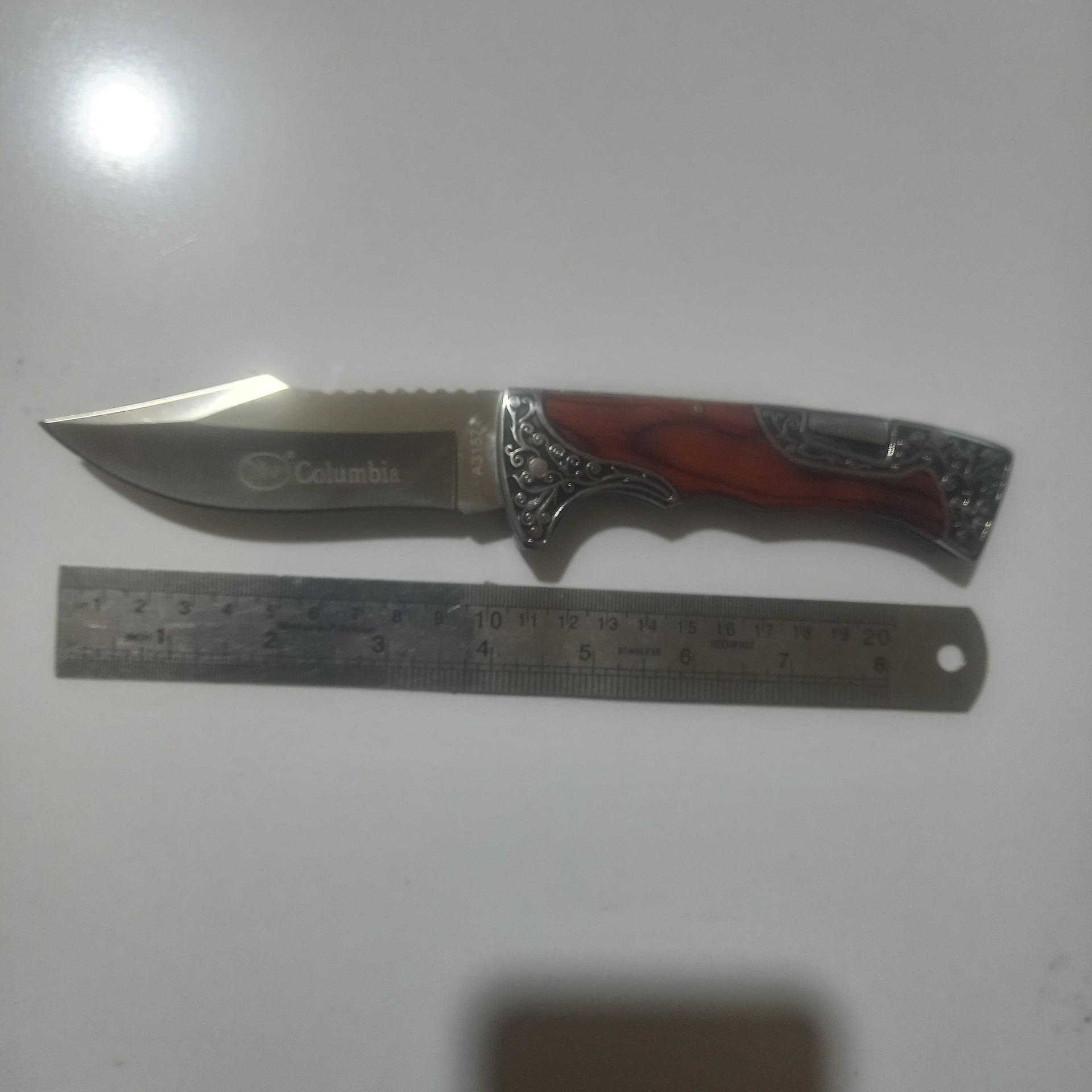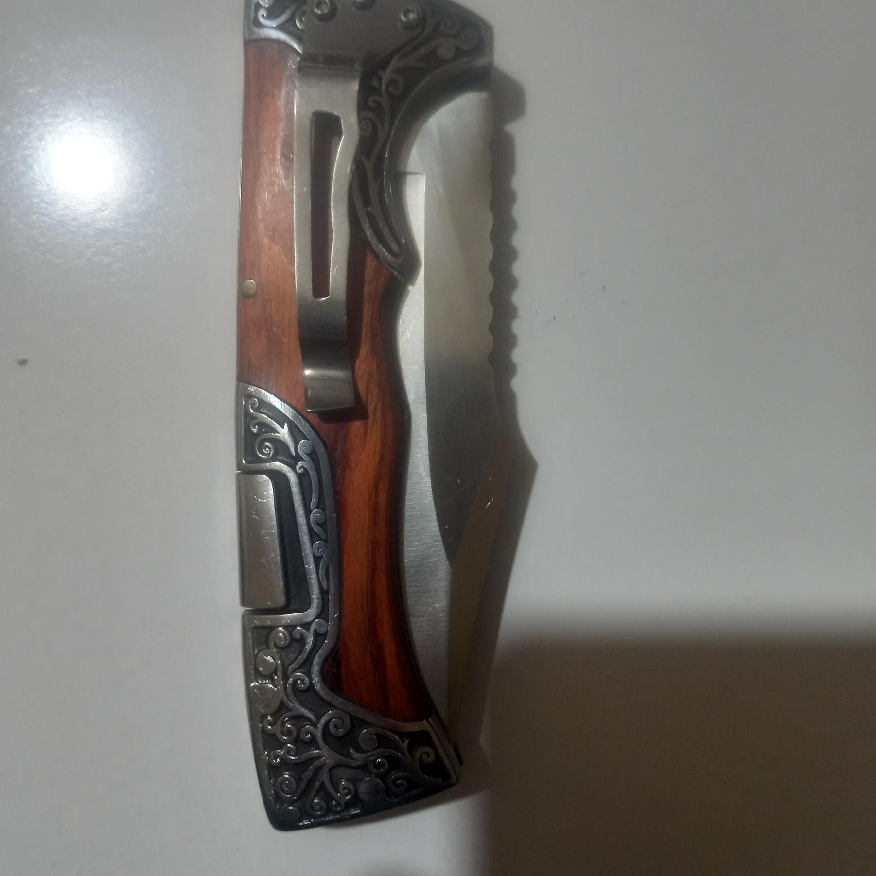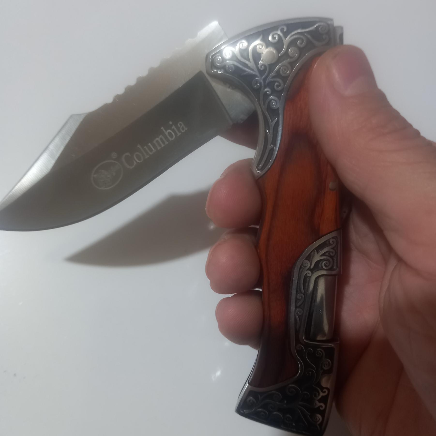چاقو تاشو و ضامن دار اصل کلمبیا بسیار با کیفیت ؛؛ و بسیار تیز و بزرگ و به طول 22 سانتیمت و وزن خالص چاقو 248.9گرم و خودتان میدانید که چاقوی ضامن دار قلاف ندارد و در عوض روی کمربند سوار میشود به وسیله گیره بسیار بسیار محکمی که برای این کار تعبیه شده و در زمره چاقوهای تا شو و ضامن دار جزو بهترینها با متریال درجه 1 میباشد و روی دسته چاقو بصورت کنده کاری ماشینی به چاقو زیبایی بینظیری بخشیده است