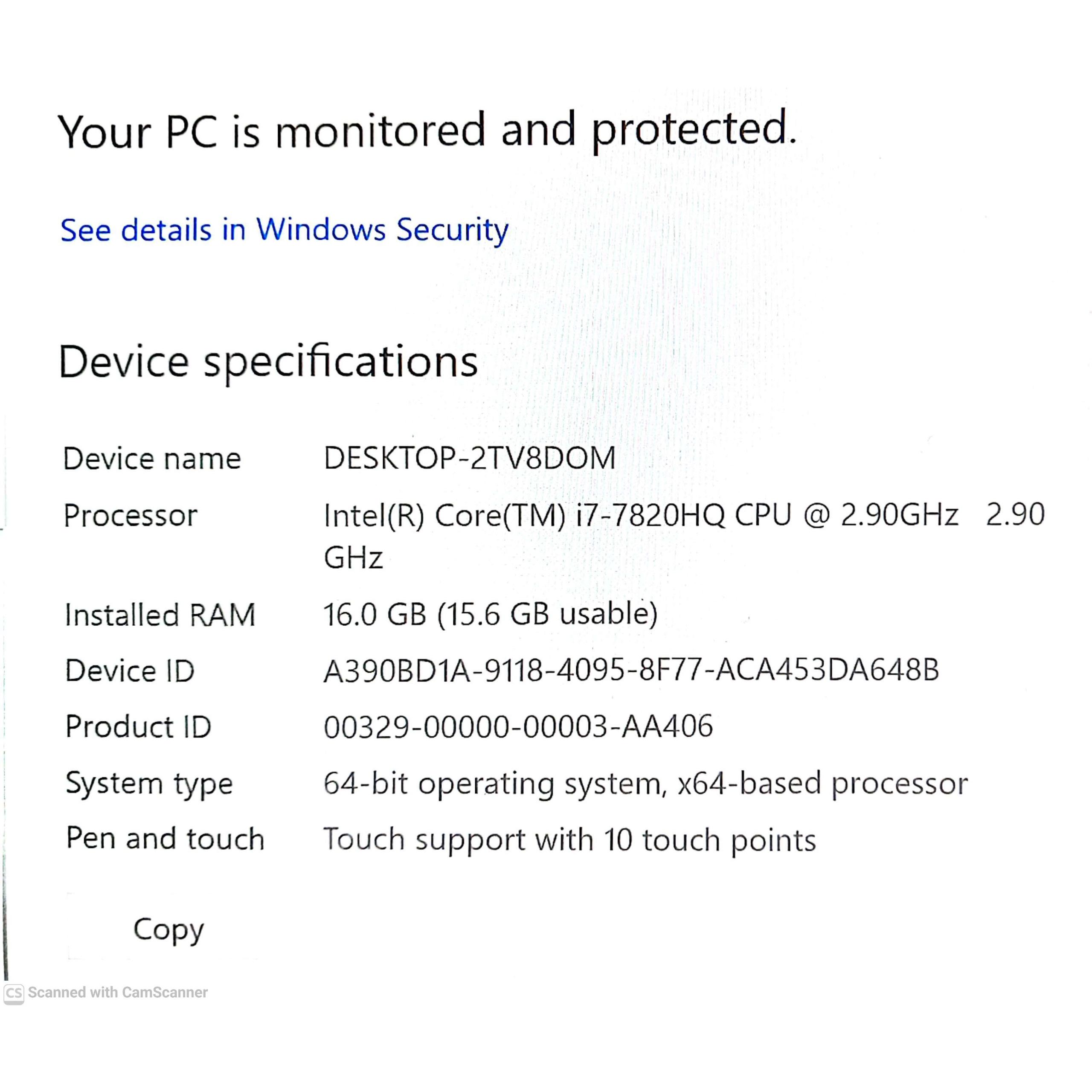 CPU: INTEL core I7 7820HQ