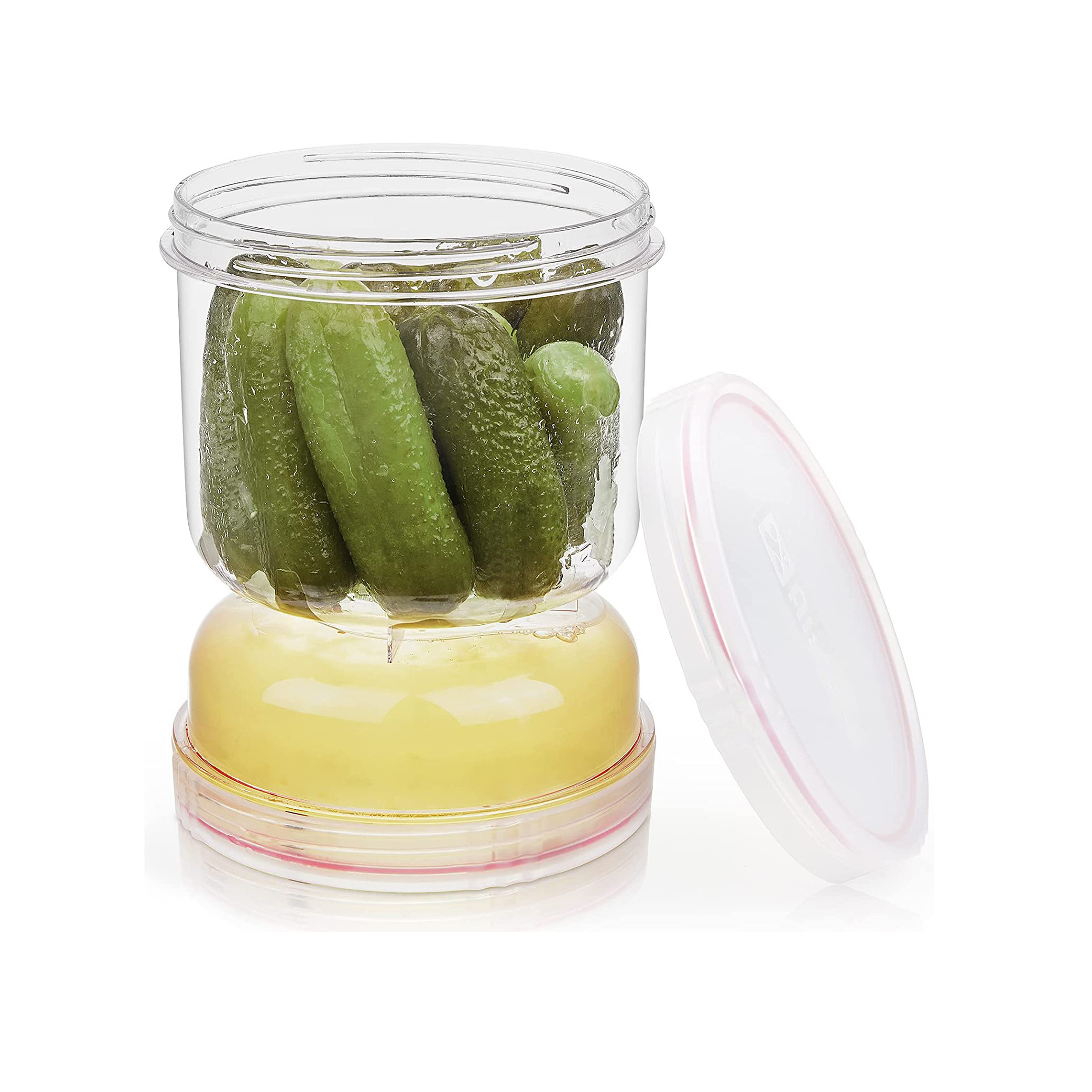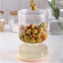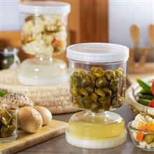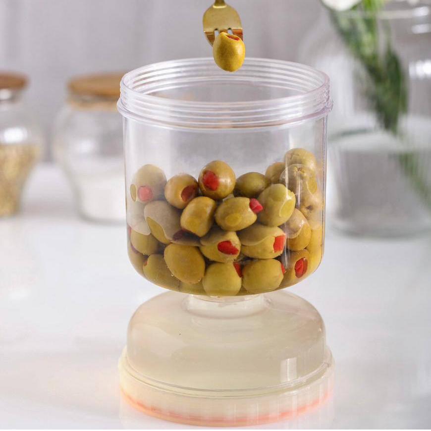 ظرف نگهدارنده خیارشور ، یک ظرف جدید با طراحی منحصر به فرد و البته عملکردی خاص می باشد . این ظرف استوانه ای شکل دارای دو محفظه با ابعاد متفاوت از یکدیگر بوده که بر روی یکدیگر قرار گرفته اند و از طریق یک خروجی در قسمت انتهای خود به یکدیگر متصل شده اند . محفظه بزرگ برای جای دادن خیارشور به همراه مایع نگهدارنده همراه آن طراحی شده ، به طوری که در حالت عادی یک ظرف خیارشور معمولی را خواهید داشت ، اما در موقع نیاز کافیست ظرف را به صورت عکس برگردانید ، به طوری که محفظه بزرگتر بالا و محفظه کوچکتر در پایین قرار گیرد ، در این حالت مایع همراه خیارشور ، از طریق خروجی به داخل محفظه زیرین منتقل می شود و خیارشورها در دسترس شما خواهند بود ، بدون اینکه تماسی میان دست شما با مایع وجود داشته باشد ، بدین ترتیب آلودگی ، انتقال چربی و رطوبت به سرکه و یا مایع همراه مواد غذایی جلوگیری خواهد شد و این یعنی علاوه بر دسترسی سریع و بسیار ساده تر با امکان استفاده تا مقدار پایانی مواد درون محفظه ، ماندگاری بیشتر مواد غذایی . ظرف نگهدارنده زیتون ، از هر دو طرف دارای دهانه با پوشش درب (باز و بسته شدن به صورت چرخشی) بوده و قابل استفاده برای نگهداری مواد غذایی مختلفی نظیر خیارشور ، زیتون ، سیر ، پنیر و انواع ترشیجات می باشد .