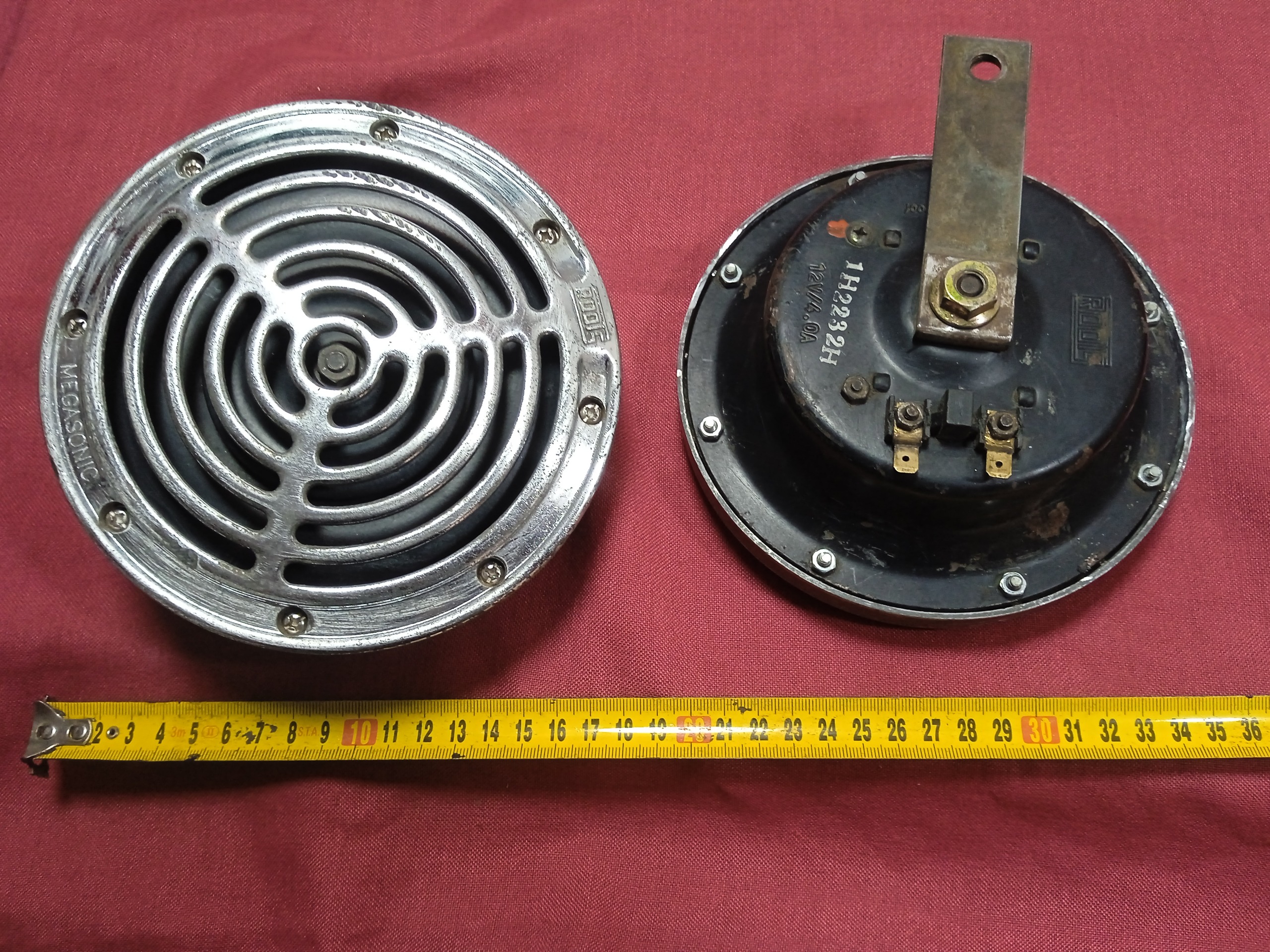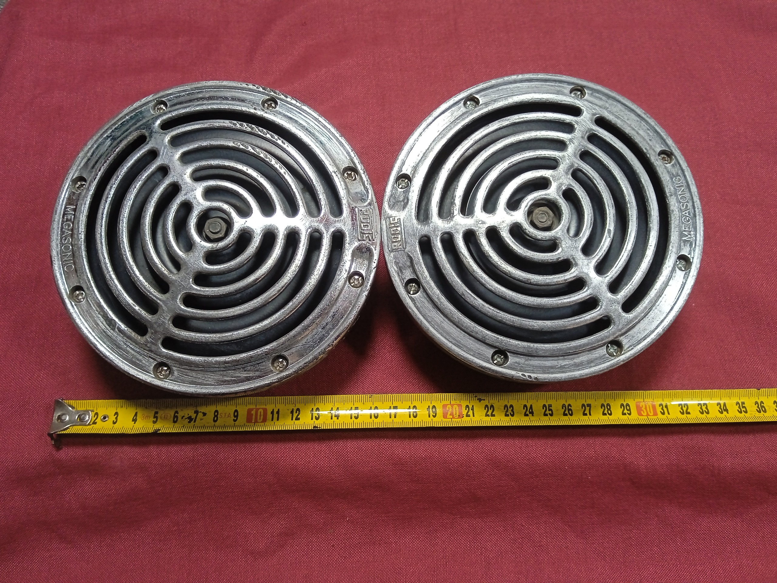 یک جفت بوق بنزی آلمانی مدل مگاسونیک روتس صفحه استیل فنری وزن 3کیلو اندازه 16سانت سالم اصلی رادیانت