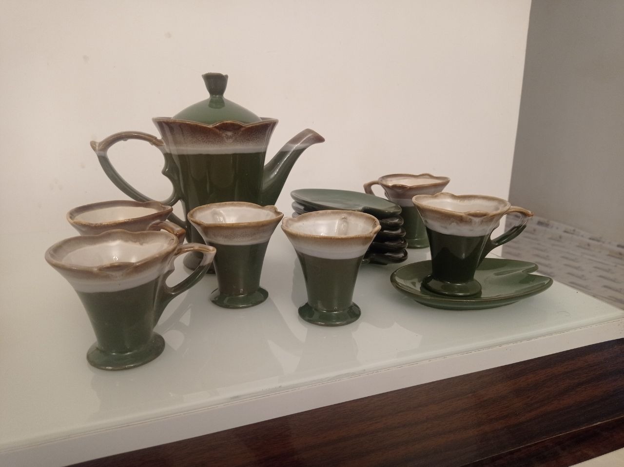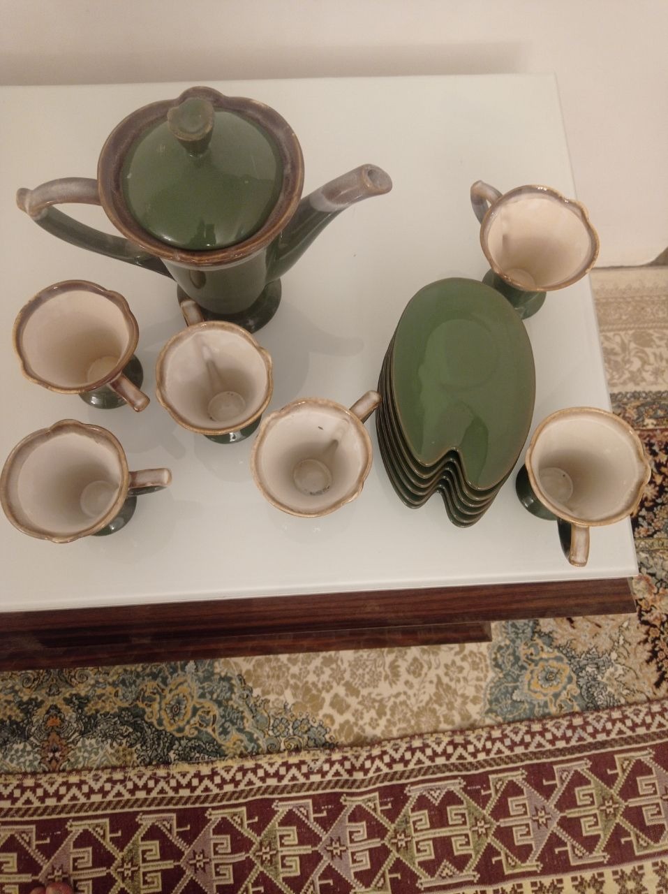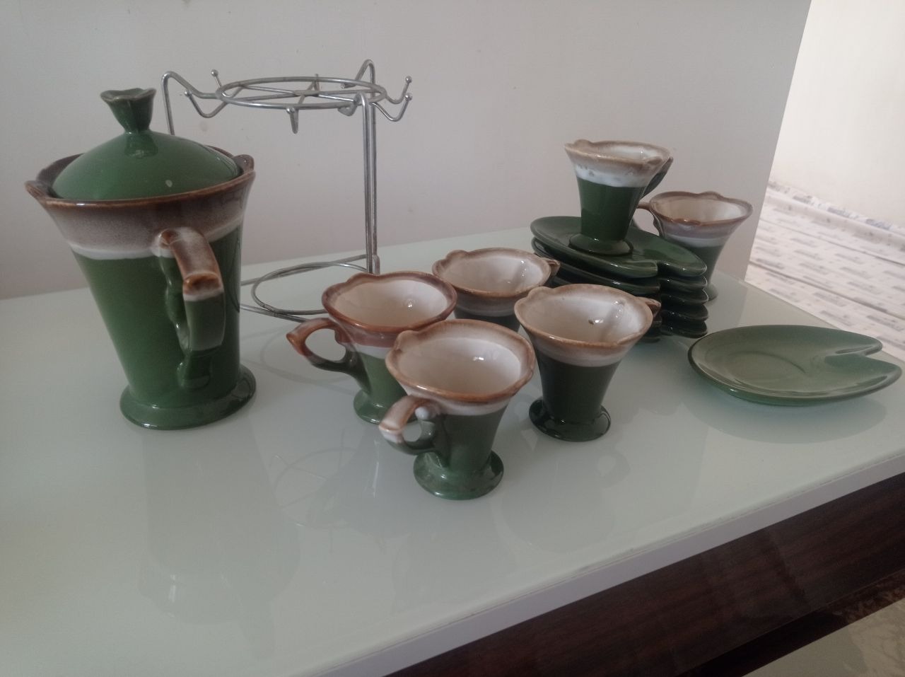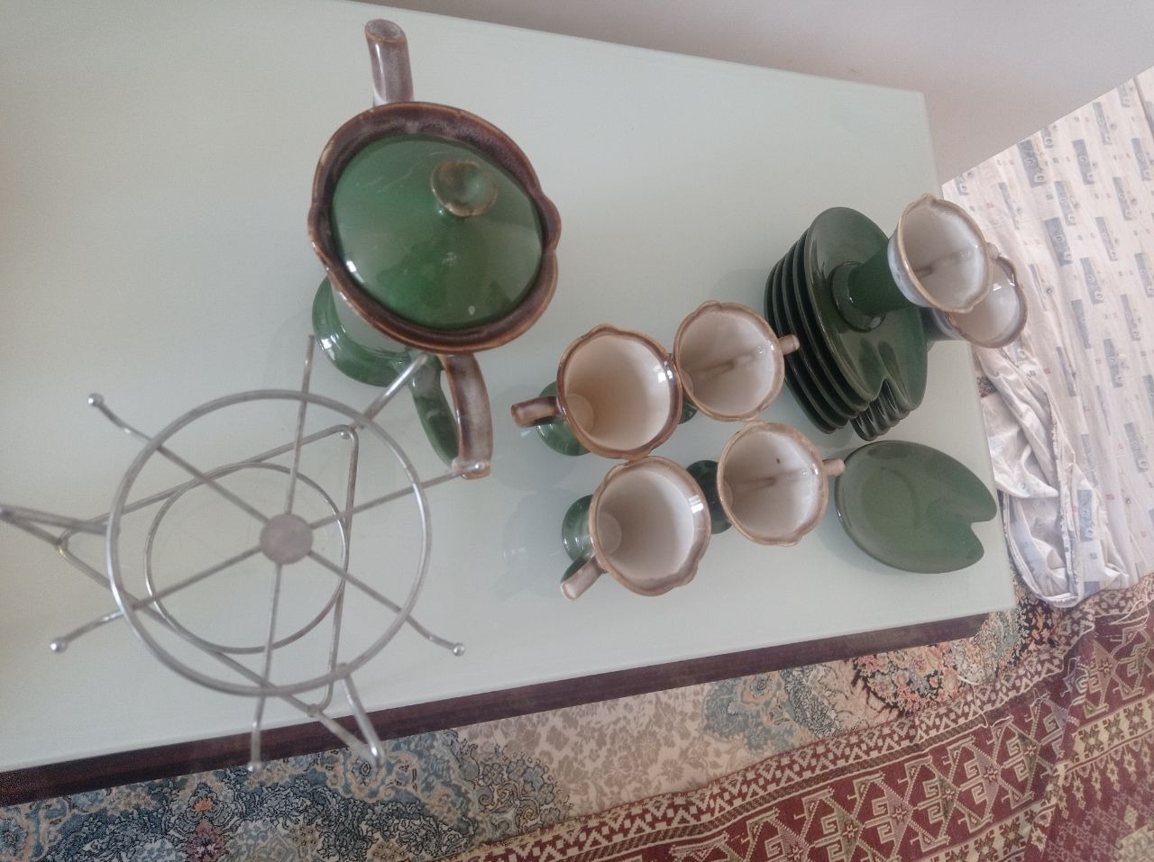 یک عدد قوری به همراه شش عدد استکان و نلبکی به همراه پایه ی فلزی، تنها دسته ی قوری شکسته که مجددا چسپ زده شده است بقیه موارد کاملا سالم هستند