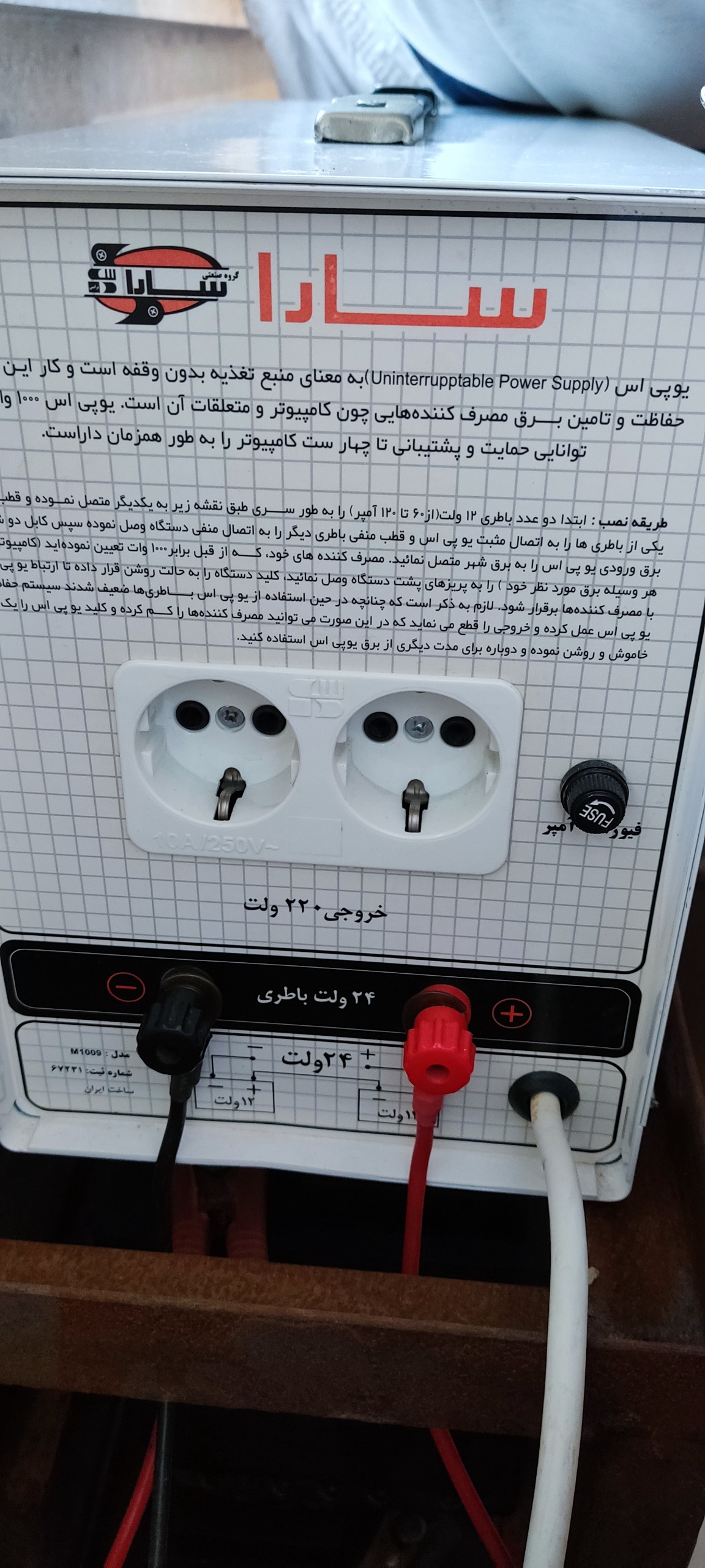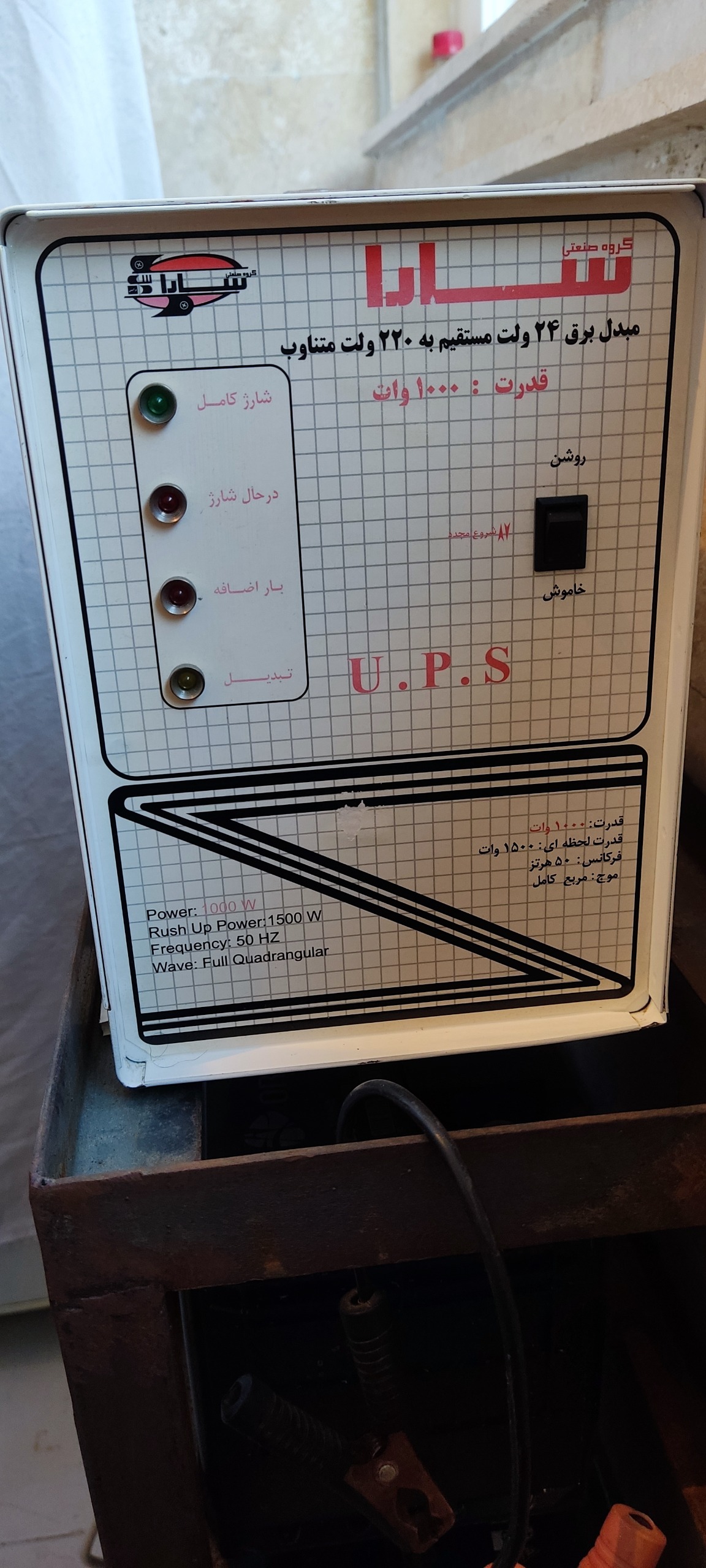 یک دستگاه یو پی اس برند سارا 1000 وات بسیار سالم و بسیار کم کارکرد و میتوان گفت در حد نو که با 2 عدد باتری 12 ولت خودرویی و یو پی اسی از 50 تا 100 آمپر قابل استفاده در روشنایی و سیستم صوتی و تصویری و لوازم غیر موتوری