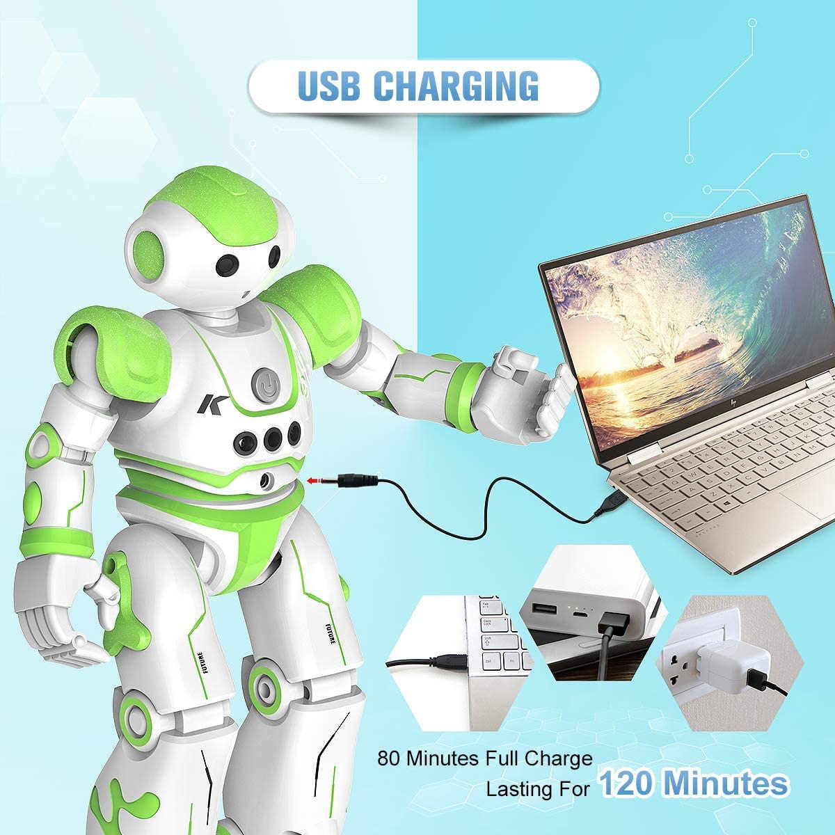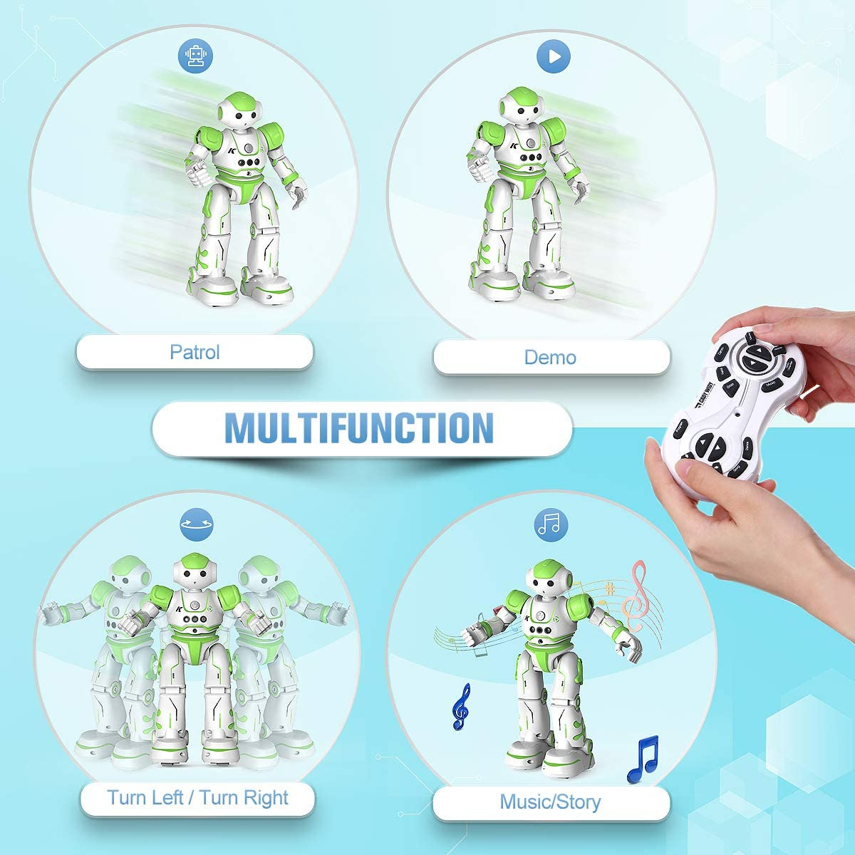 (ربات تعاملی) کنترل حرکات / برنامهریزی فکری / گشتزنی و اجتناب از مانع // آواز خواندن و رقصیدن // نمایش خودکار / زبان ربات / چراغهای LED عالی، میتواند با بچهها تعامل داشته باشد و سرگرمی بیشتری را به ارمغان بیاورد.