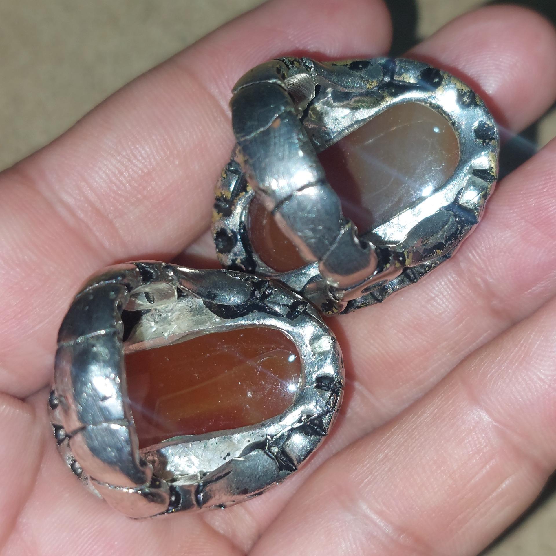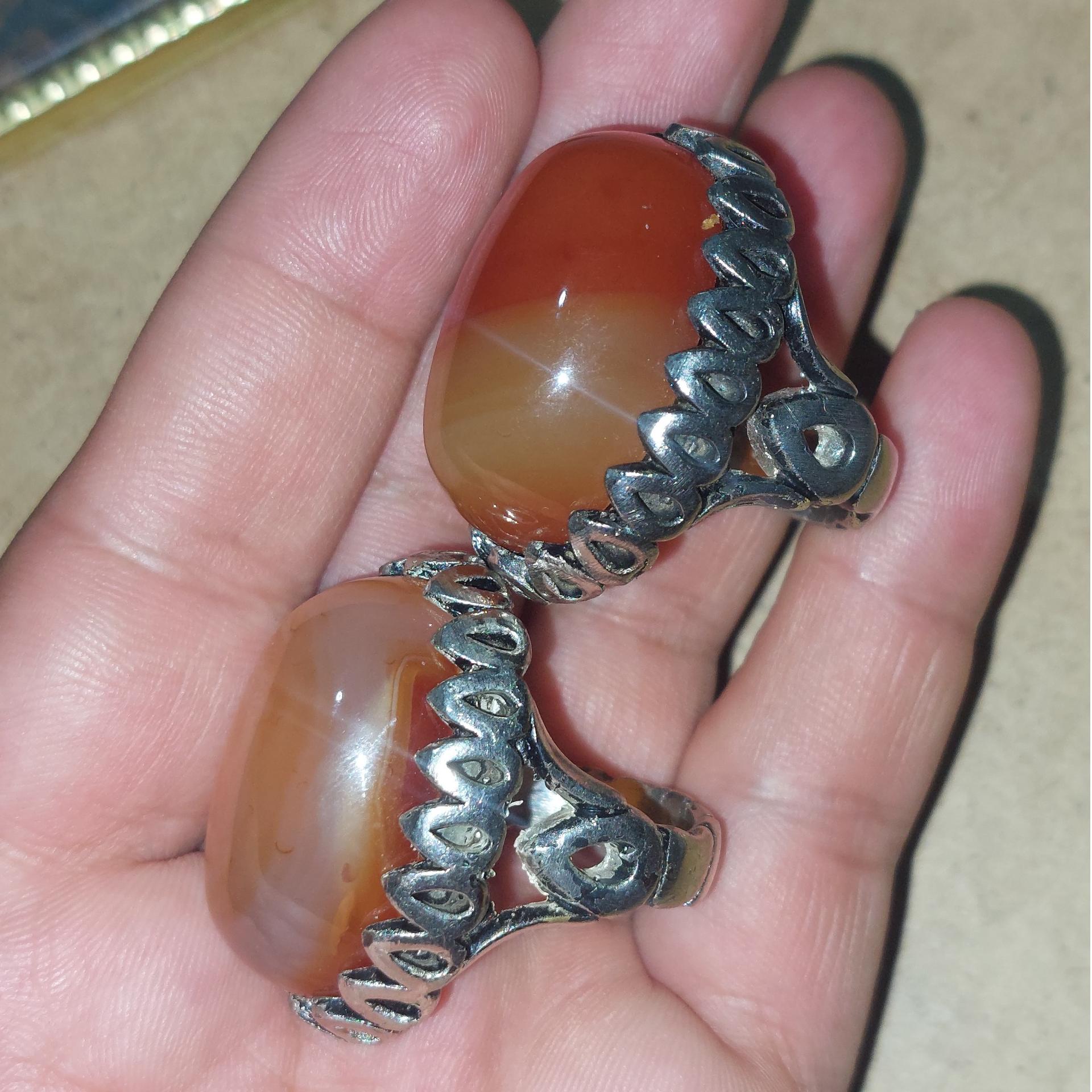 2 عدد انگشتر عقیق آبدار درشت وزن هر کدام 32 گرم ولی قالب بزرگ نو دسته برنجی با روکش رنگ سفید .