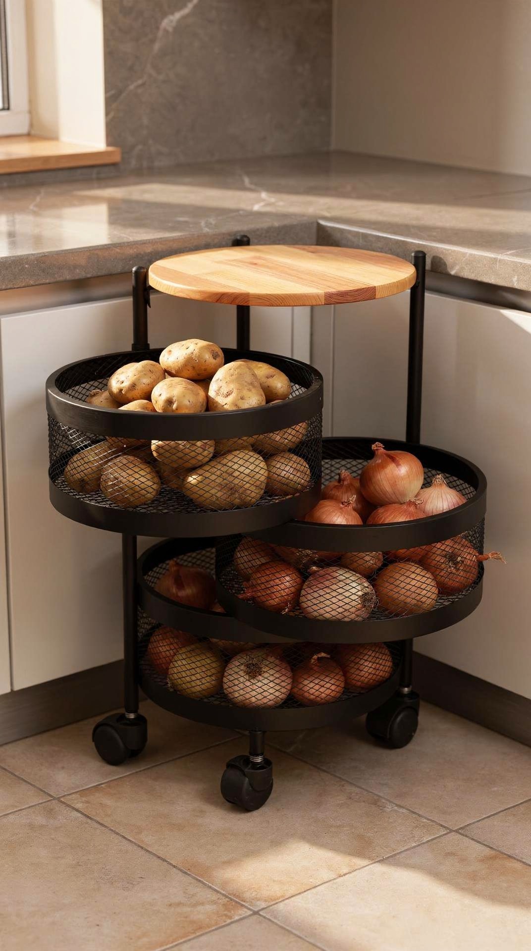 جاسیبزمینی و پیازی 3 طبقه چرخدار با رویه چوبی ضدآب
