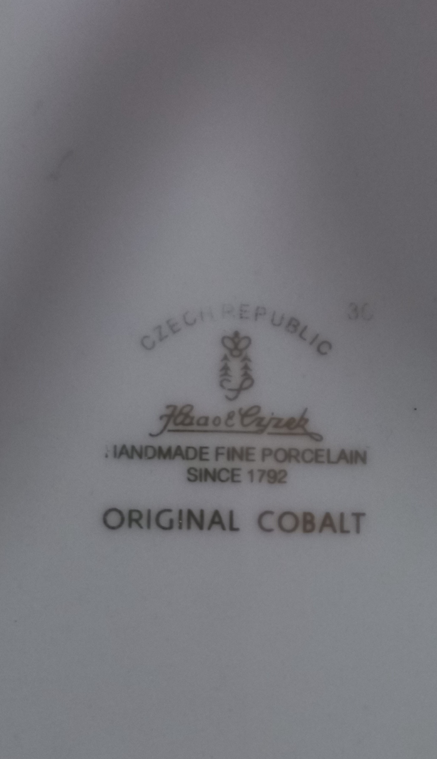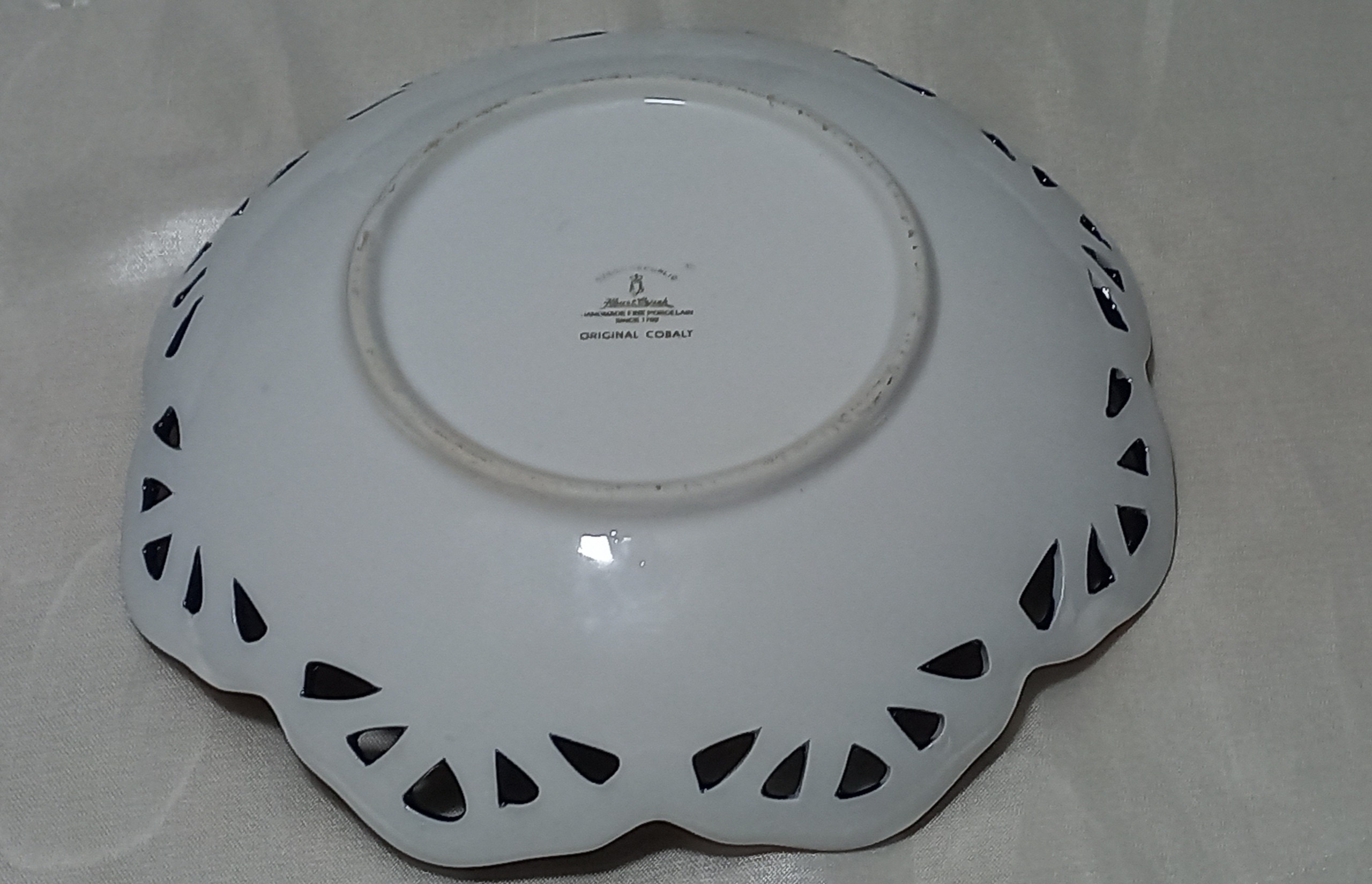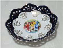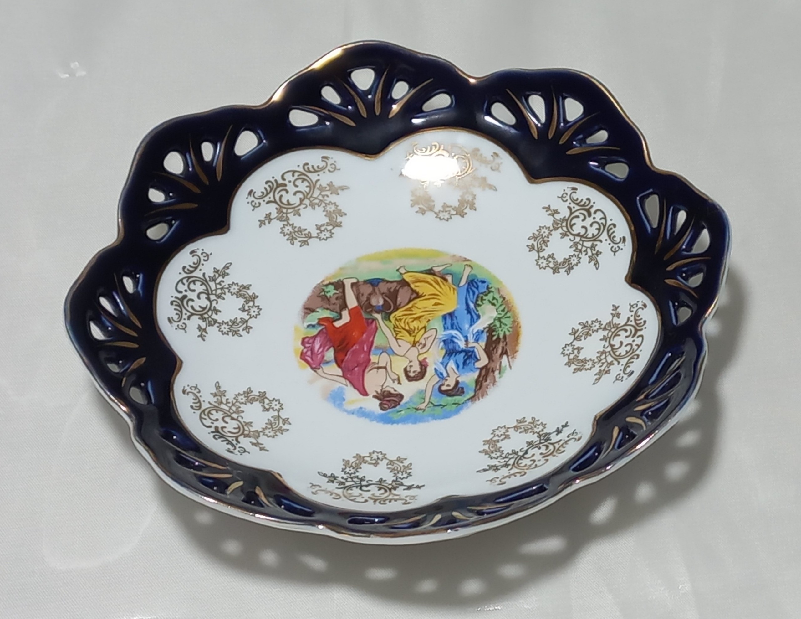 سبک: لبه مشبک با لعاب کبالت تیره و نقوش طلایی، تصویر مرکزی به سبک روکوکو/واتو (صحنههای کلاسیک اروپایی)