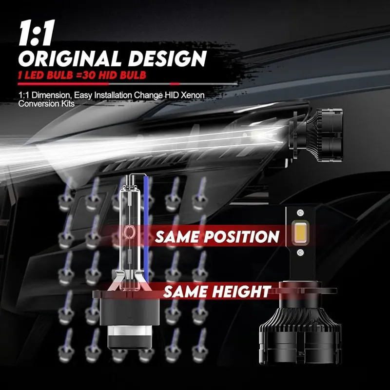 نصب آسان: طراحی جمع و جور همه در یک، طراحی 1:1 مشابه لامپ های زنون اصلی. PLUG-N-PLAY، بدون تغییر دیگر، LED d2s را با بالاست اصلی d2s HID وصل کنید. بدون درایور خارجی، صرفهجویی در فضای مسکن، نصب آسان در 10 دقیقه. درایور داخلی هوشمند، EMC آماده، بدون تداخل رادیویی.