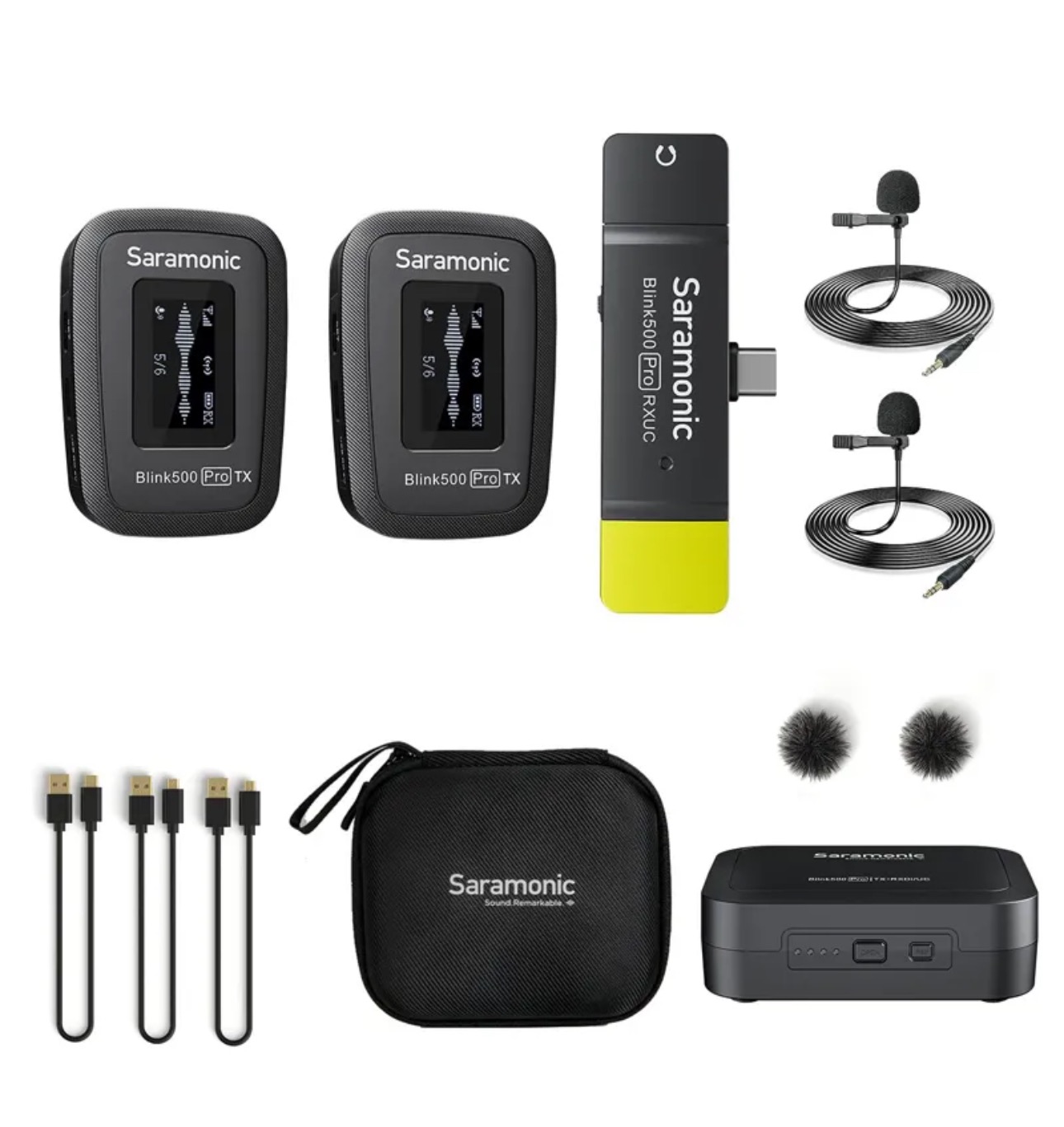 میکروفون بیسیم استریو دو کاناله Saramonic Blink500 Pro B6 Mini با جعبه شارژ، صفحه نمایش OLED و خروجی هدفون 3.5 میلیمتری با گیرنده رابط USB-C برای گوشیهای اندرویدی نوع C MacBook PC