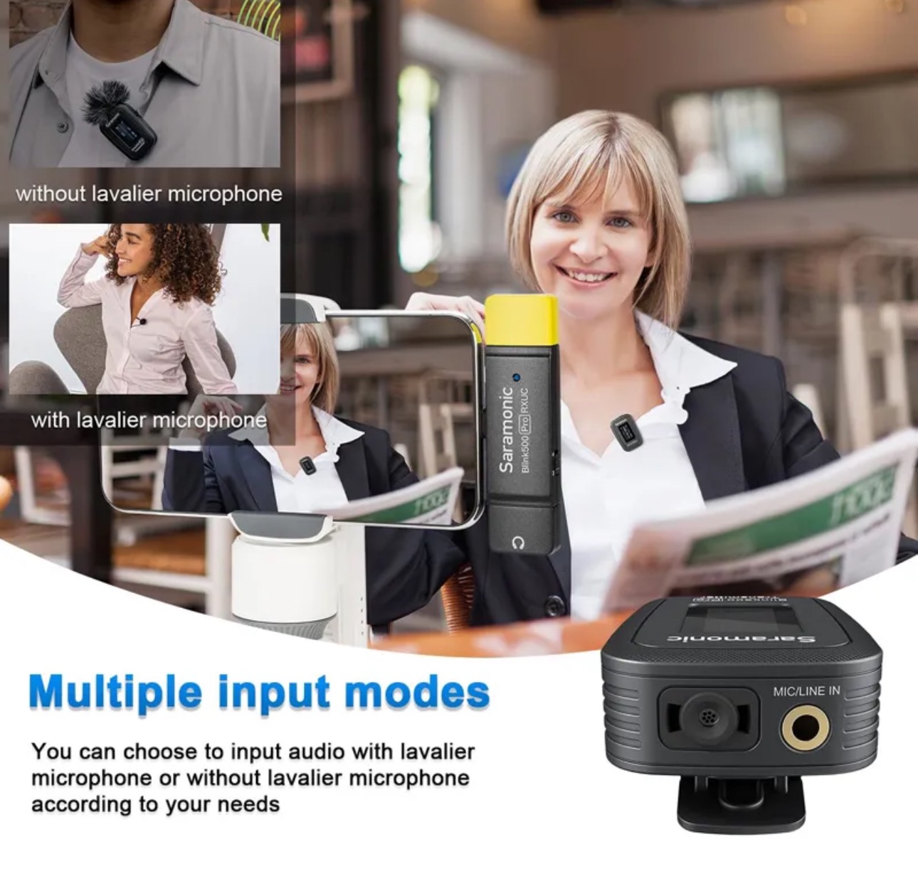 برجسته ترین ها سارامونیک Blink500 Pro B6 یک سیستم میکروفون بیسیم فوقالعاده سبک، بسیار فشرده و با کاربری آسان است و صدایی استثنایی و با کیفیت پخش را برای دوربینهای DSLR، دوربینهای بدون آینه و ویدیو، دستگاههای موبایل و غیره ارائه میکند. کیس شارژ ارائه شده به شما امکان می دهد دستگاه ها را در هر مکانی که نیاز دارید شارژ کنید، آنها 8 ساعت زمان ضبط را با یک بار شارژ ارائه می دهند، کیس را می توان از طریق پورت Type-C DC 5v شارژ کرد. خروجی هدفون 3.5 میلی متری، سوئیچ M/S قابل انتخاب، شارژ سریع، ویژگی های صفحه نمایش OLED باعث می شود Blink500 Pro نیازهای مختلف ضبط را برآورده کند.گیرنده RXUC دارای خروجی USB-C است و برای دستگاه های دارای پورت USB-C، از جمله گوشی های هوشمند و تبلت های اندرویدی طراحی شده است. فرستنده گیره دار دارای میکروفون داخلی با صدای عالی است و به اندازه کافی کوچک و سبک است که به پیراهن و لباس متصل می شود، یا می توانید از آن به عنوان یک فرستنده کمربند سنتی با میکروفون SR-M1 استفاده کنید. برای کار کردن به هیچ دانش فنی در مورد صدا نیاز نیست. سیستم Blink500 Pro در طیف بدون تداخل 2.4 گیگاهرتز کار میکند و به طور خودکار به کانالهای آزاد میرود تا از نویز استاتیک و افت صدا جلوگیری کند.