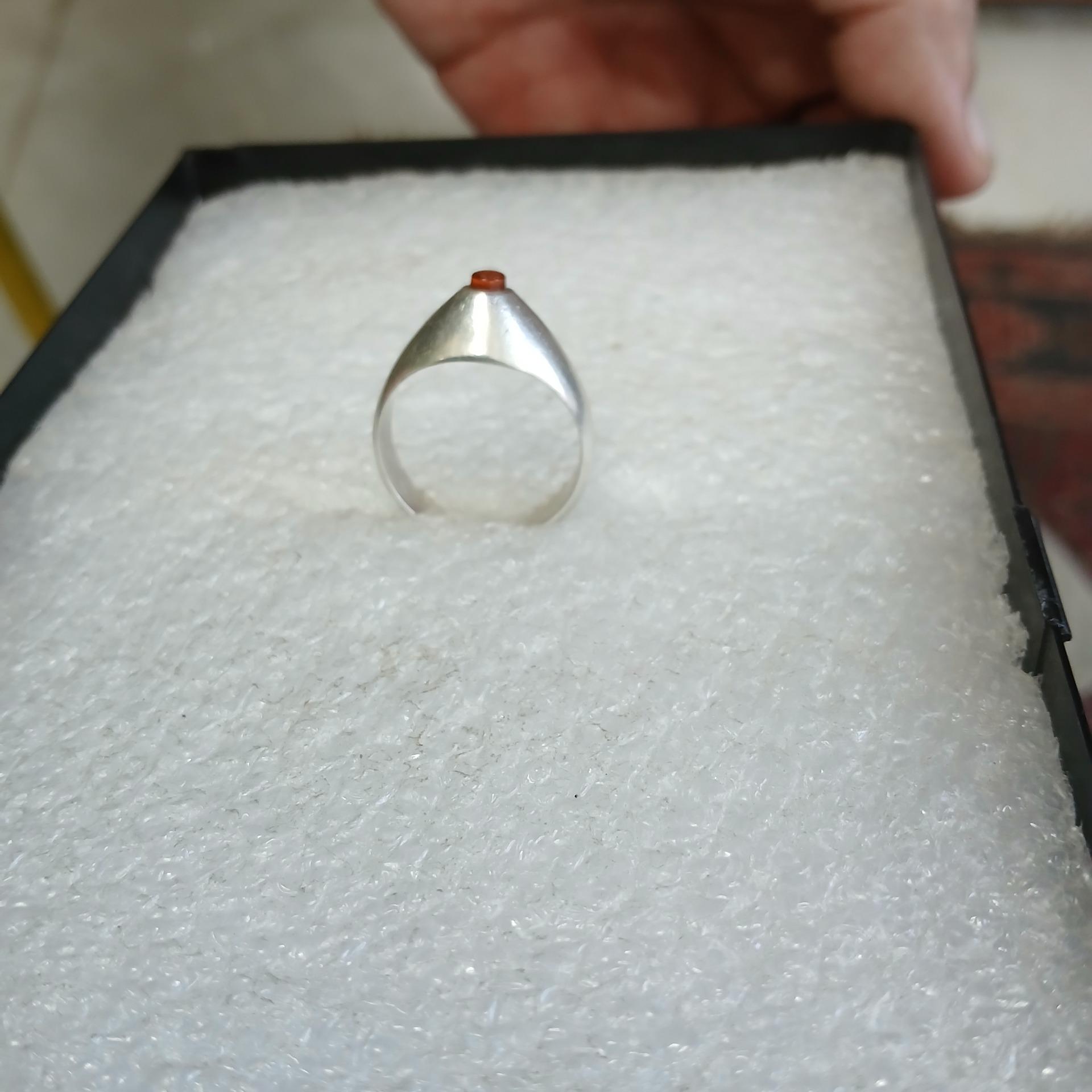 انگشتر نقره خط ایه من یتق الله بطور کامل بصورت مینیاتوری روی سنگ عقیق آن حکاکی شده ،بسیار عجیب و محیر العقول ،با ذره بین قوی خط منحصر و زیبای آن خوانده می شود ،وزن 6.32 گرم ،رکاب فیلی اسد اله ،اگر در خرید ابهام و تردید دارید از خرید خودداری نمایید ،